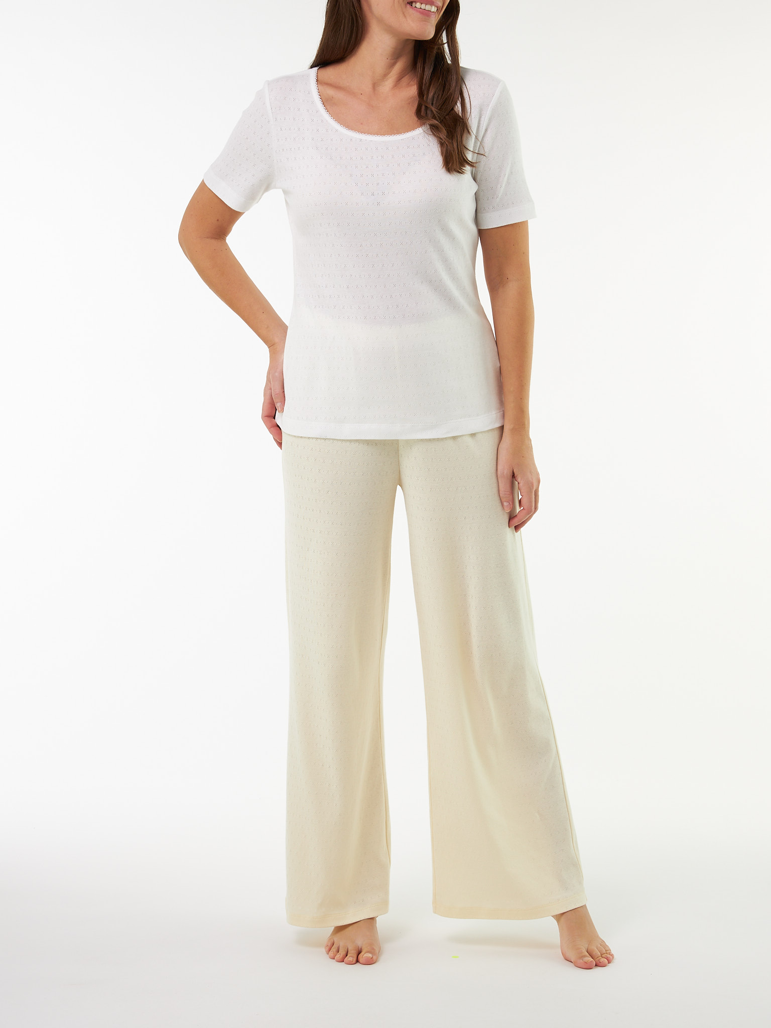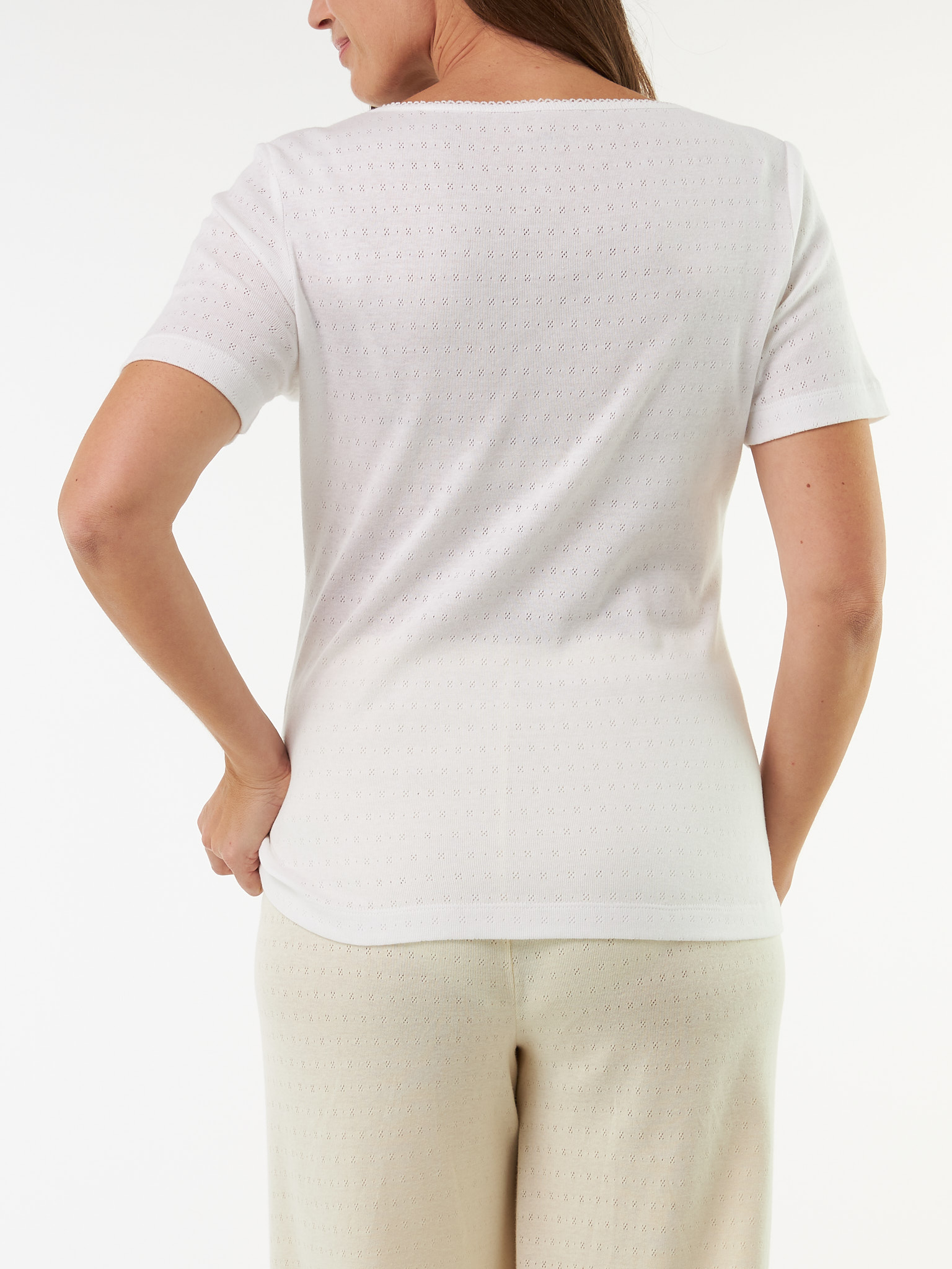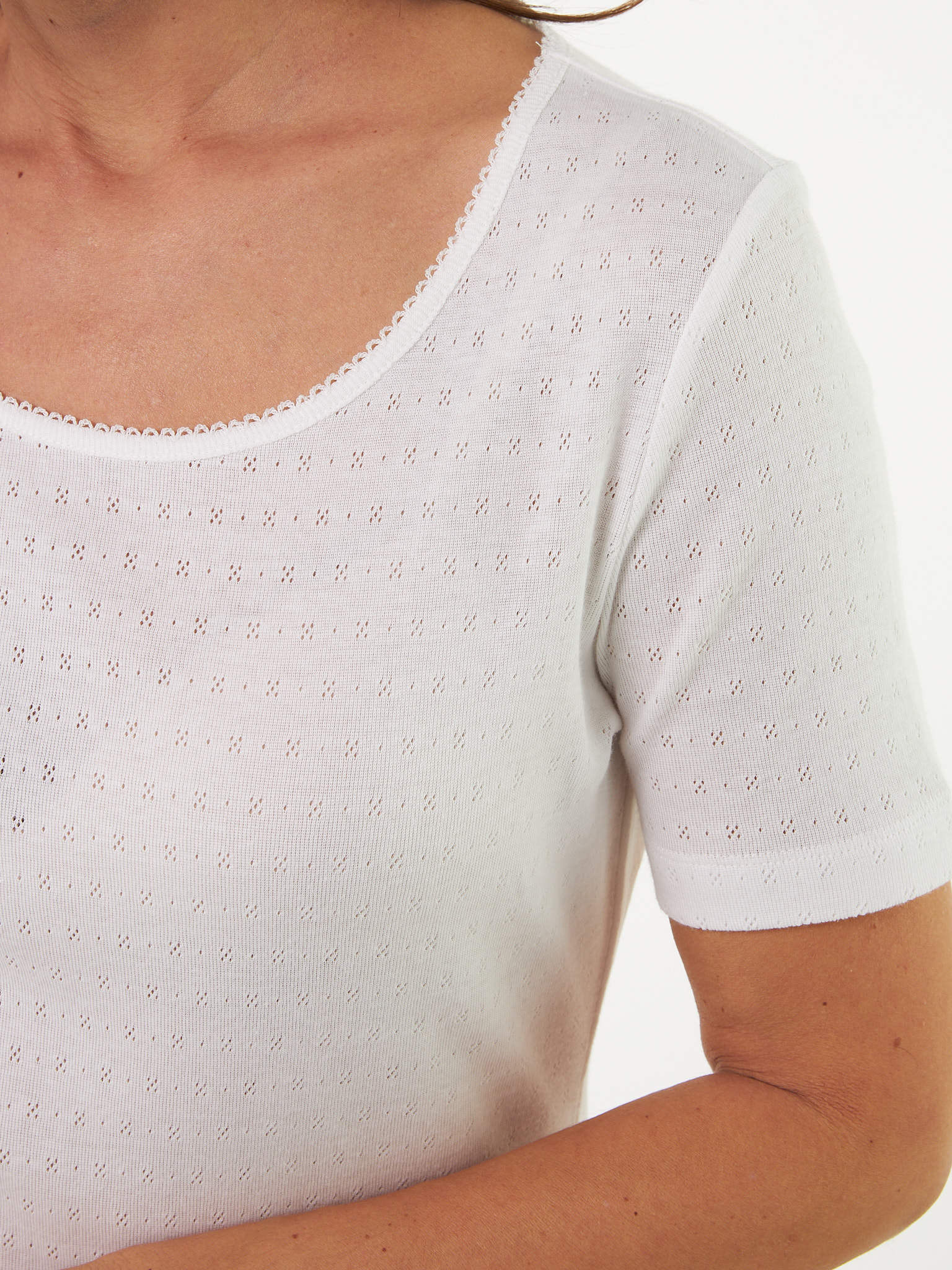 Garantiert ein Lieblingsstück: klassisches Kurzarm-Shirt aus hochwertiger, weicher Baumwolle. Das Modell mit der feinen Ajour-Dessinierung überzeugt mit seiner zarten Optik, dem weichen Griff und der hochwertigen Fertigung – garantiert ökologisch & sozial fair! Abgerundet wird das figurumspielende Shirt mit zarter Crochet-Kante entlang des Halsausschnitts.