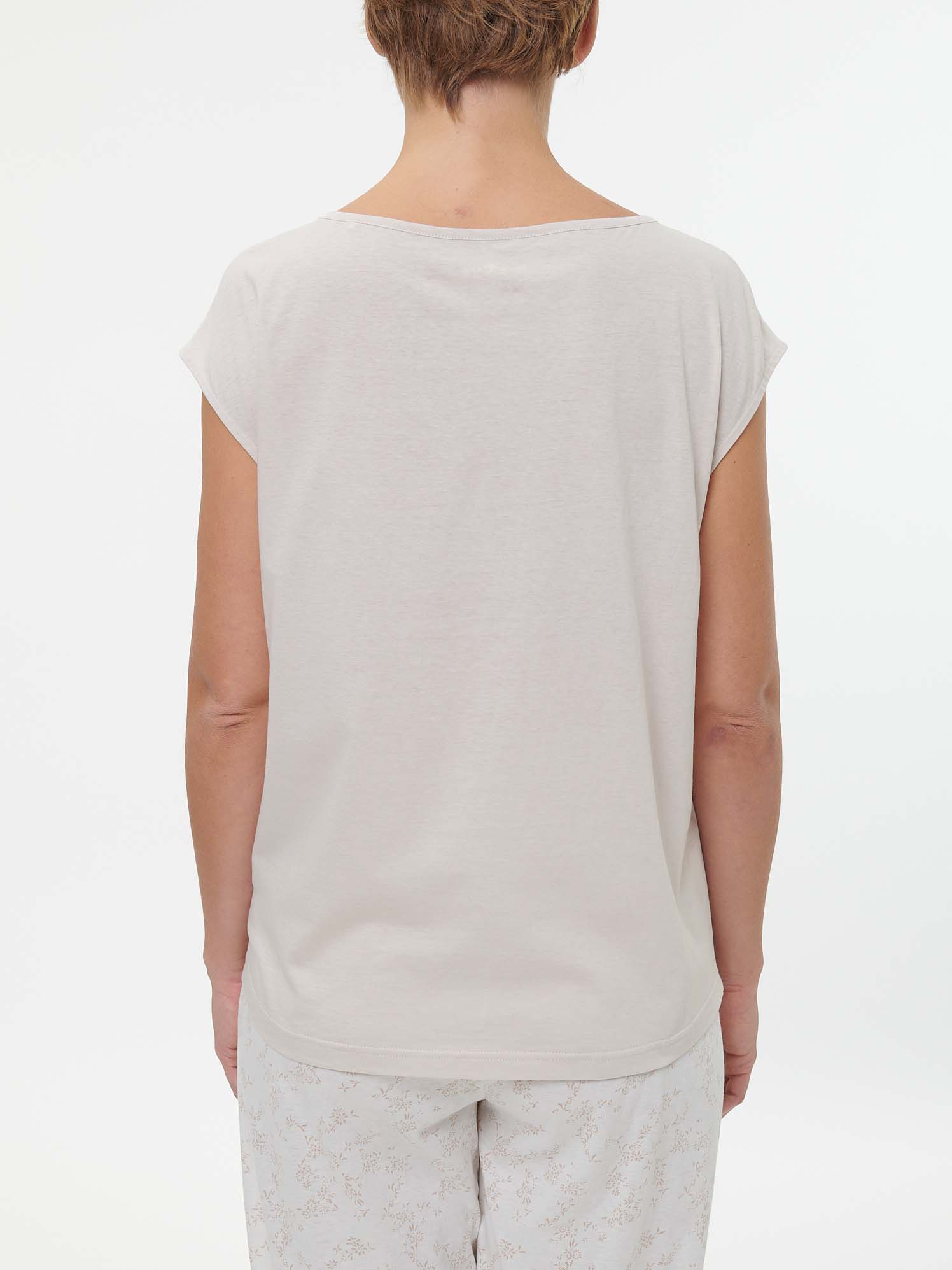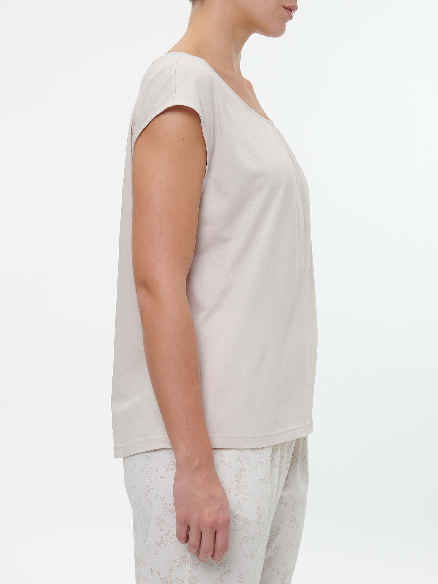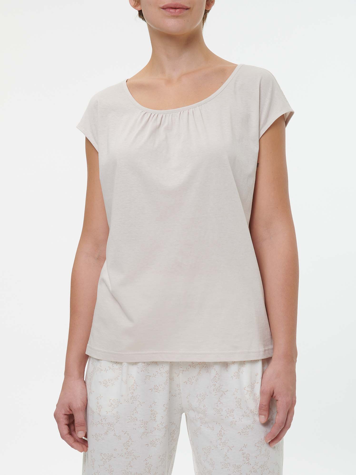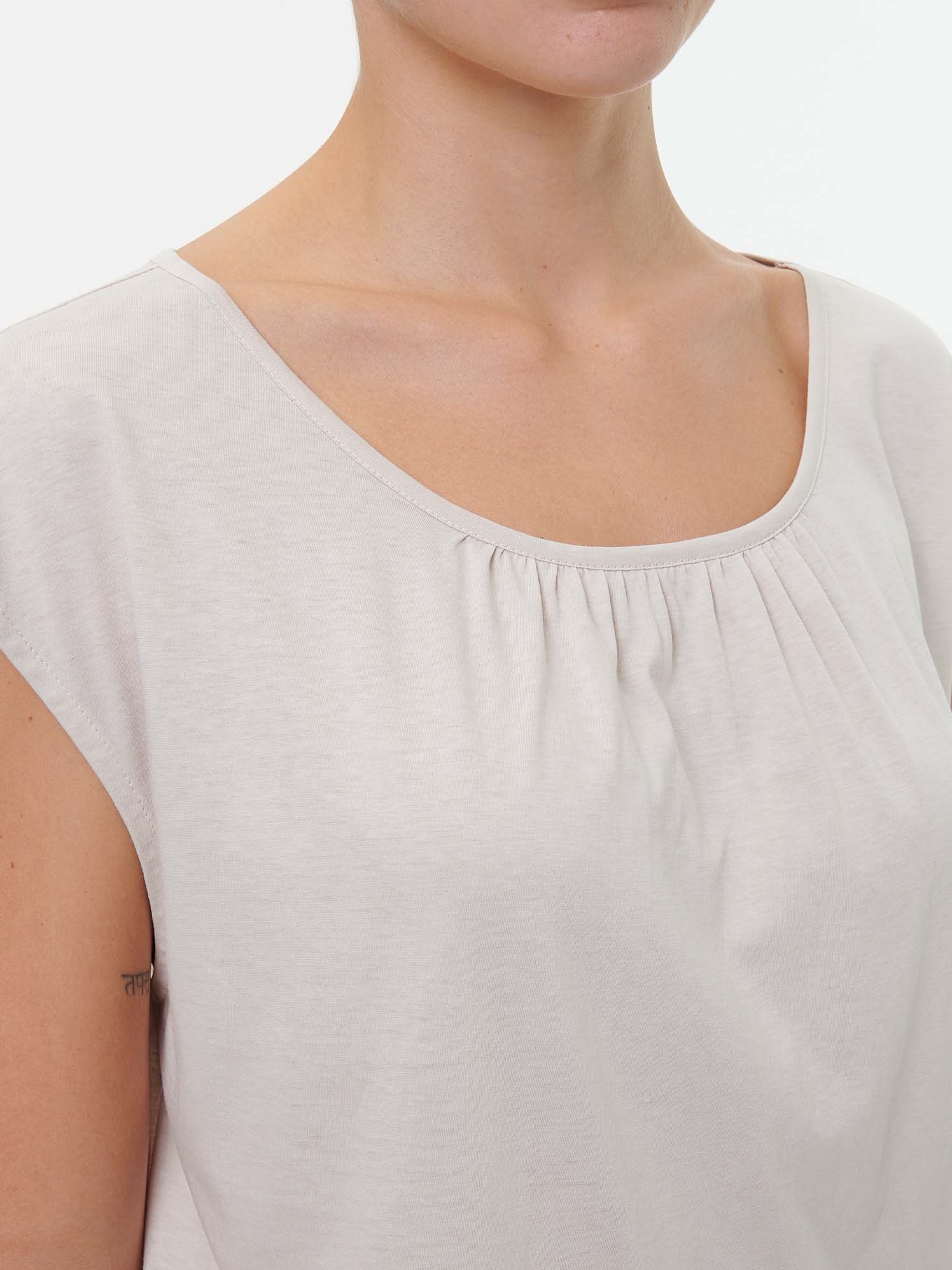 Top aus feiner Single-Jersey-Qualität: Die leicht überschnittene Schulterpartie verleiht dem Modell eine entspannte Note, während der geraffte Rundhalsausschnitt in Kombination mit den schmalen Einfassungen an Hals- und Armausschnitt für eine feminine Silhouette sorgt. Ein vielseitiges Basic, welches mit einem lockeren Schnitt und einer angenehm-weichen Qualität überzeugt.