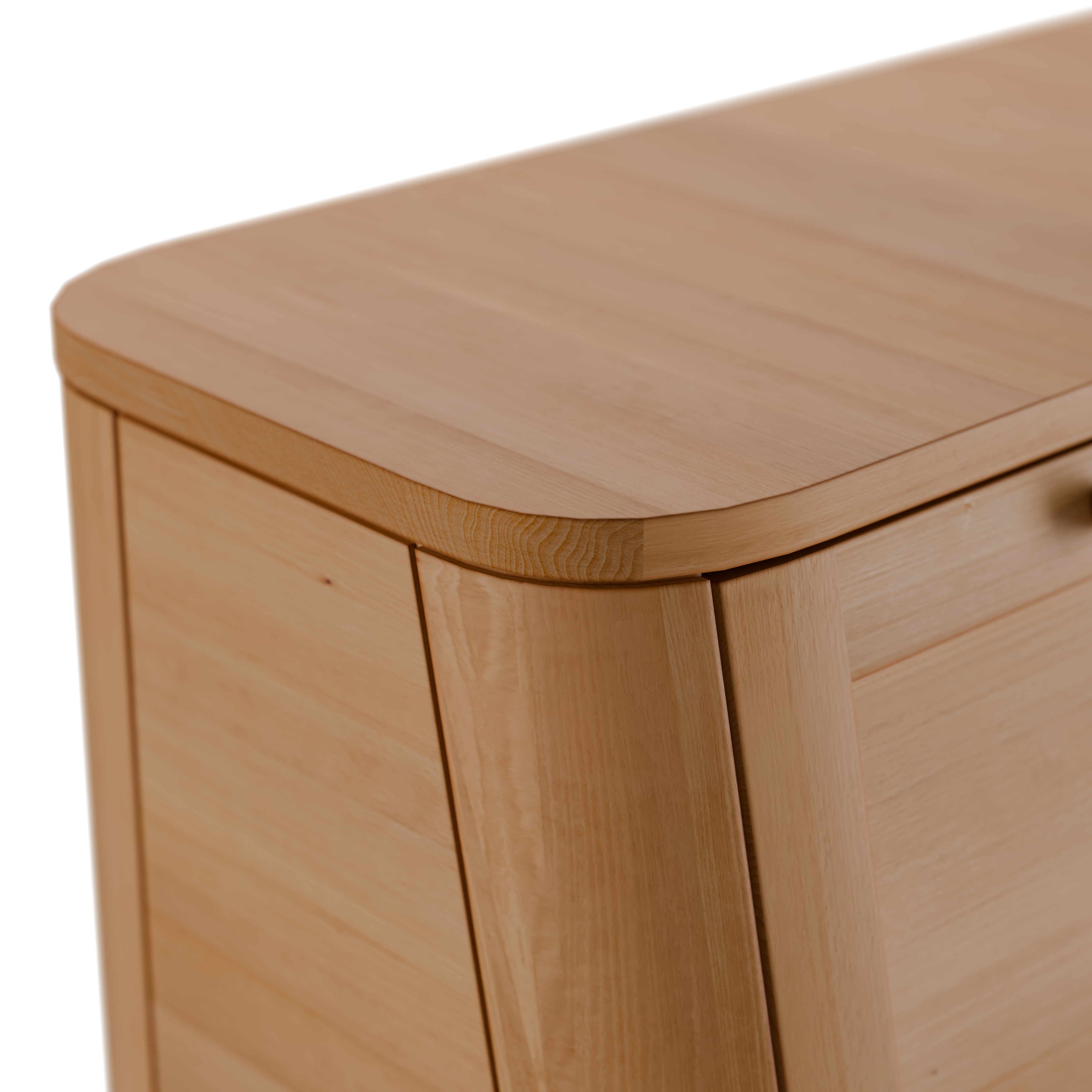 Für den Schrank verarbeiten wir hochqualitatives Holz aus mitteleuropäischen, nachhaltig bewirtschafteten Wäldern. Metallfreie, wieder lösbare Holzverbindungen: "Spannschlosszapfen". Die Holzoberfläche ist von Hand mit natürlichem, lösemittelfreiem Pflegeöl eingelassen.