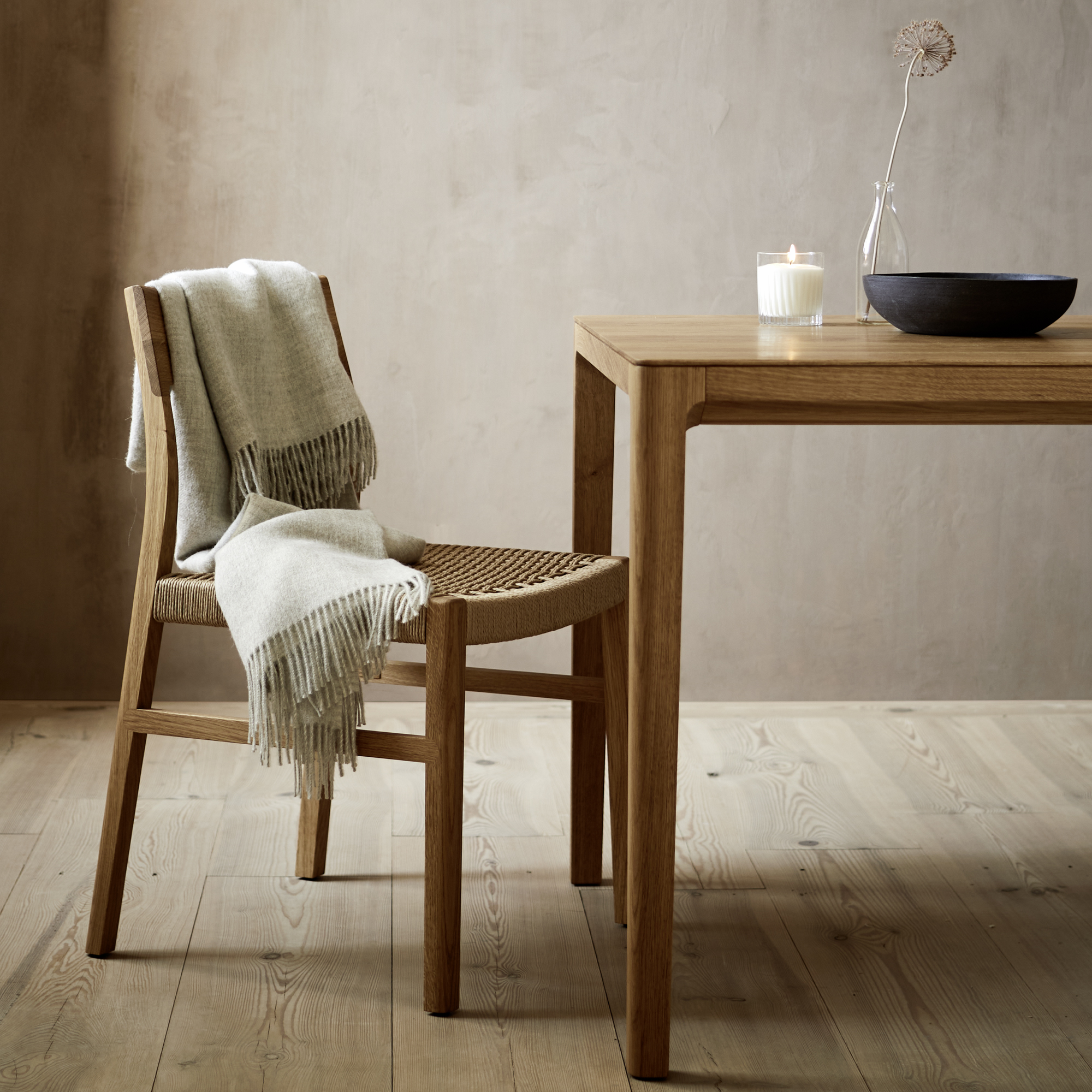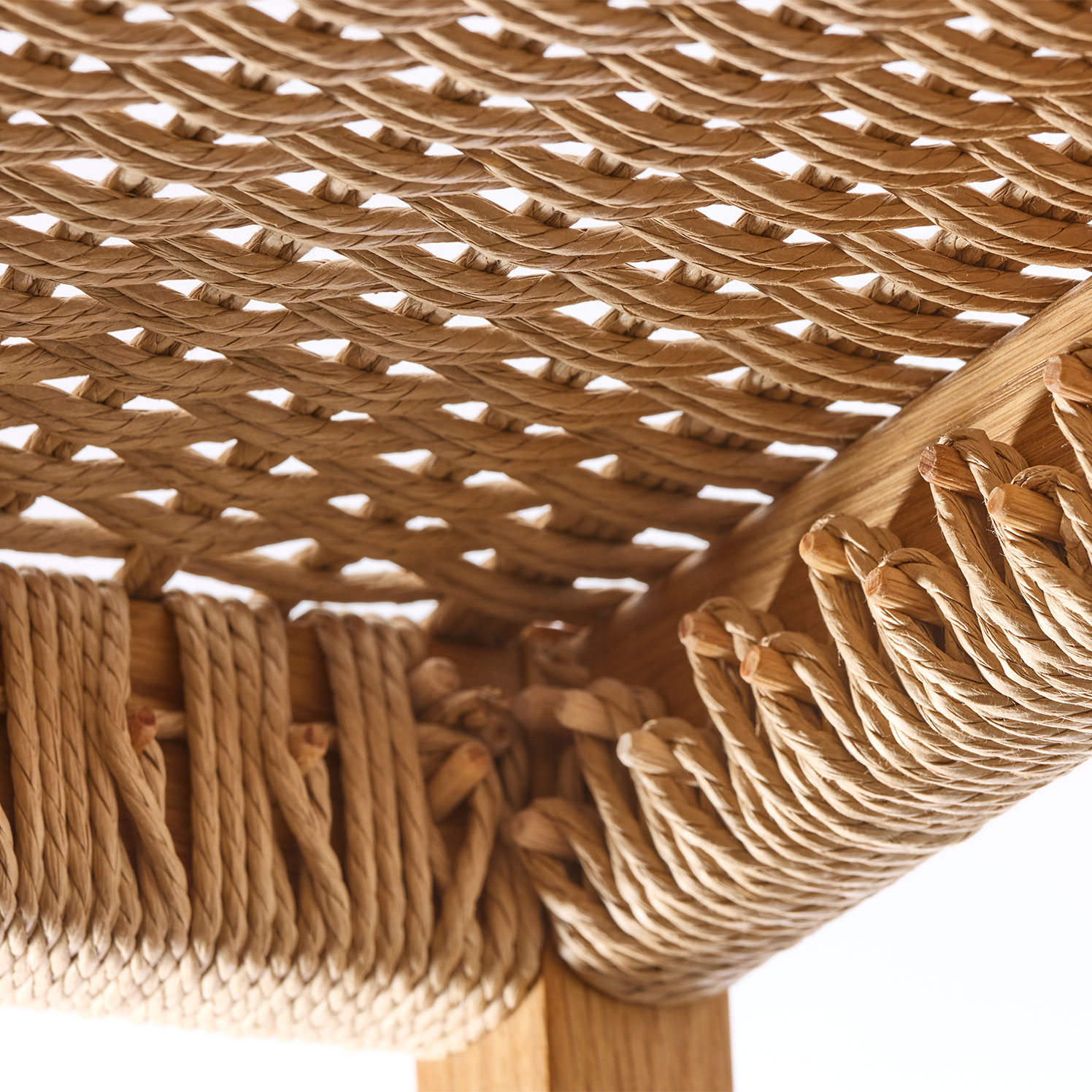 Für diese Modellvariante von Karim verarbeiten wir "Danish Cord", eine in den 1940er-Jahren in Dänemark speziell für geflochtene Sitzflächen entwickelte, in sich gedrehte, extrem reißfeste Papierschnur. Etwa 120 m davon werden über den Sitzrahmen und an dessen Innenseiten montierte Holzdübel verflochten: etwa eineinhalb bis zwei Stunden sorgfältige, konzentrierte Handarbeit!