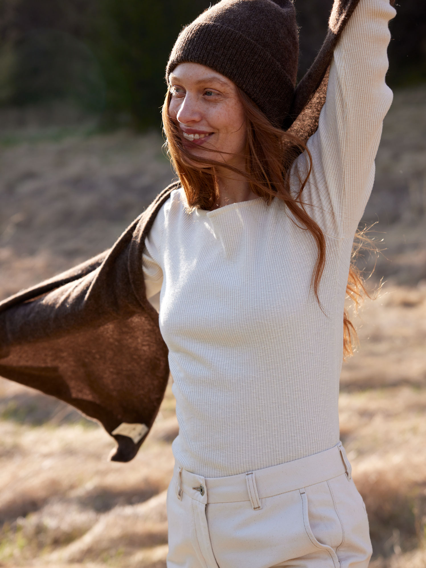 Ein schönes Stück Natur, welches wir nur zu gern tragen. Dieses Kleidungsstück entsteht aus wertvoller Alpakawolle und wird in größter ökologischer Sorgfalt bei unserem Partnerbetrieb gefertigt. Die gesamte Wertschöpfung bleibt im Land der Rohfaser – fair gegenüber Mensch, Tier und Natur. Um die Langlebigkeit des Naturproduktes zu erhalten, empfehlen wir einen sorgsamen und wertschätzenden Umgang im alltäglichen Gebrauch.