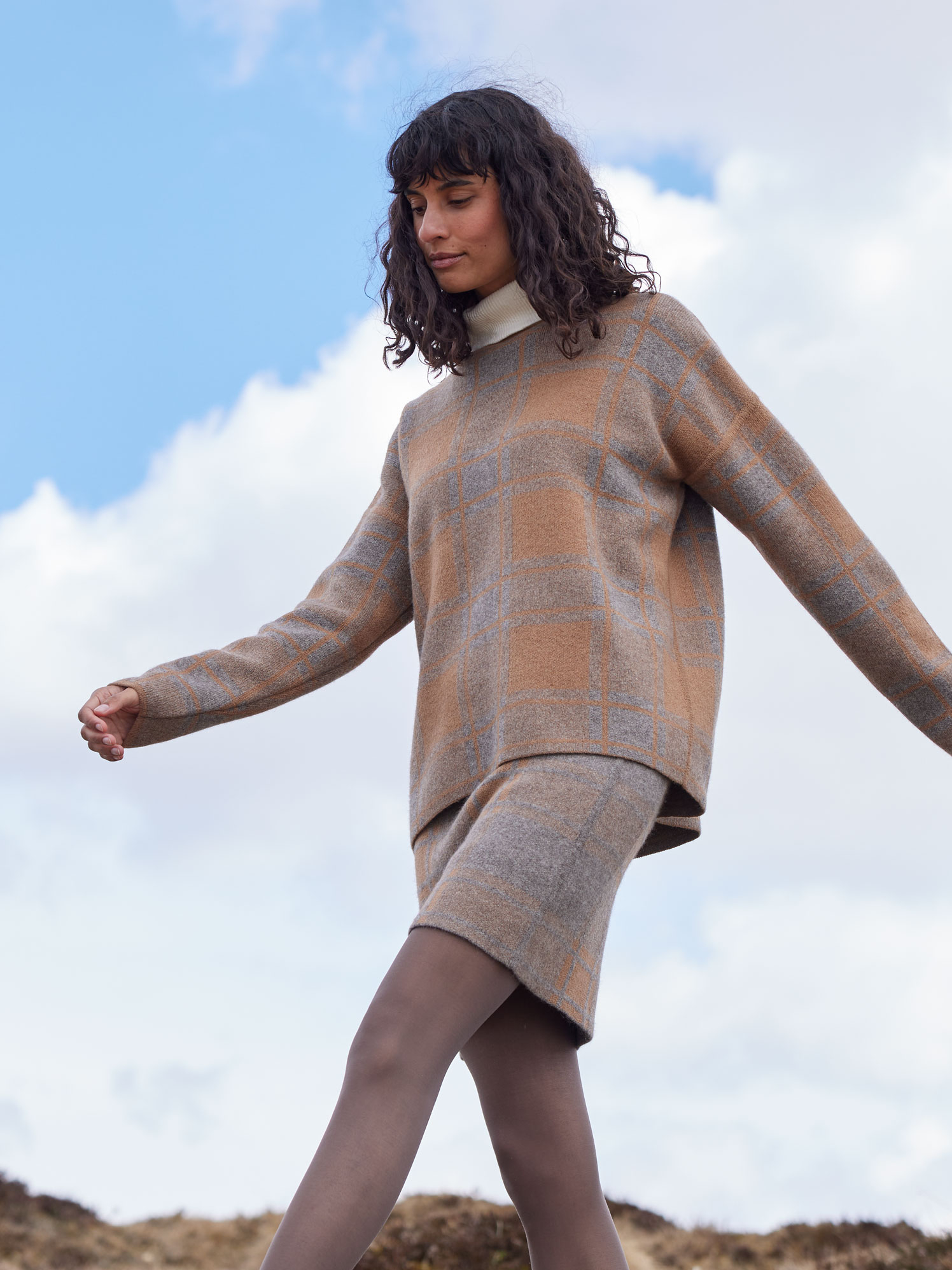 Dieser edle Strickrock vereint zwei der kostbarsten Naturfasern: ungefärbte Yakwolle und feines Kamelhaar. Die Kombination sorgt für ein besonders weiches, temperaturausgleichendes Tragegefühl mit natürlicher Eleganz. In klassischer Jacquard-Qualität gefertigt, zeigt sich das dezente Karo-Dessin als stilvolles Understatement – zeitlos, klar und unaufgeregt. Der legere Schnitt mit weichem Bund umspielt die Silhouette mühelos. Auch zum Wenden möglich.