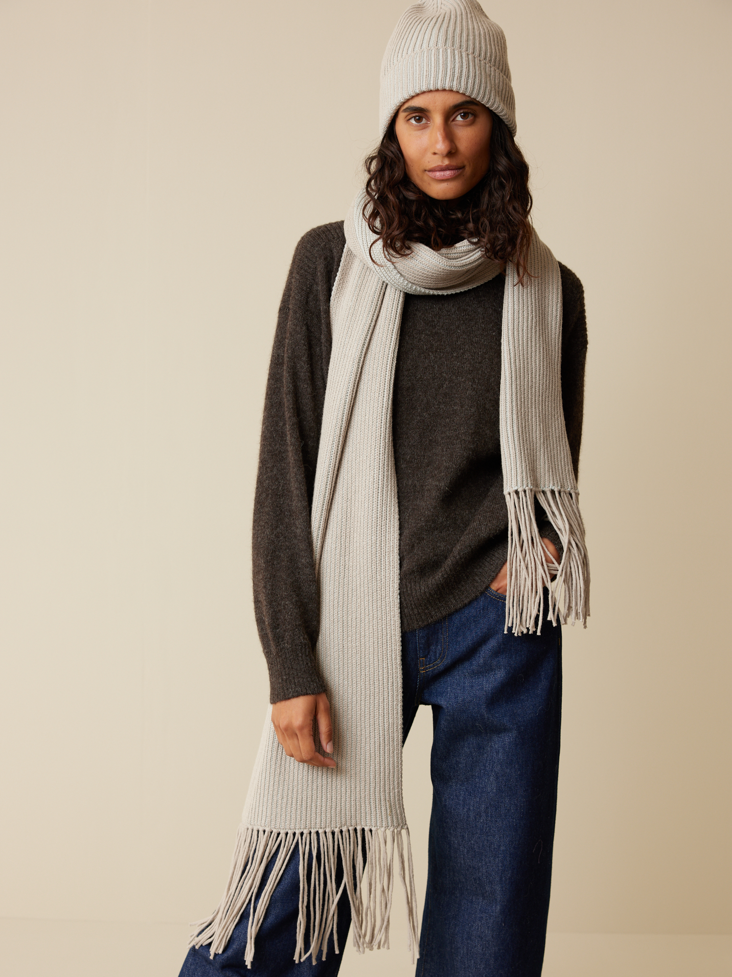 Für jedes Outfit die ideale Abrundung: Schal aus weicher Baumwolle und hochwertiger Alpakawolle. Das Naturmaterial verspricht ein sanftes Gefühl auf der Haut und wärmt ausgezeichnet. Die breite Ripp-Struktur in Kombination mit einem zurückhaltendem Farbton aus einem zweifarbig gezwirnten Garn ergibt eine zeitlose Optik, die auch in vielen Jahren noch zu jedem Outfit kombinierbar ist.