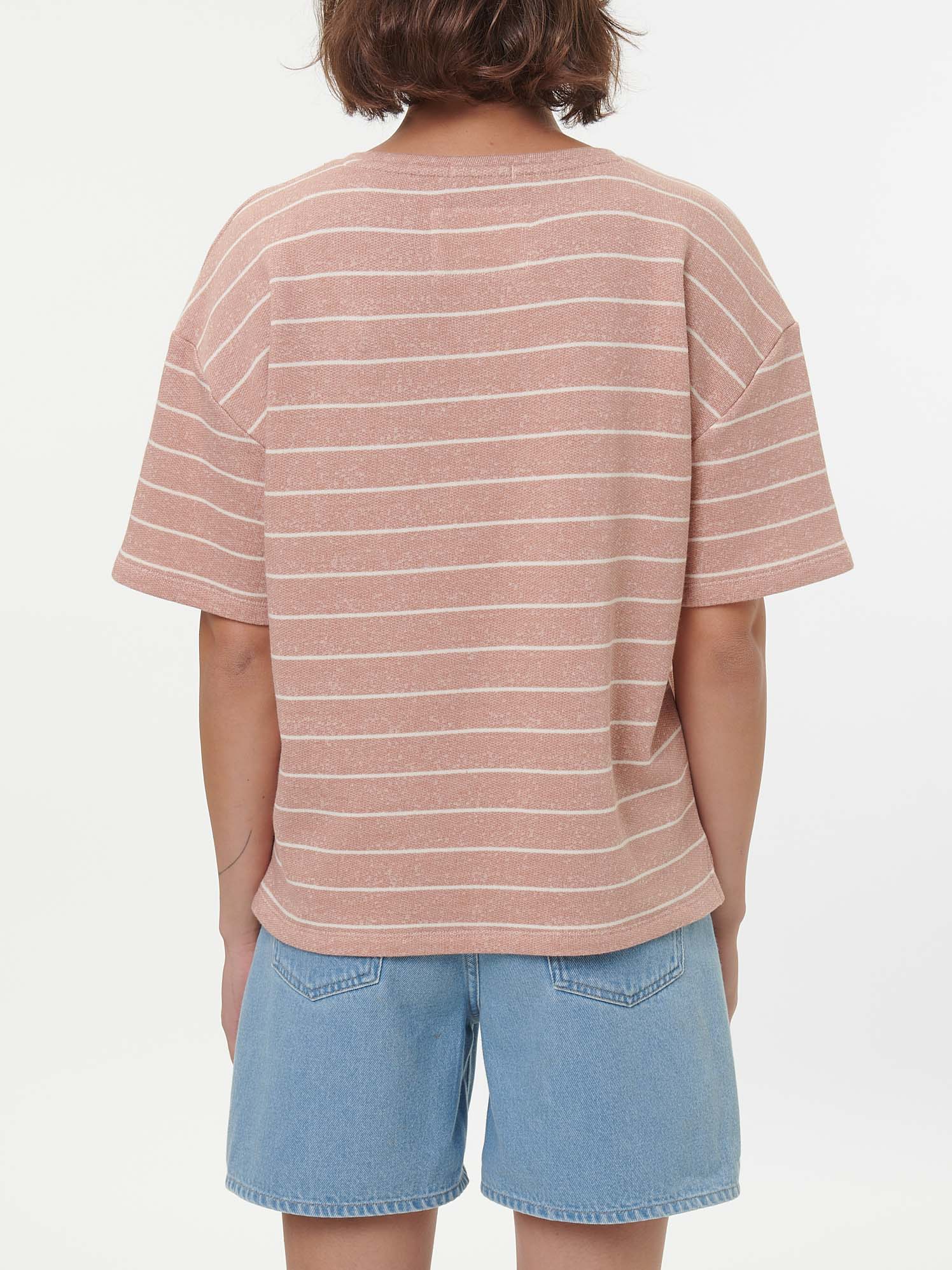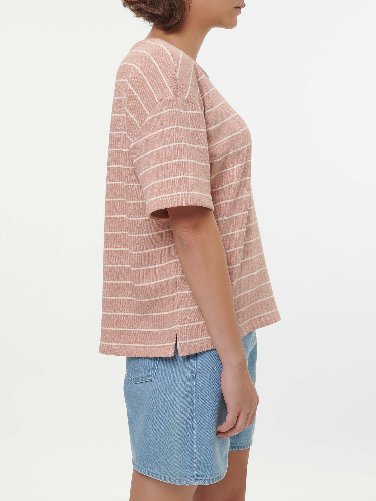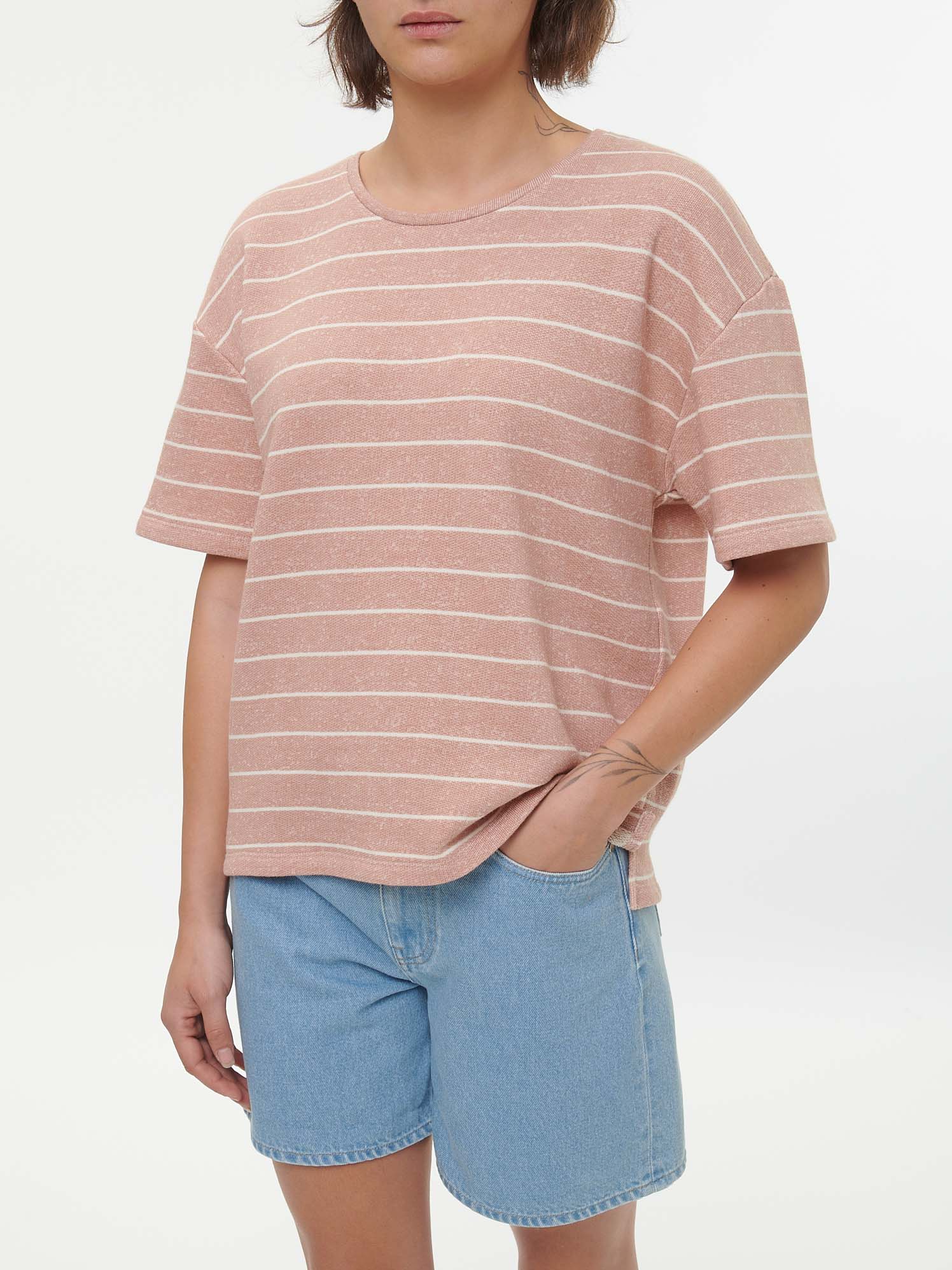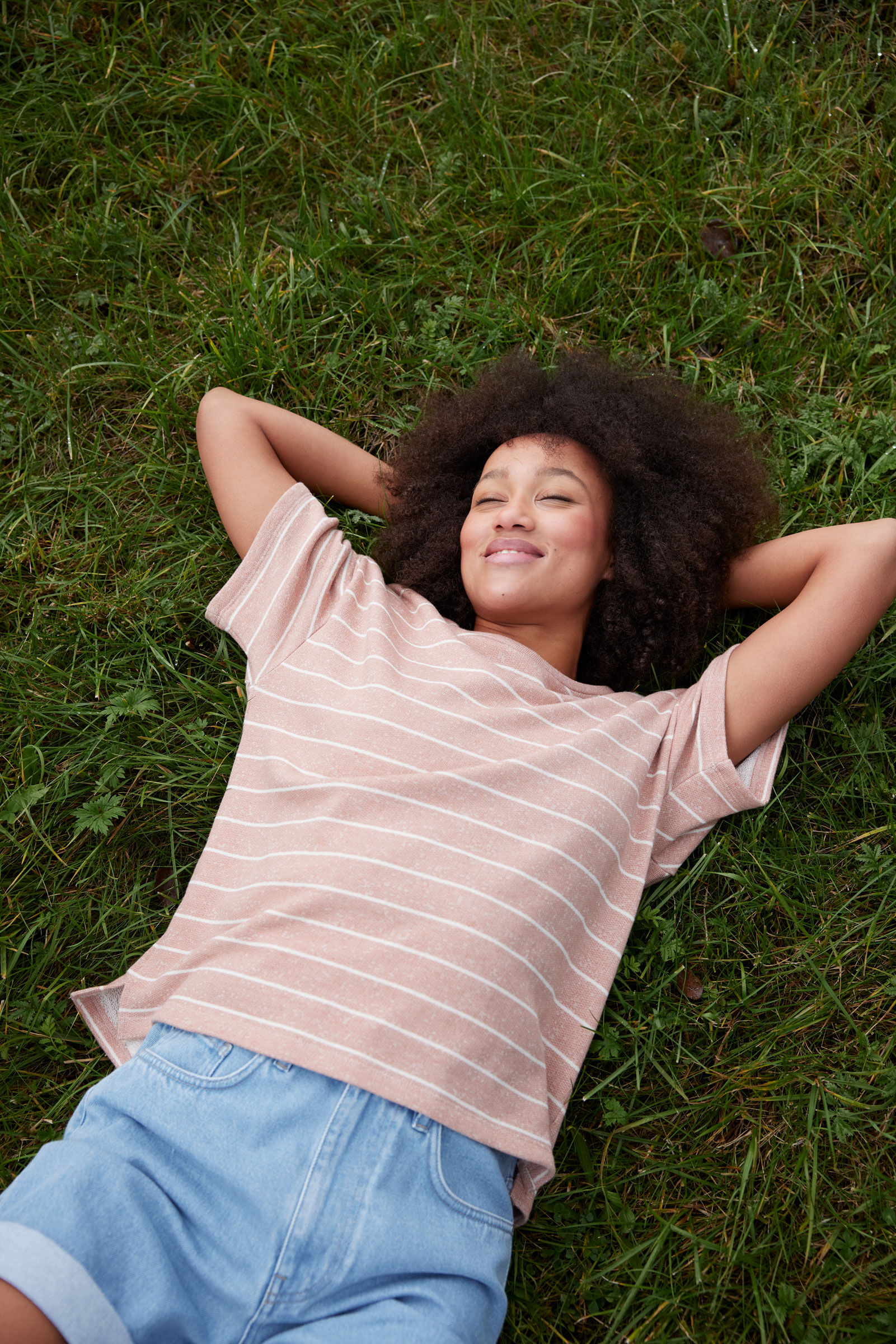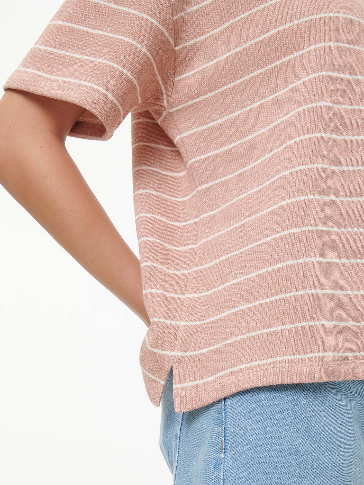 Lässig geschnittenes Kurzarm-Sweatshirt mit Ringel-Dessinierung in dezenter Melange-Optik. Der Rundhalsausschnitt und die kurzen Ärmel unterstreichen den entspannten Boxy-Schnitt, während die weiche French-Terry-Qualität für angenehmen Tragekomfort sorgt. Weitere Details: praktische Aufhängung im Innenteil.