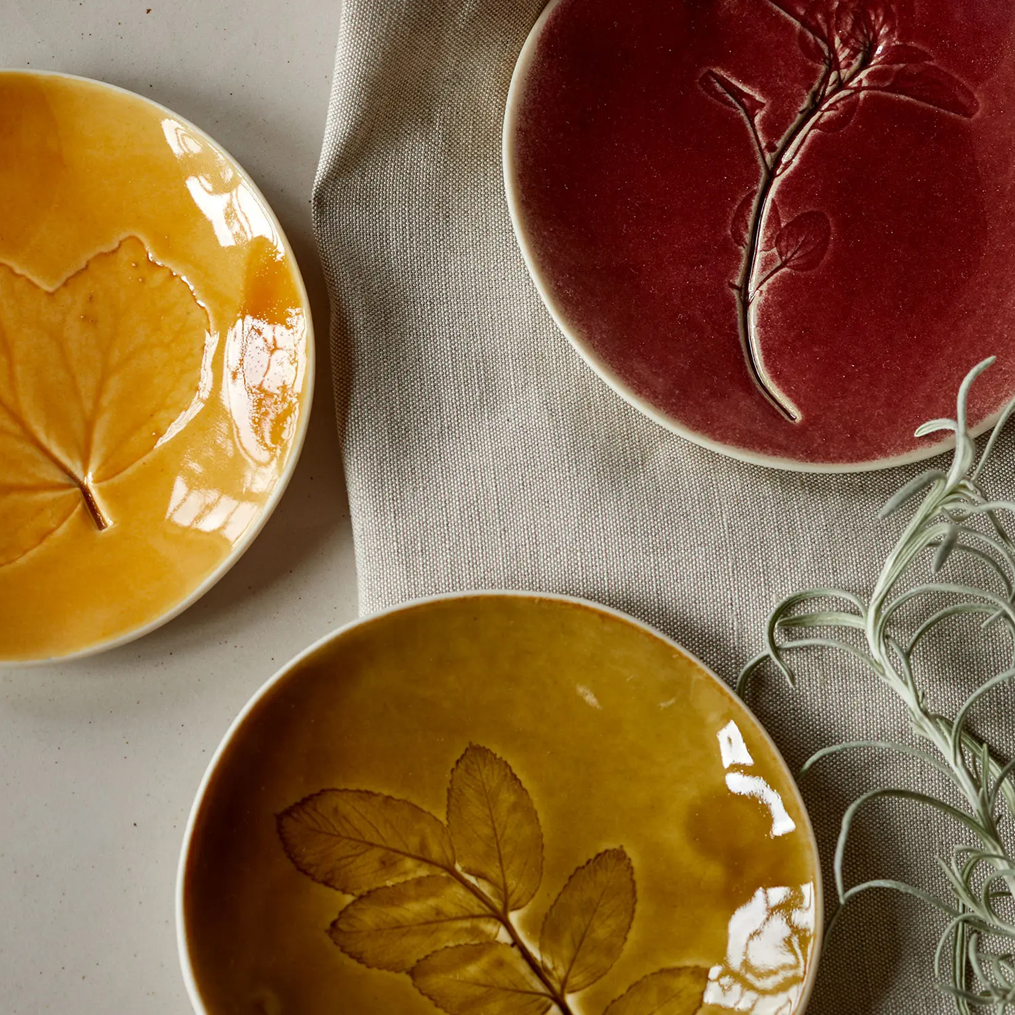 Alle Teile werden dann einmal gebrannt, als einzigartige Unikate. Von Blättern und Blüten bleibt das Muster. Auf jedes der Tellerchen kommt dann noch eine bestimmte Glasur, sie verstärkt den individuellen Charakter zusätzlich und wird ebenfalls von Louise Browne selbst angesetzt. Mit mehr Liebe, Sorgfalt und Handwerkskunst kann man so ein Tellerchen gar nicht herstellen!
