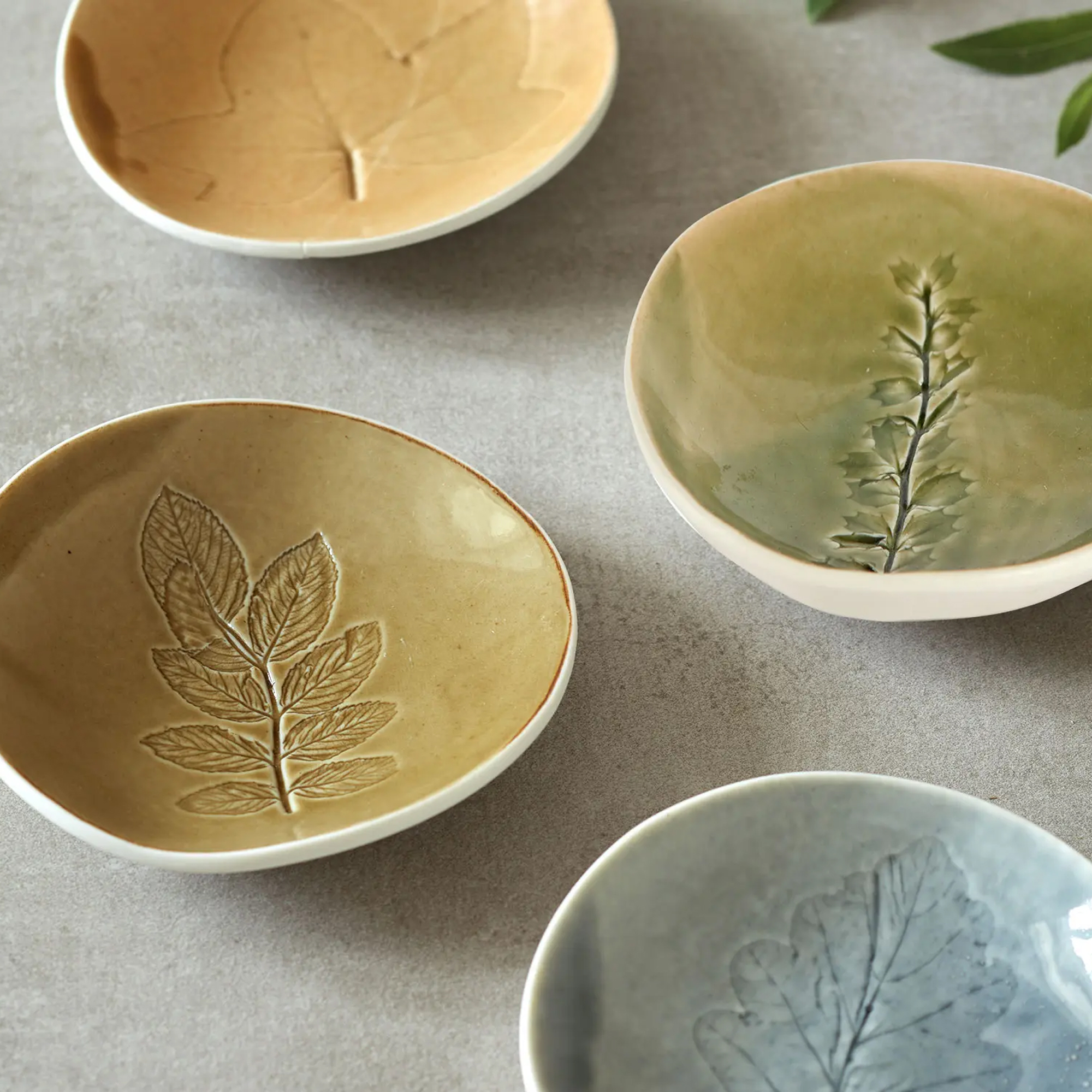 Alle Teile werden dann einmal gebrannt, als einzigartige Unikate. Von Blättern und Blüten bleibt das Muster. Auf jedes der Tellerchen kommt dann noch eine bestimmte Glasur, sie verstärkt den individuellen Charakter zusätzlich und wird ebenfalls von Louise Browne selbst angesetzt. Mit mehr Liebe, Sorgfalt und Handwerkskunst kann man so ein Tellerchen gar nicht herstellen!