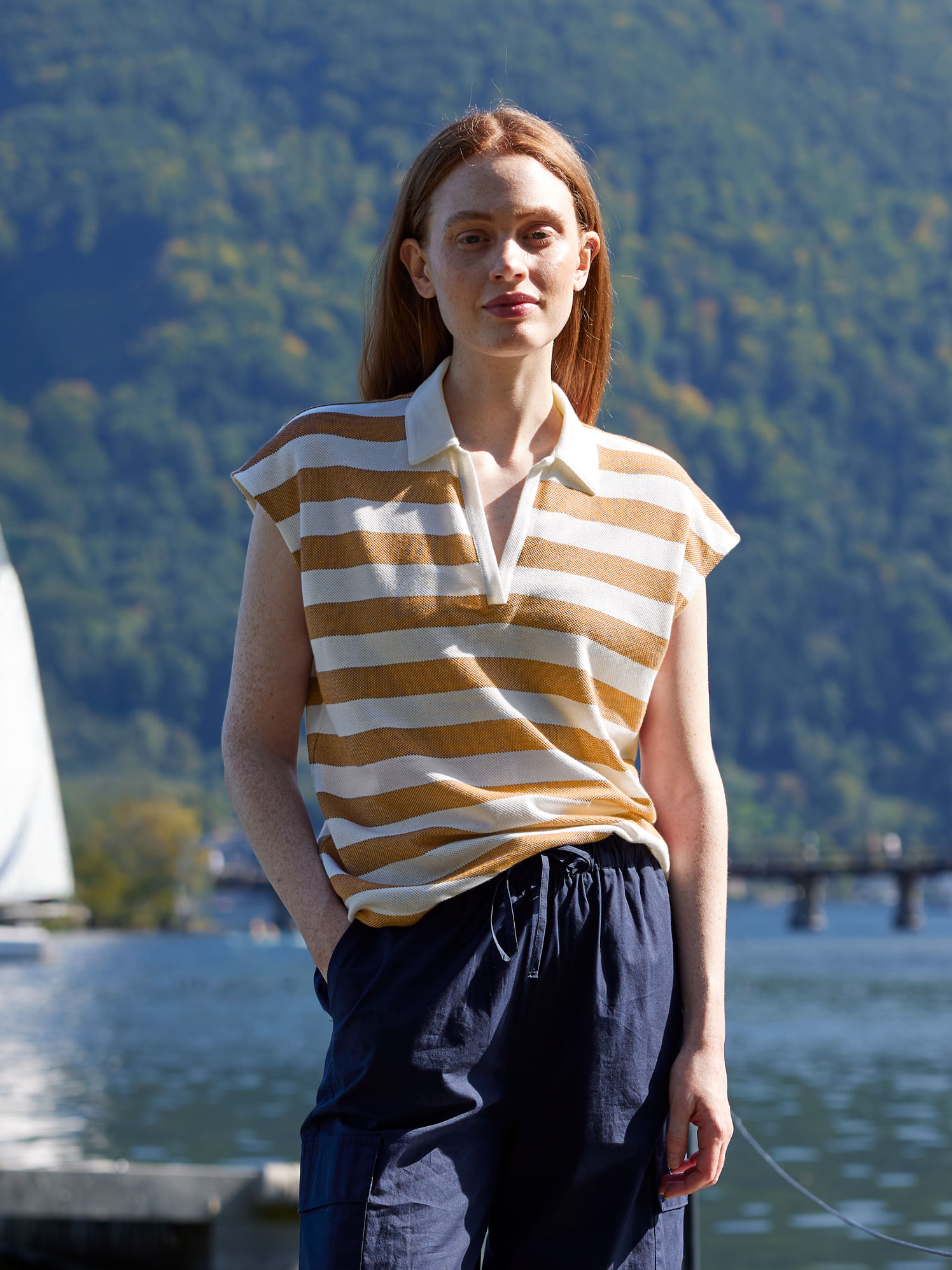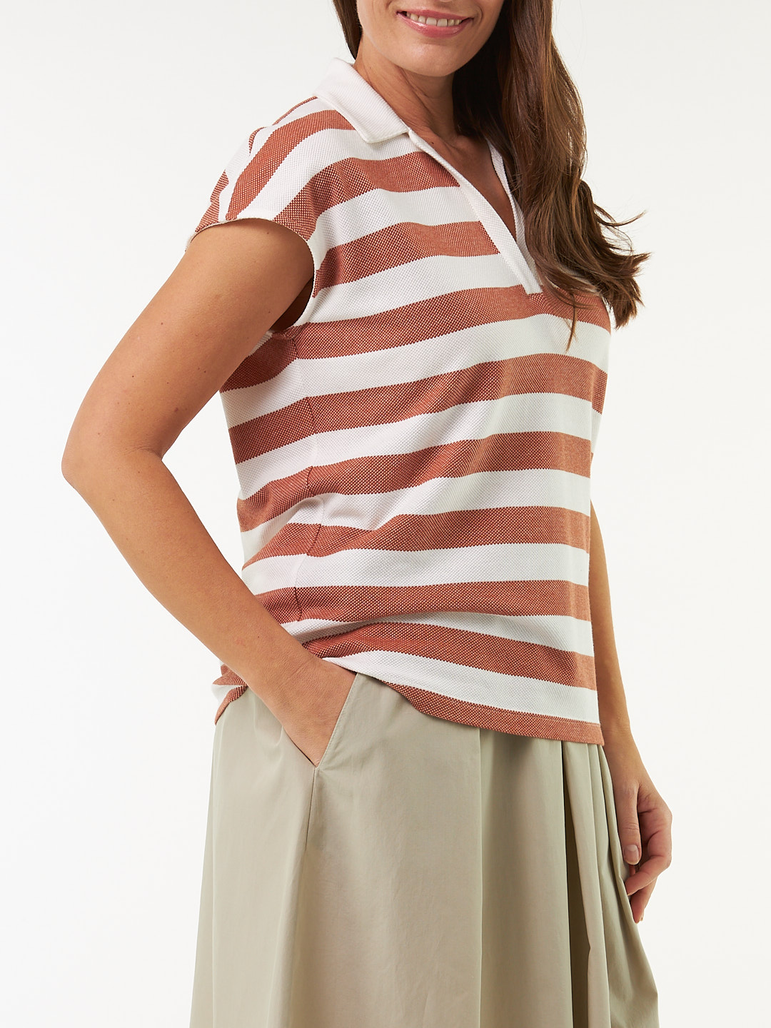 Fein strukturierter Piqué, leichter Griff und entspannte Silhouette: Das ärmellose Top aus Baumwolle kbA präsentiert sich in harmonischer Blockstreifen-Optik mit überschnittener Schulterpartie, Kragen und schmaler V-Schlitzleiste in uni. Ein legerer Fall sorgt für einen natürlichen Look mit lässigem Charakter