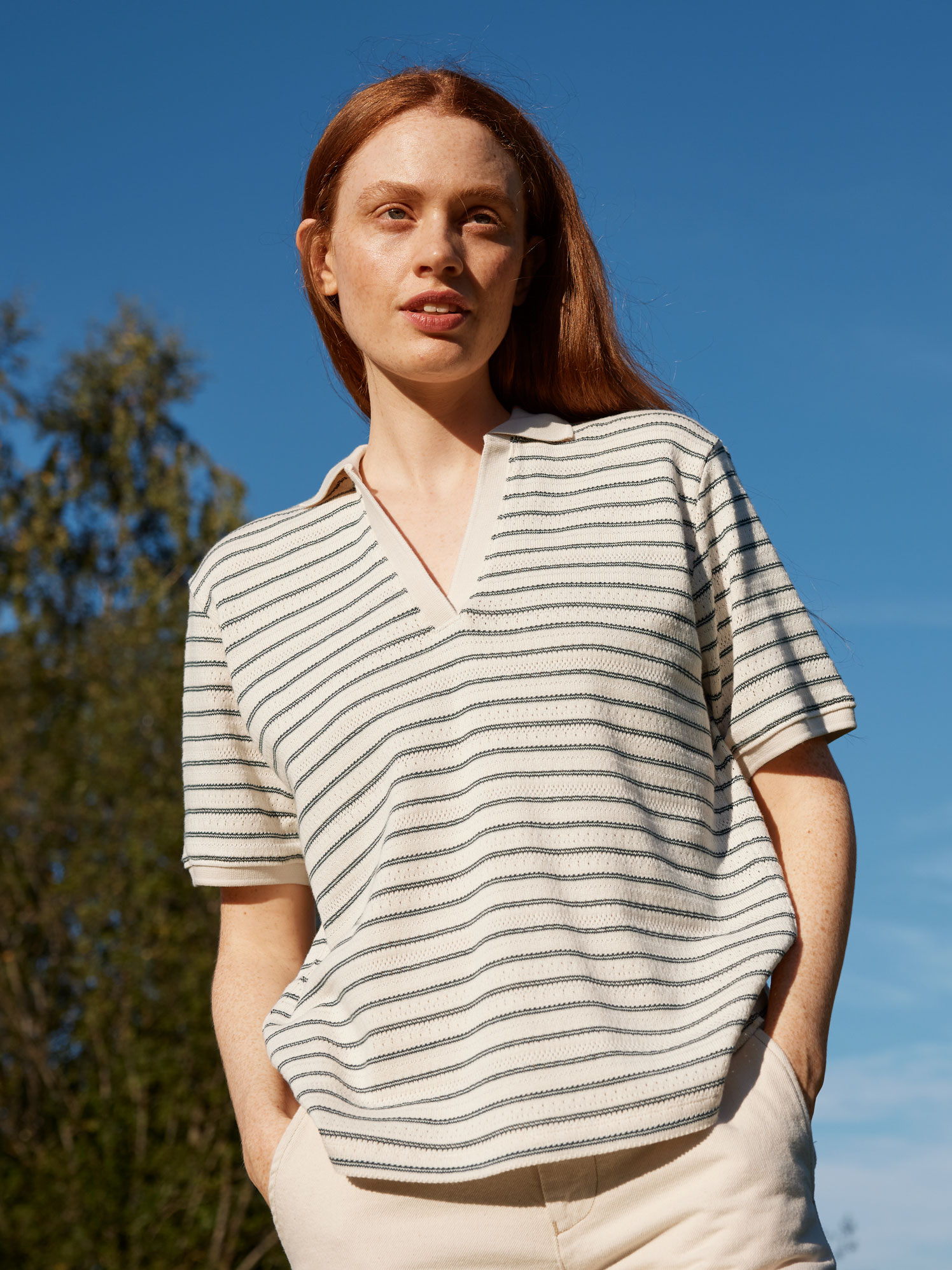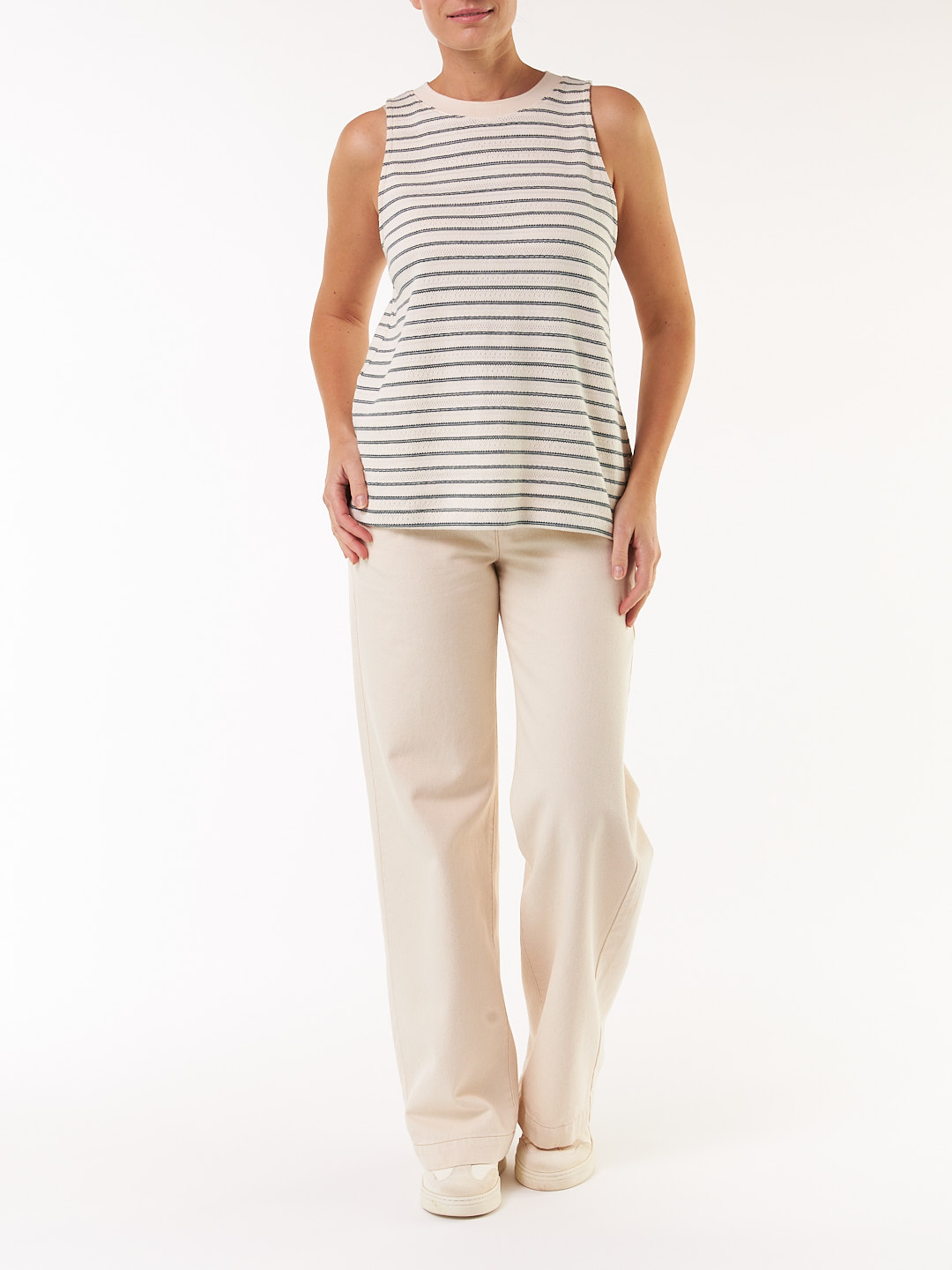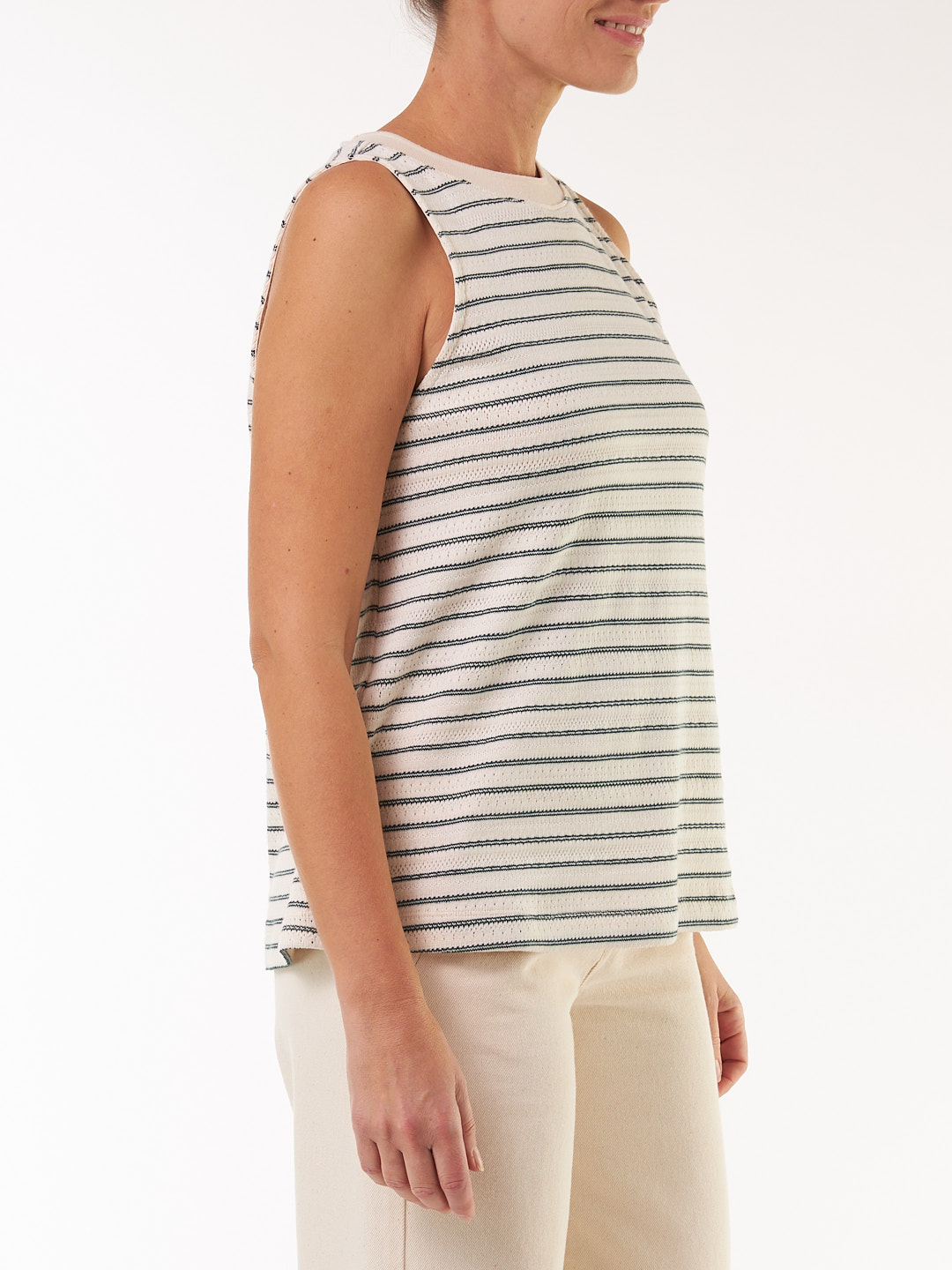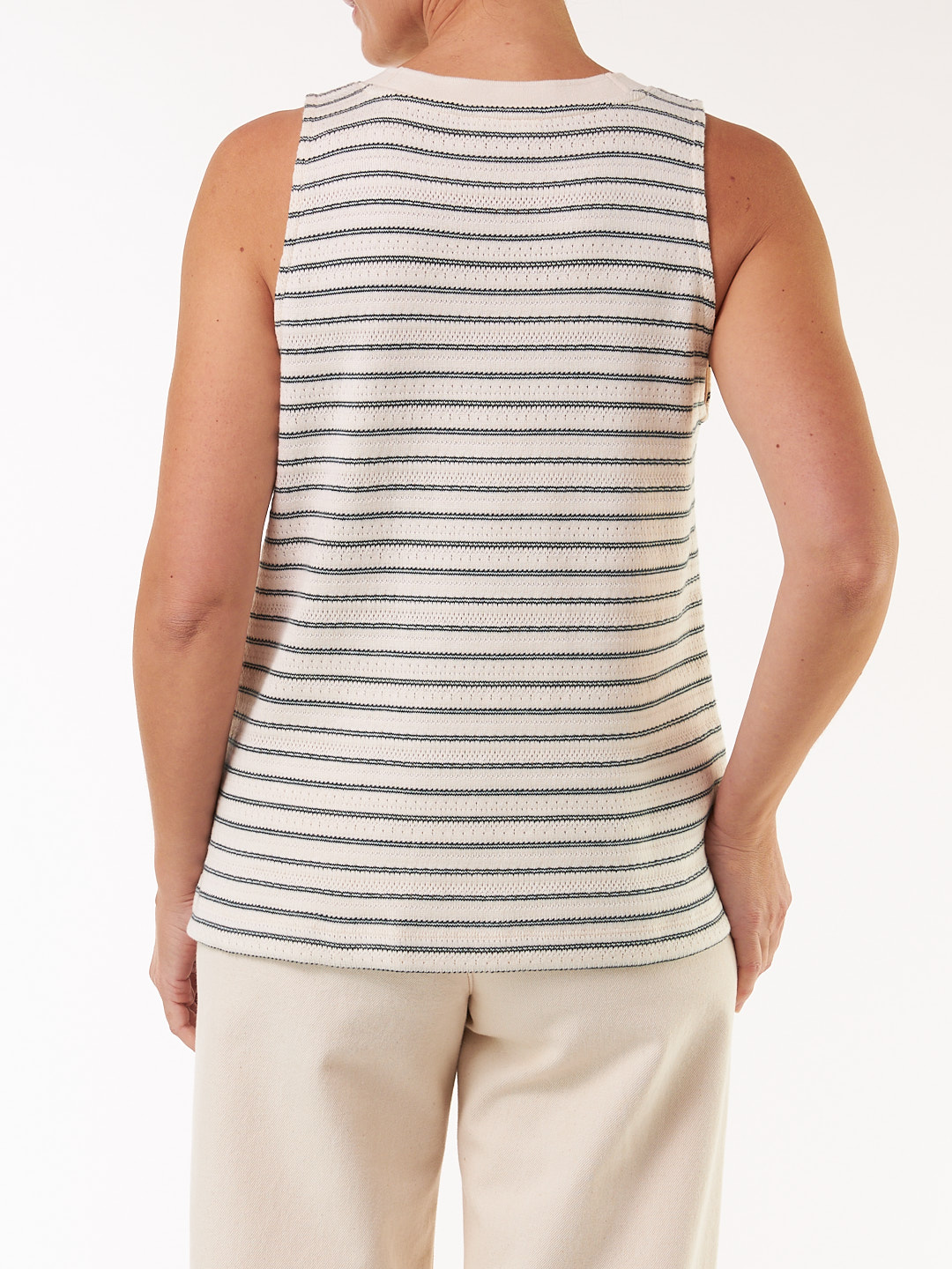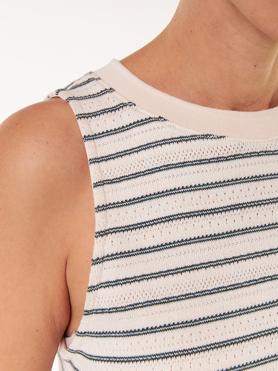 Ärmelloses Top aus hochwertigem Ajour-Jersey – weich, angenehm auf der Haut und luftdurchlässig. Das Detail an der Halsleiste setzt einen eleganten Akzent, während die zarte Ringel-Dessinierung subtile Strukturen verleiht. Der locker fallende Schnitt sorgt für ein entspanntes, modernes Tragegefühl.