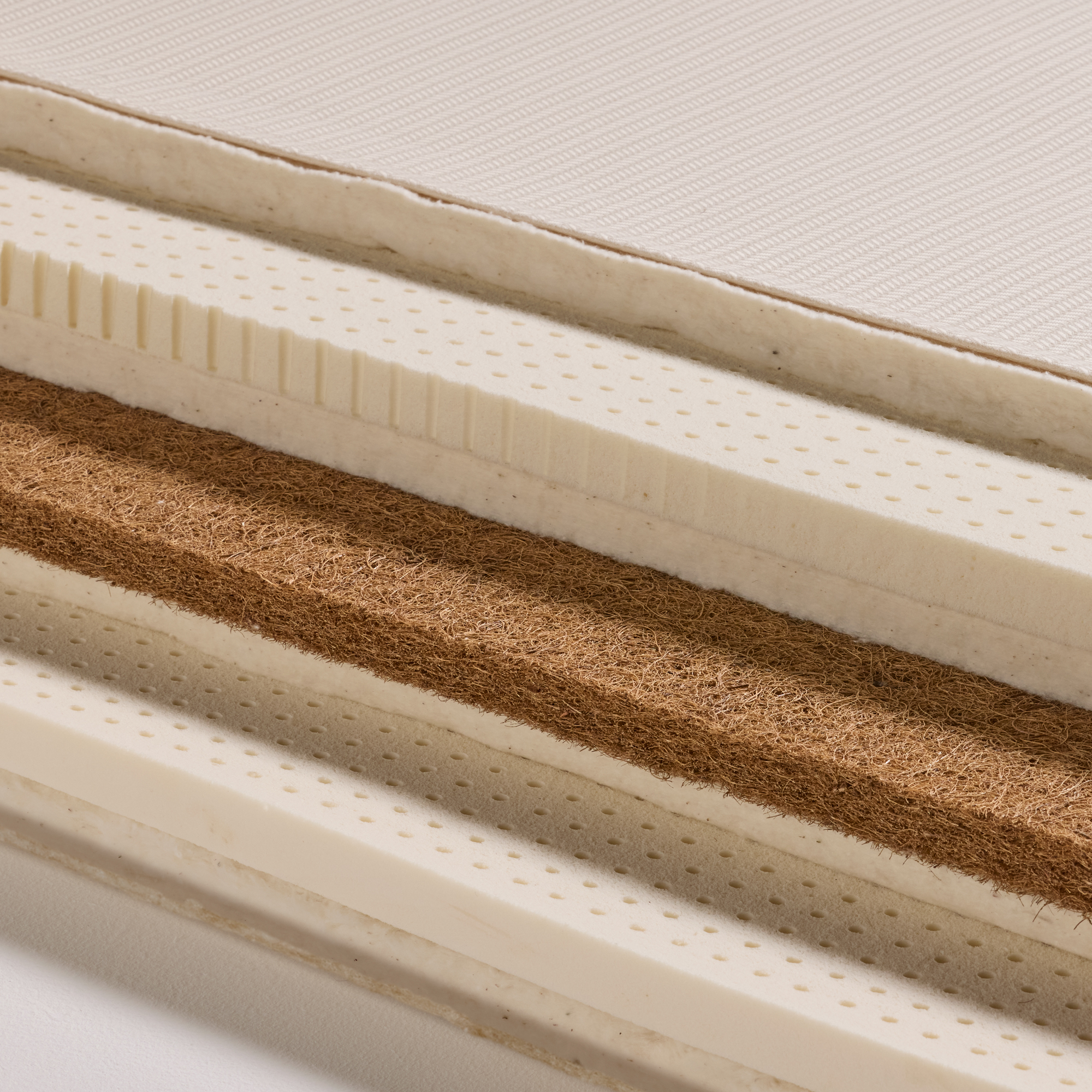 7 Schichten aus Schafschurwolle, fest-elastischem Kokoslatex und weich-elastischem Naturlatex bieten ein puristisches, futon-artiges, eher fest-kompaktes, ""flächiges"" Liegegefühl. Eingestreute Zirbenspäne sorgen für zarten, würzig-harzigen Duft.