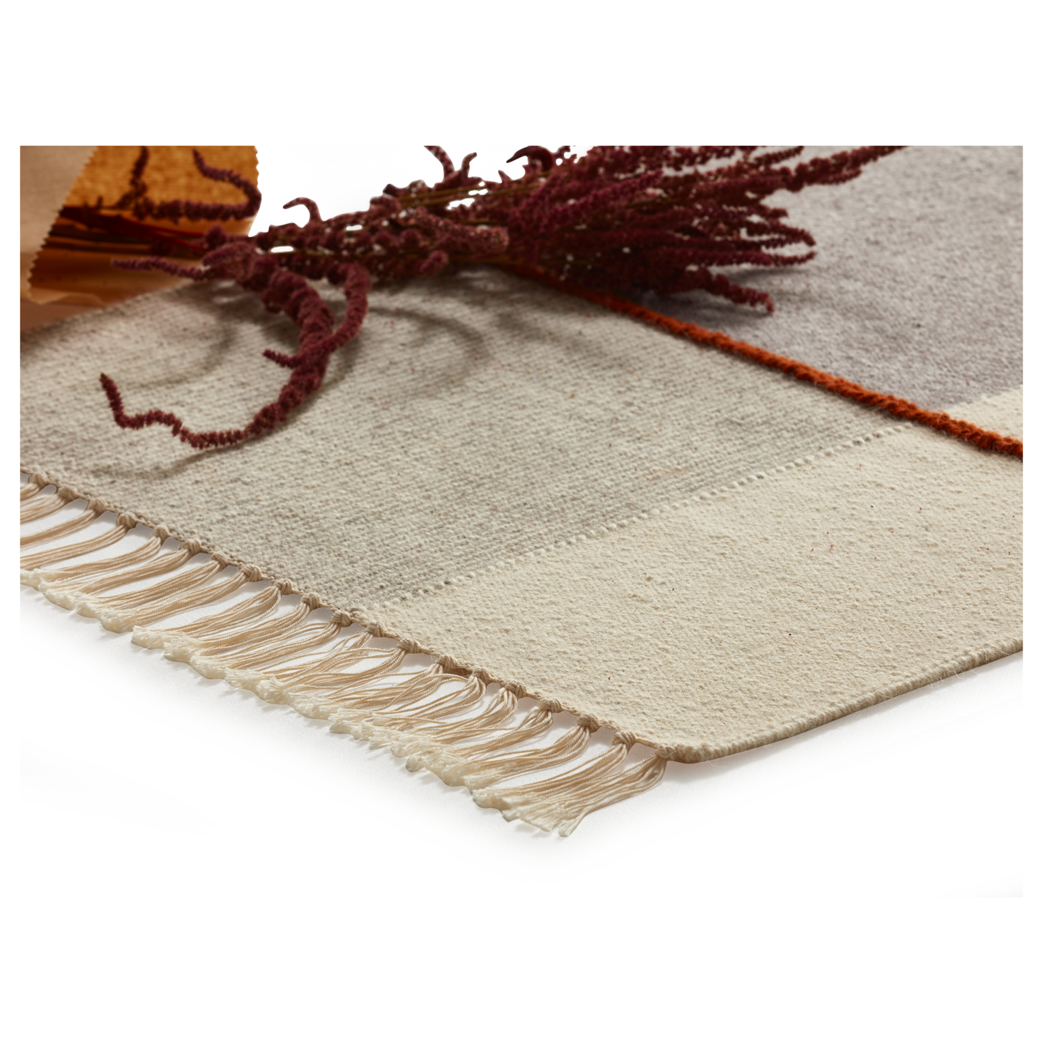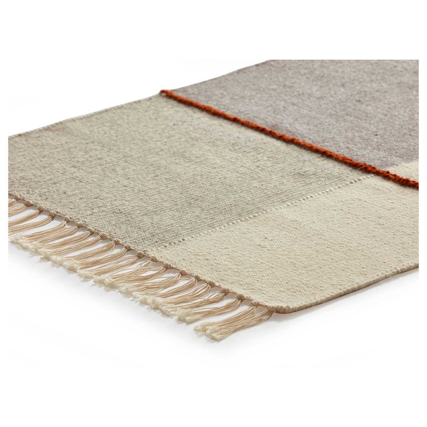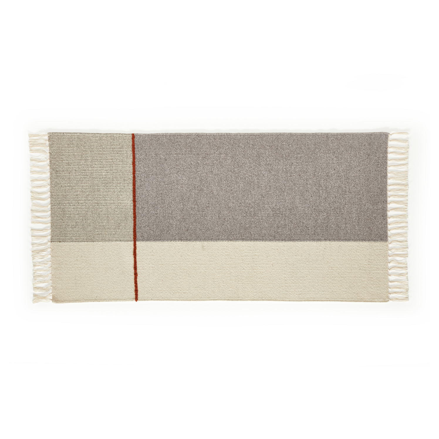 Dieser ausschließlich von Hand gefertigte Webteppich ist unsere zeitgemäße Interpretation des klassischen „Kelim“. Bei diesem aus dem vorderasiatischen Kulturraum stammenden Teppich-Typus werden die Schussfäden nicht bloß zwischen den Kettfäden hindurch geführt. Vielmehr werden bei Kelims die Schussfäden auch um die Kettfäden herumgewickelt – ein sehr aufwendiger handwerklicher Prozess: Es dauert acht Stunden, um einen 70 x 140 cm großen Teppich zu weben!