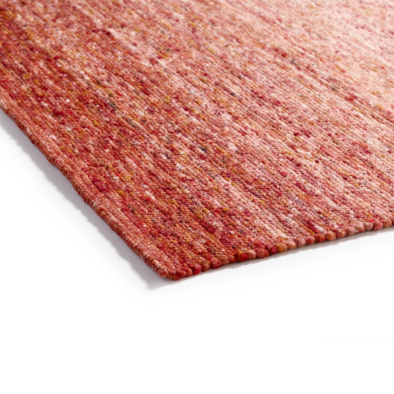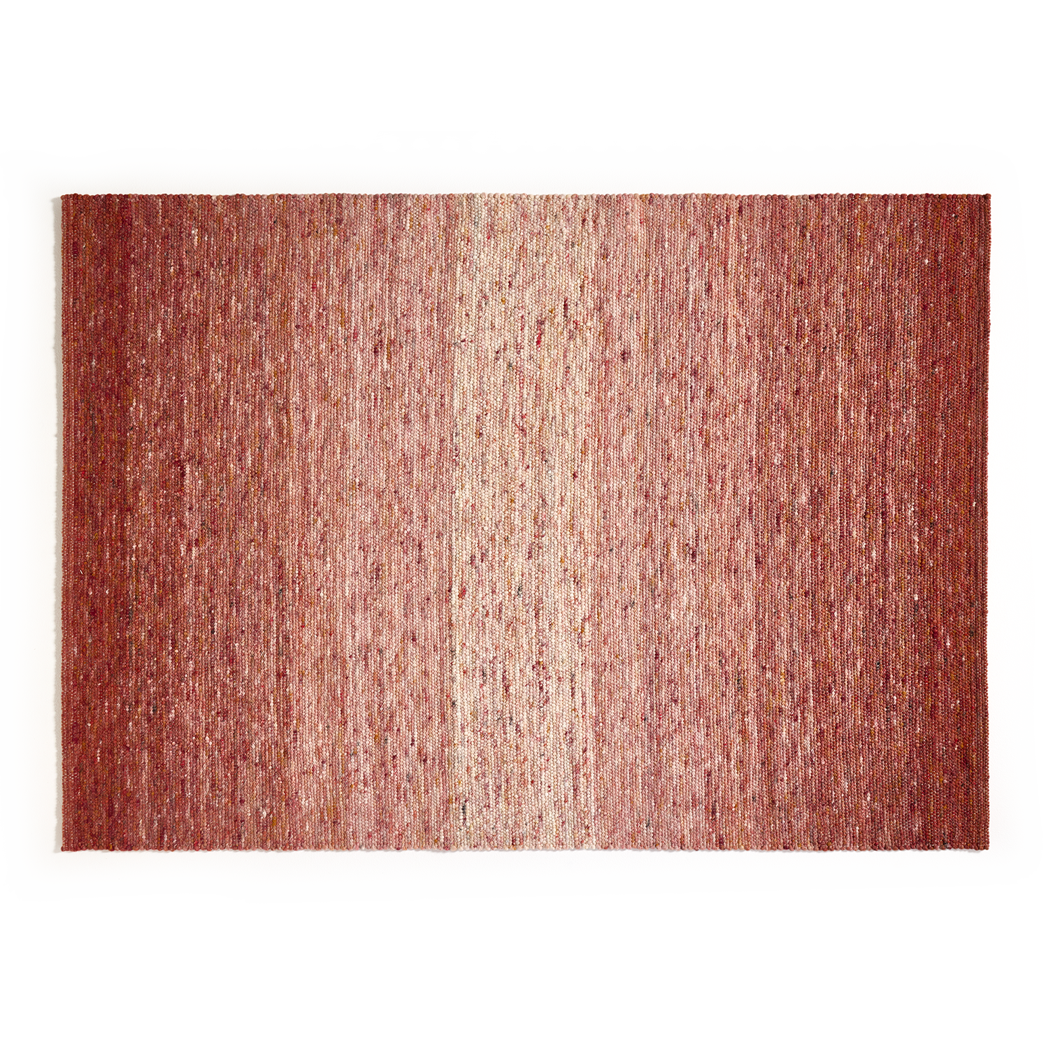 Die Besonderheit dieses Wollteppichs ist sein sanfter Farbverlauf: dunkel an den Rändern, zur Mitte immer heller werdend. Daraus ergibt sich das Bild einer symmetrischen Spiegelung des Farbverlaufes sowie ein Spiel aus Licht und Schatten, das den Teppich lebendig werden lässt. Dessen Farben sind von der Natur inspiriert: Erde, Stein, Wasser.