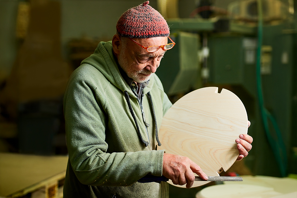 Der oberösterreichische Drechslermeister Rudi Prohaska fertigt seit den 1980er-Jahren filigrane Holzteile für Grüne Erde – von den Kugelfüßen des legendären Elfenbetts bis zu den Leuchten Torasu, Arnia oder Avo.