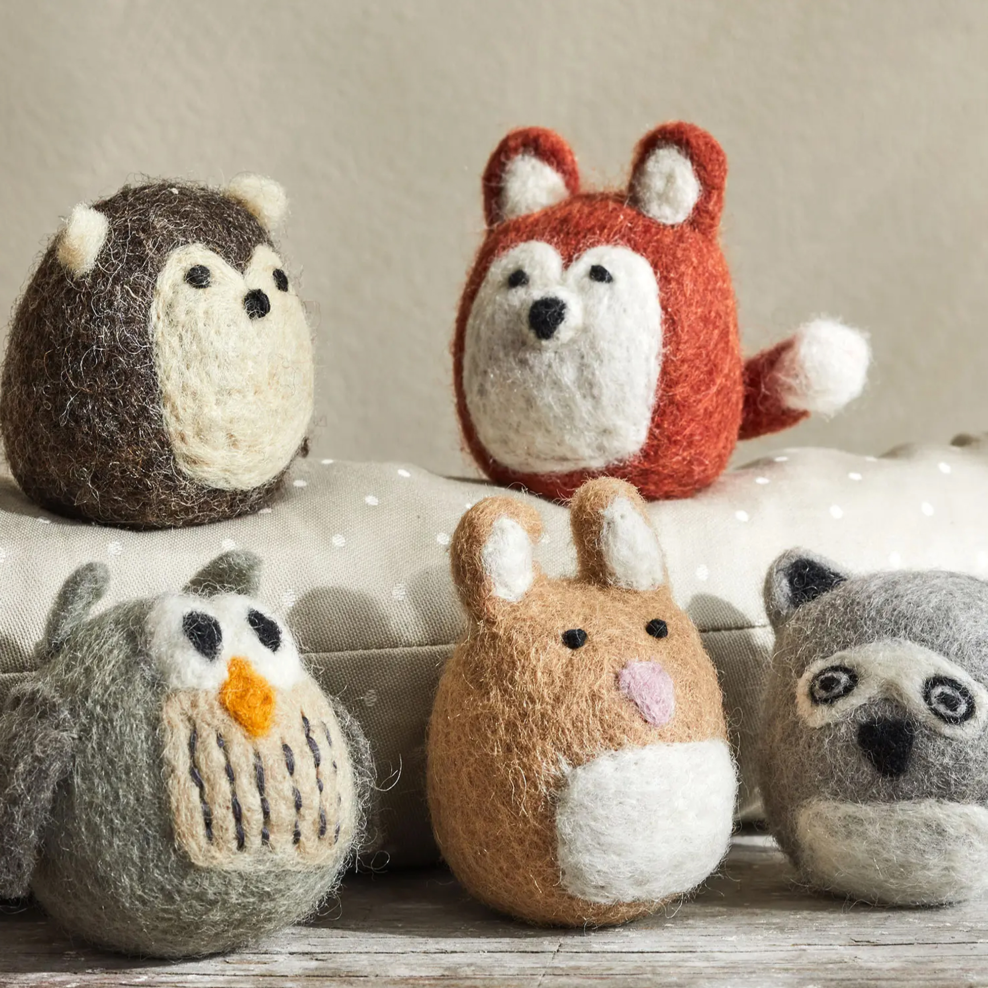 5er-Set Waldtiere: Fuchs Hase, Eule, Waschbär, Igel, ca. 7 x 5 cm, 100 % Schurwolle (Schaf)