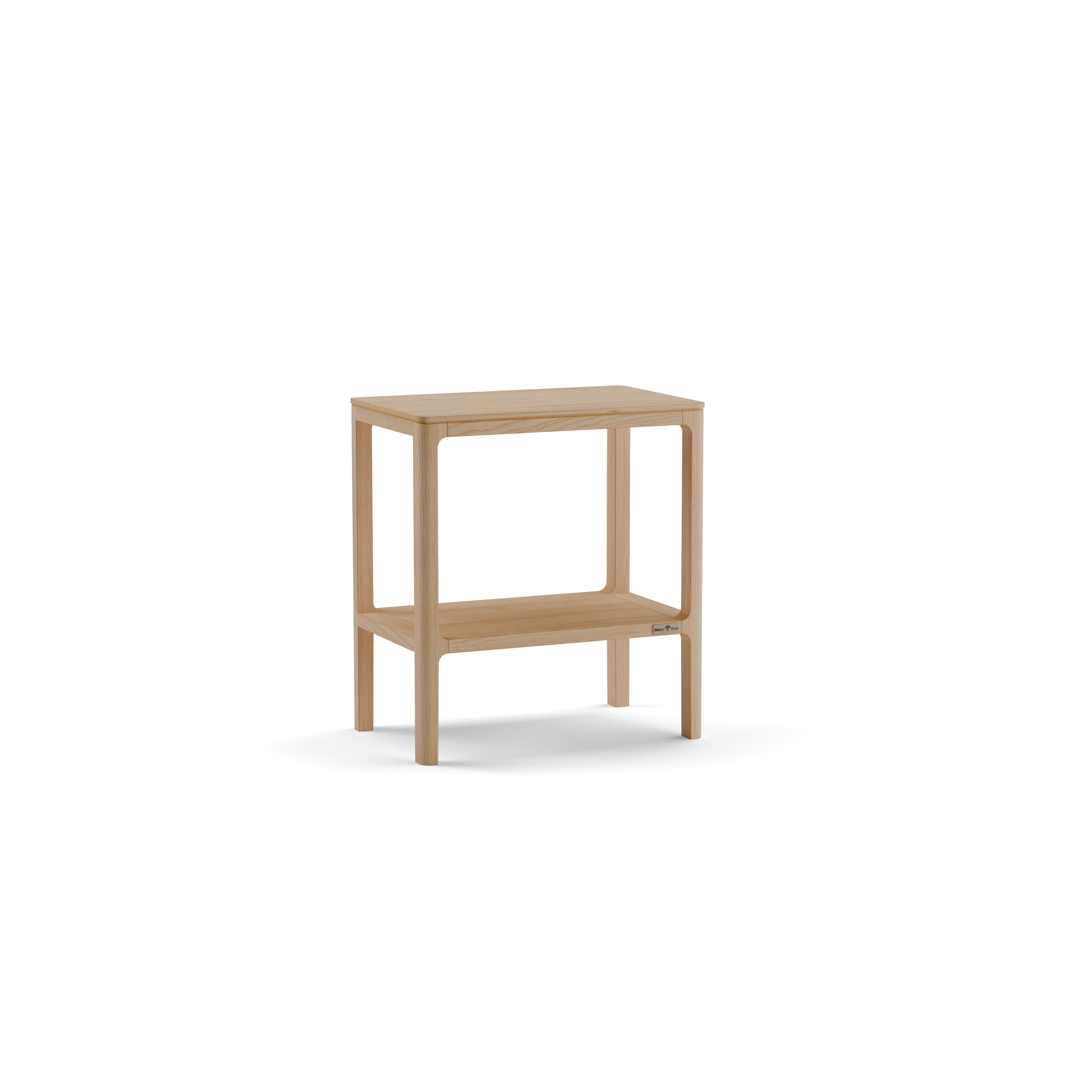 Der Beistelltisch ist zur Gänze in Massivholz ausgeführt, ohne Metall- und Kunststoffteile, die Seitenteile und die beiden Ablageböden sind über Dübel fix miteinander verleimt. Der obere Ablageboden ist 3 cm, der untere 2 cm dick.