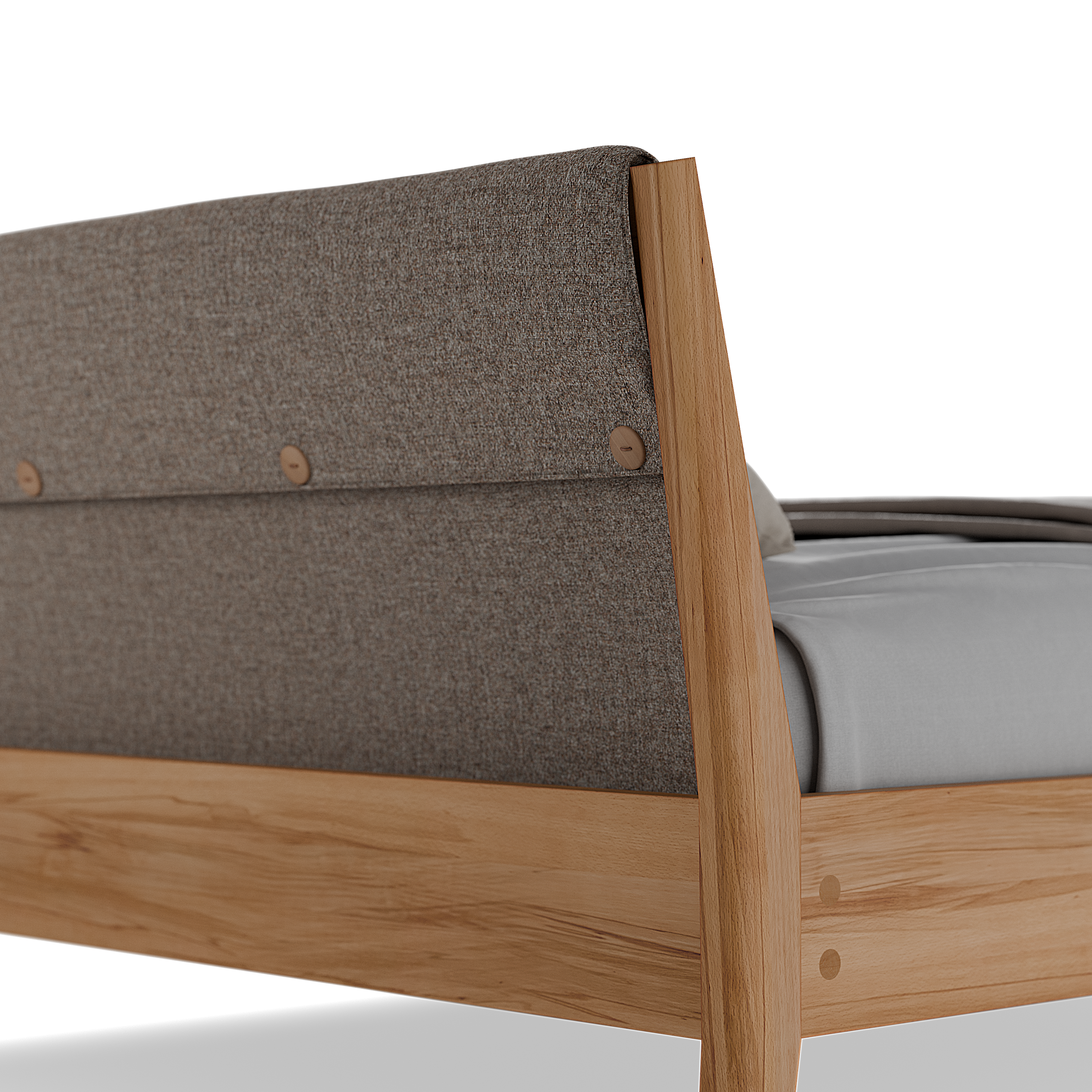 Die Housse wird an Holzdübeln an der Innenseite des Bettrahmens befestigt, über das Betthaupt geschlagen und mit dekorativen Knöpfen aus Olivenholz verschlossen.