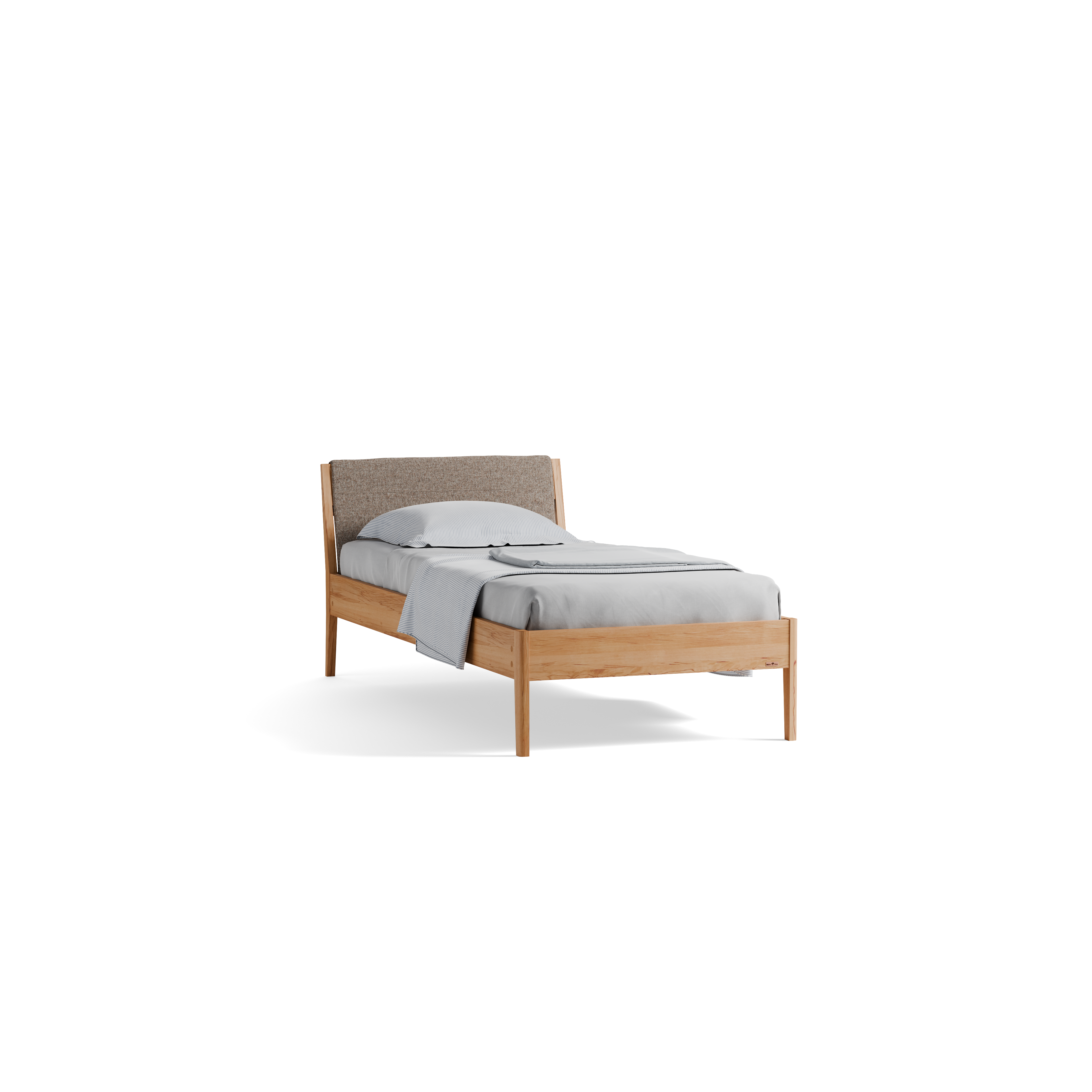 Das stabile Betthaupt neigt sich sanft etwas nach hinten und bildet gemeinsam mit dem Bettfuß einen dynamischen Schwung. Es ist mit einer abnehmbaren, weich gepolsterten Housse ausgestattet. Diese fügt dem festen Material Holz eine weiche Komponente hinzu und lädt zum bequemen, knarzfreien Anlehnen ein, etwa beim Lesen oder beim abendlichen Gedankenaustausch mit dem Partner bzw. der Partnerin.