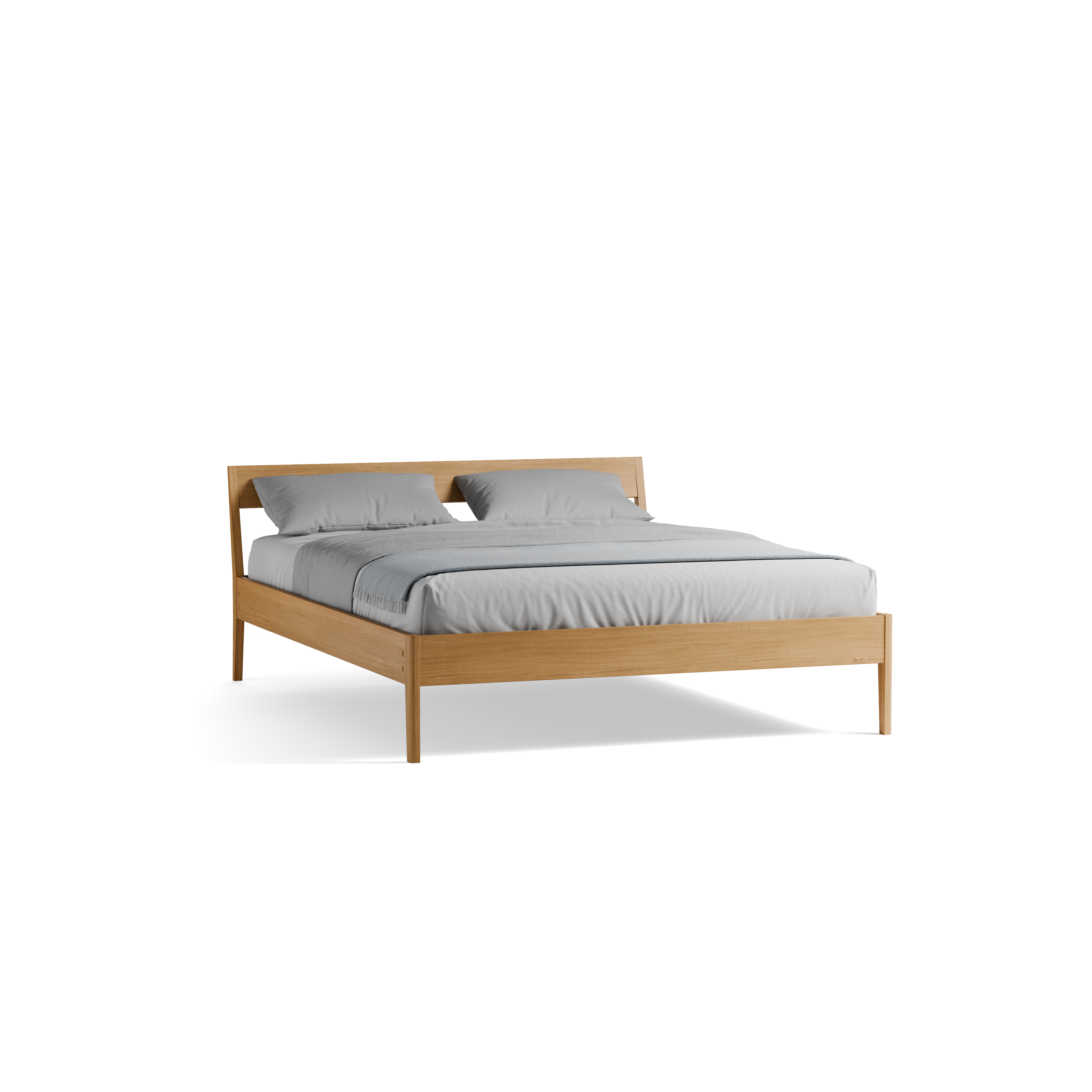 Das stabile Betthaupt neigt sich sanft etwas nach hinten und bildet gemeinsam mit dem Bettfuß einen dynamischen Schwung. Es lädt zum bequemen, knarzfreien Anlehnen ein, etwa beim Lesen oder beim abendlichen Gedankenaustausch mit dem Partner bzw. der Partnerin.