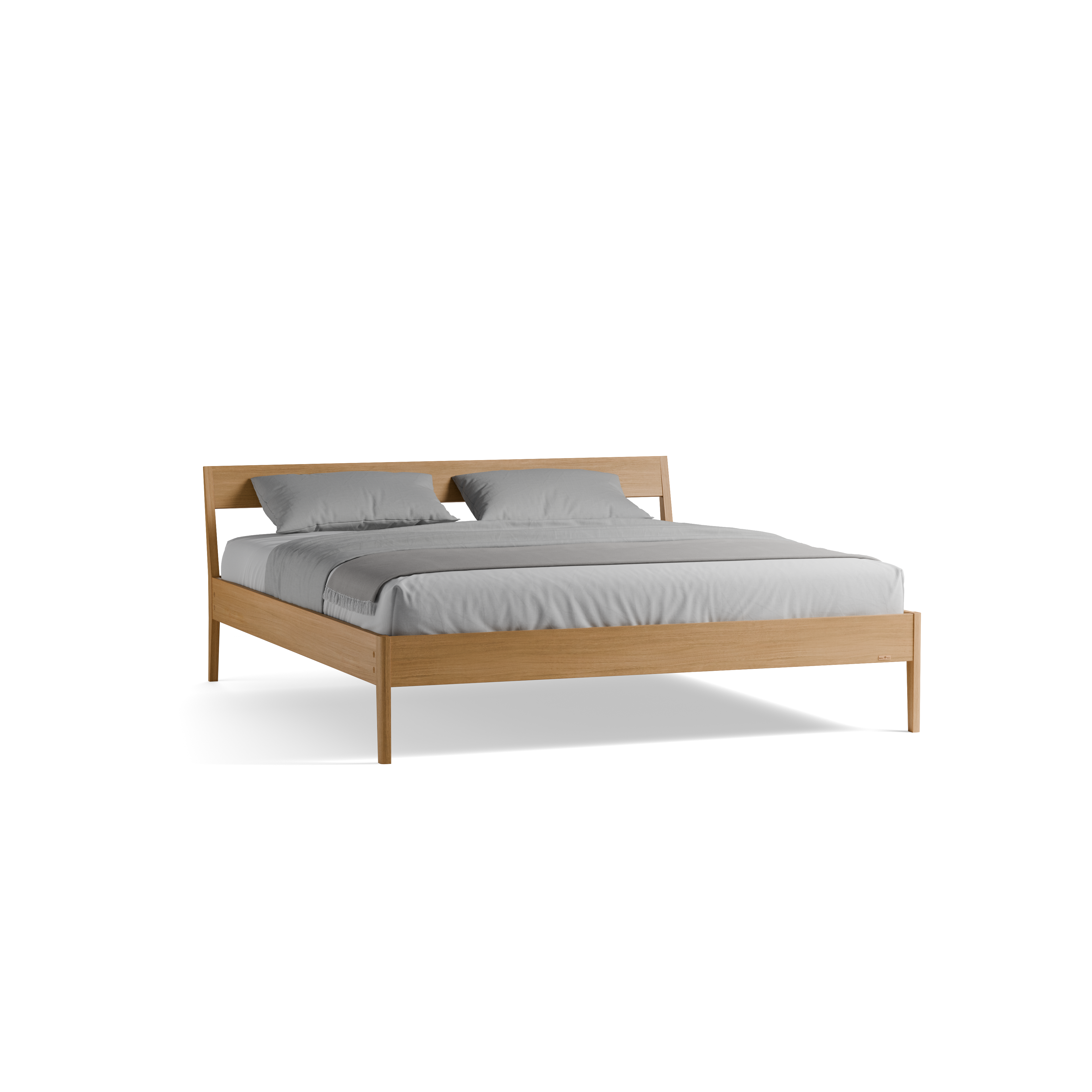 Almeno ist das beliebteste Bett von Grüne Erde. Auch, weil es unser vielfältigstes ist. Sie können es in mehreren Holzarten und Varianten wählen: ganz "basic" ohne Betthaupt, als Polsterbett, mit Sprossenbetthaupt oder – wie hier – mit einem Steg-Betthaupt.