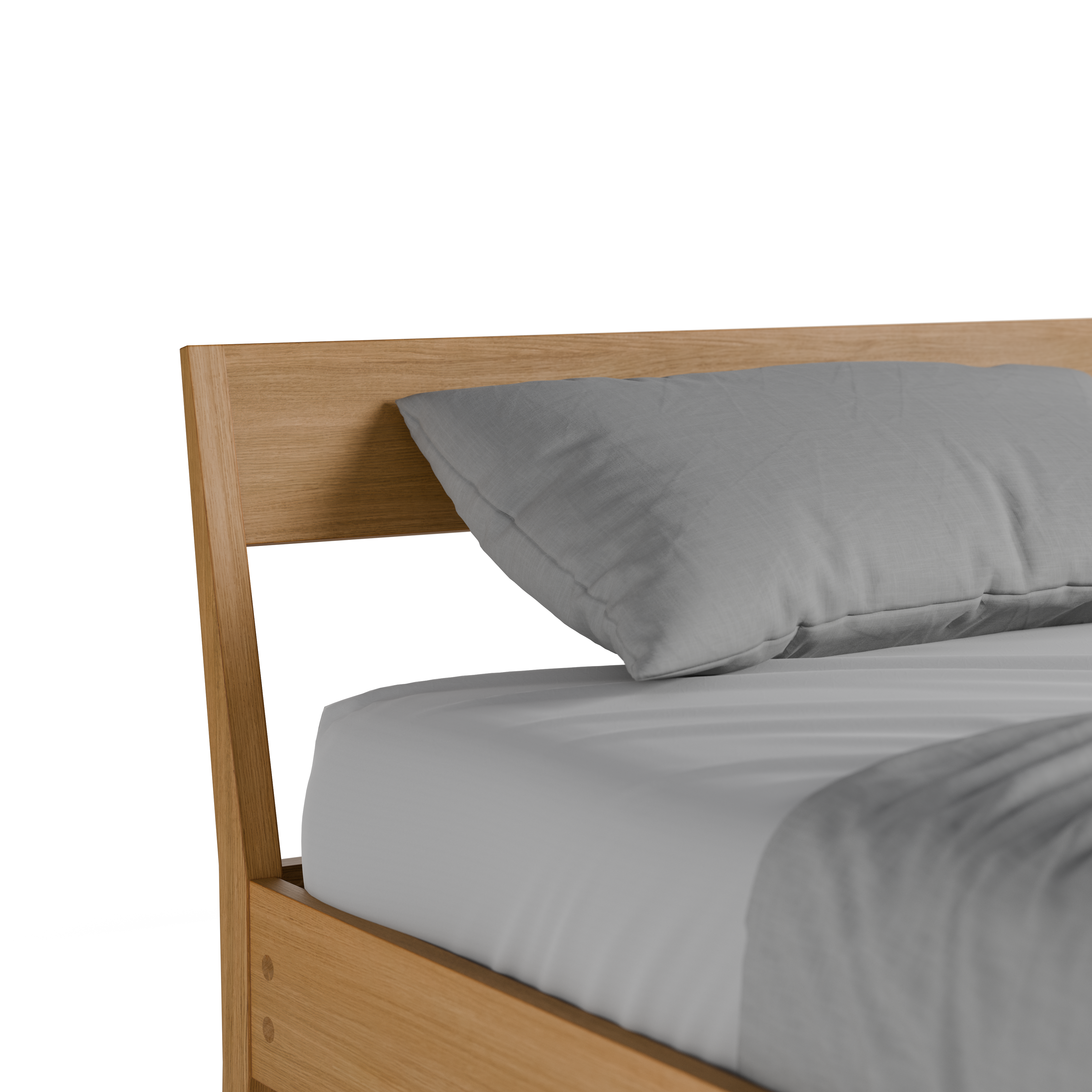 Das stabile Betthaupt neigt sich sanft etwas nach hinten und bildet gemeinsam mit dem Bettfuß einen dynamischen Schwung. Es lädt zum bequemen, knarzfreien Anlehnen ein, etwa beim Lesen oder beim abendlichen Gedankenaustausch mit dem Partner bzw. der Partnerin.
