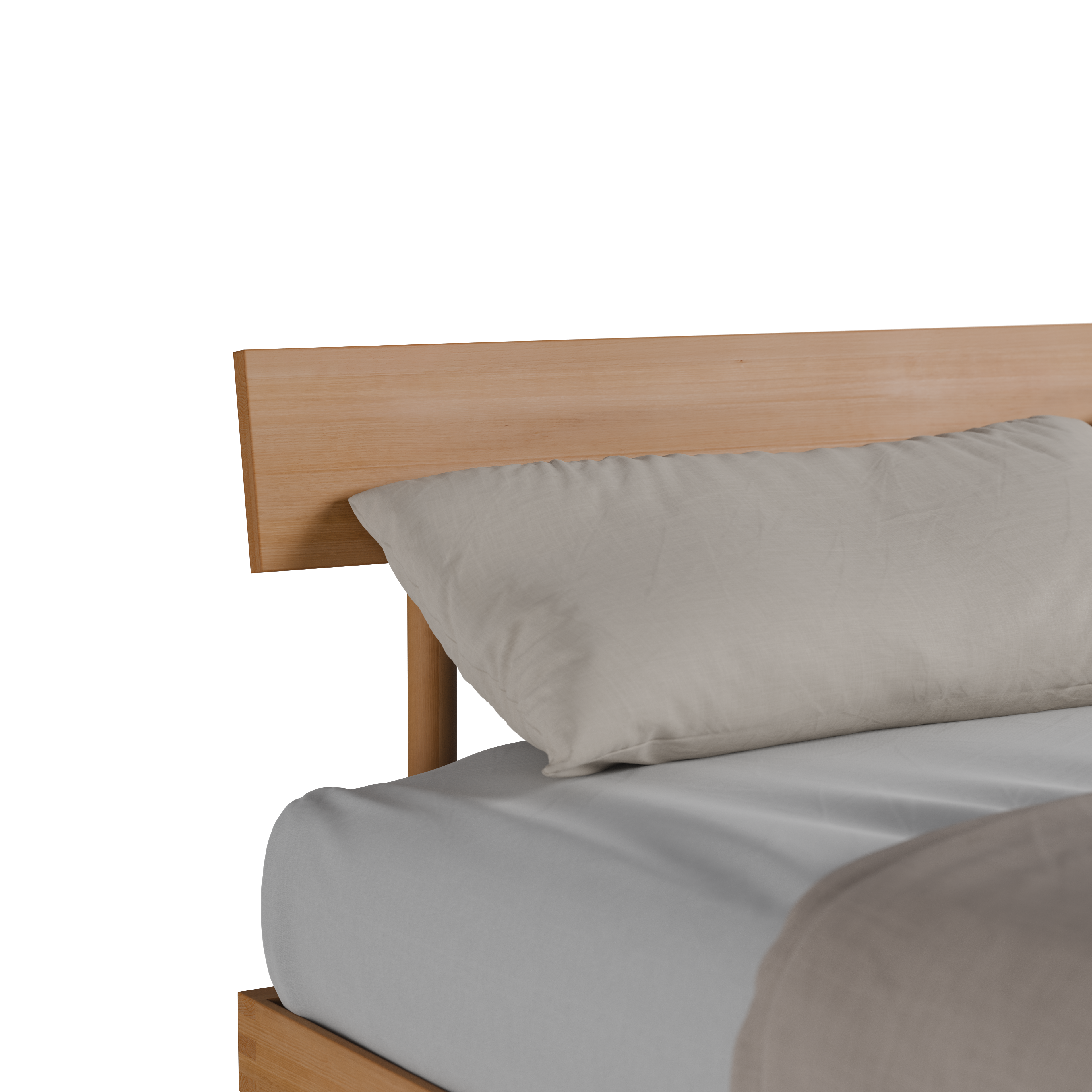 Das 52 cm hohe Flächenbetthaupt ist aus einer 19 mm dicken Dreischichtplatte (Vollholz) gefertigt: Fichtenkern mit Deckschicht, wahlweise Buche oder Eiche. Es wird mit wenigen Handgriffen werkzeuglos am Bettrahmen montiert – mittels metallfreier, wieder lösbarer Zapfen & Keil-Steckverbindungen.