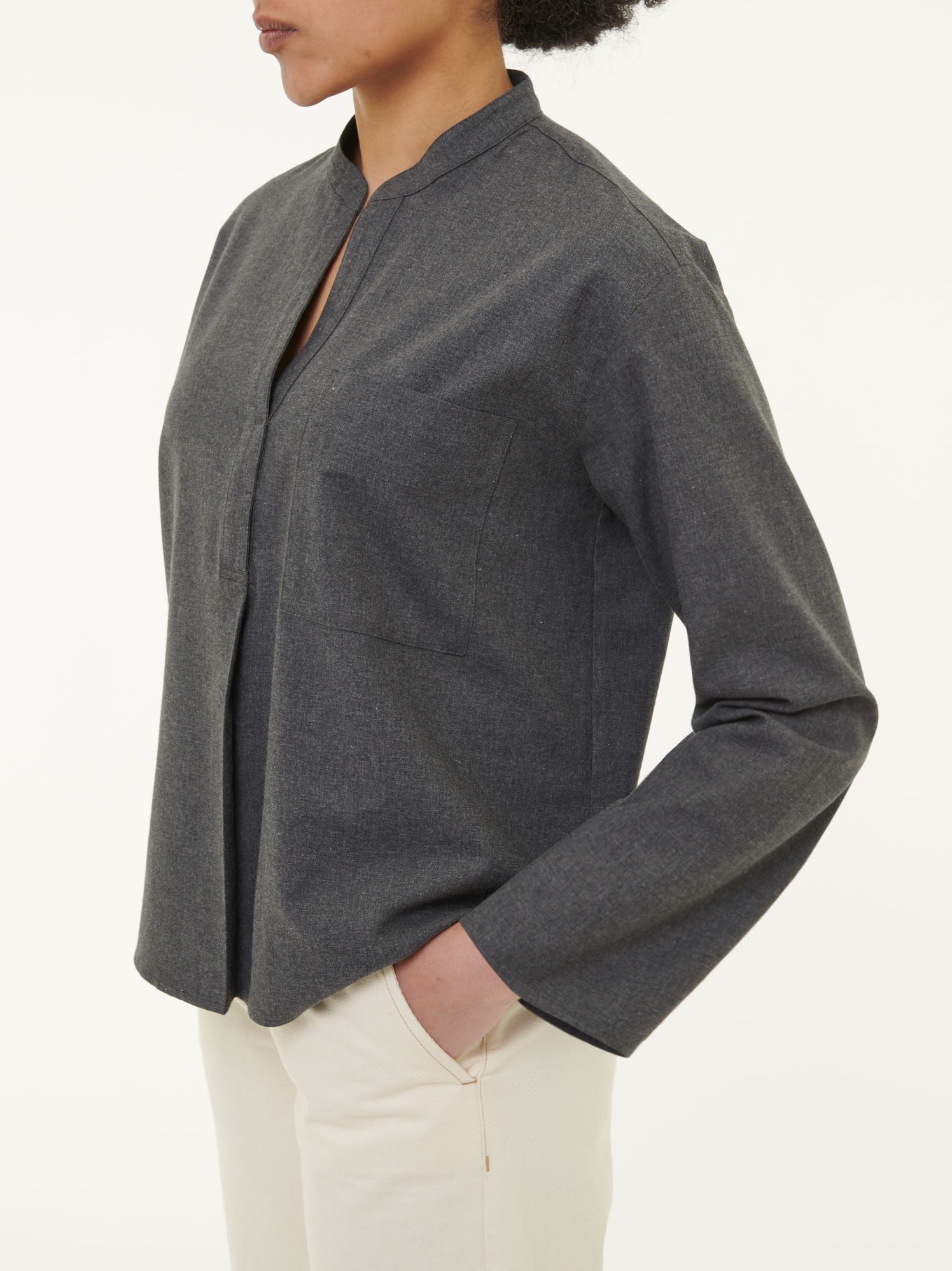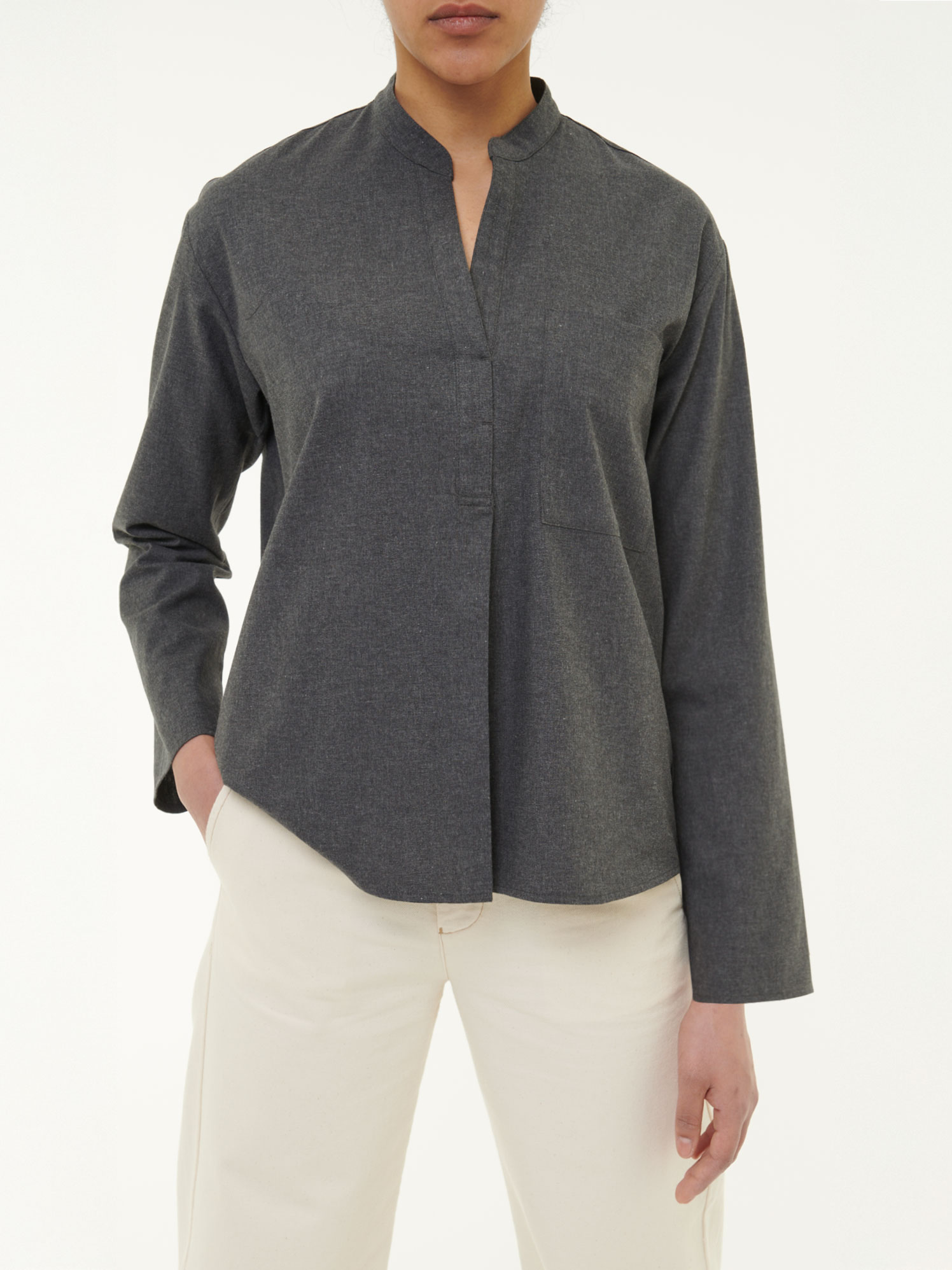 Die Bluse aus reiner Baumwolle kbA überzeugt mit ihrer besonders weichen Edelflanell-Qualität und einer Brusttasche auf der linken Vorderseite. Eine moderne, feminine Note verleiht ihr der Stehkrgen mit einer V-Ausschnittsleiste, welche vorne in eine Falte aufspringt. Der weich gewebte Flanell sorgt für angenehme Wärme und ein natürliches Tragegefühl auf der Haut. Ein unkompliziertes Lieblingsstück für jeden Tag – pur, natürlich, hochwertig.