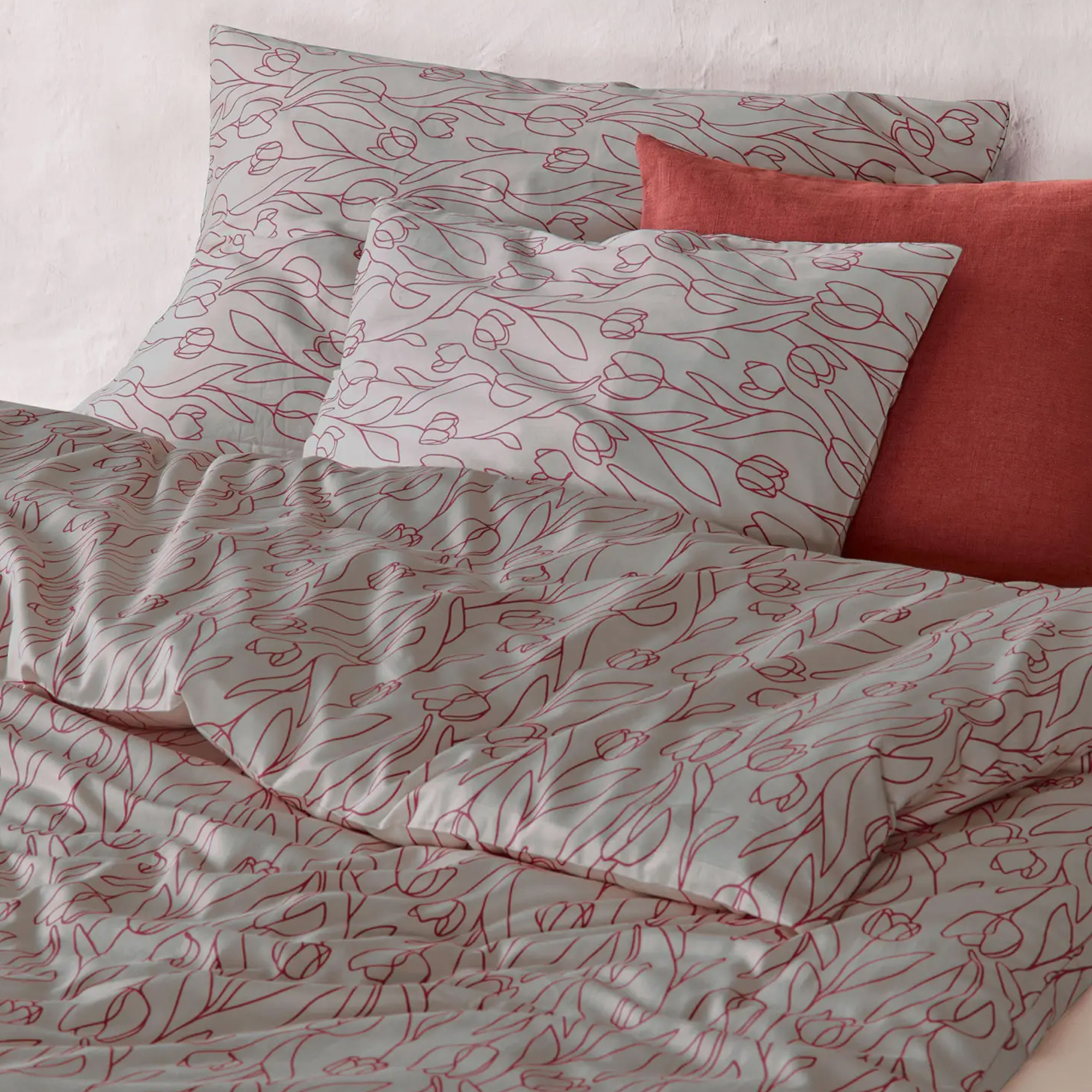 Die Bettwäsche Calla aus zarter Satin-Qualität bezaubert mit fein gezeichnetem Tulpenmotiv und angenehm-leichter Haptik. Beim Deckenüberzug verläuft das florale Muster in Längsrichtung, während der Kissenüberzug die Tulpe horizontal zeigt – ein harmonisches Dessin, welches Ihr Schlafzimmer stilvoll bereichert. Der sichtbare Knopfverschluss mit Steinnussknöpfen in Natur setzt einen schönen, natürlichen Akzent und rundet das moderne Design harmonisch ab.
