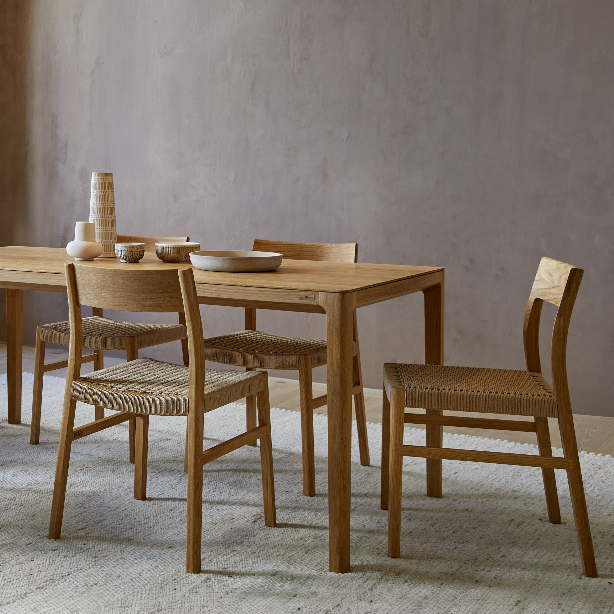 Was sofort ins Auge fällt, ist die tänzerische Leichtigkeit und Eleganz dieses – scheinbar – schlichten Tisches. Denn bei genauerem Hinsehen offenbaren sich viele raffinierte Details. Etwa die außen gerundeten, innen kantigen, schlanken Tischbeine. Sie sind an den äußersten Ecken positioniert, was Tenso Tiefe und Weite verleiht. An ihrem oberen Ende gehen die Beine mit einem schönen Bogenschwung in die niedrige, abgeschrägte Zarge über. Darauf sitzt, durch eine reizvolle Schattenfuge abgesetzt und scheinbar schwebend, die optisch zart wirkende, in Wahrheit aber fast 2 cm starke Tischplatte mit abgerundeten Ecken.