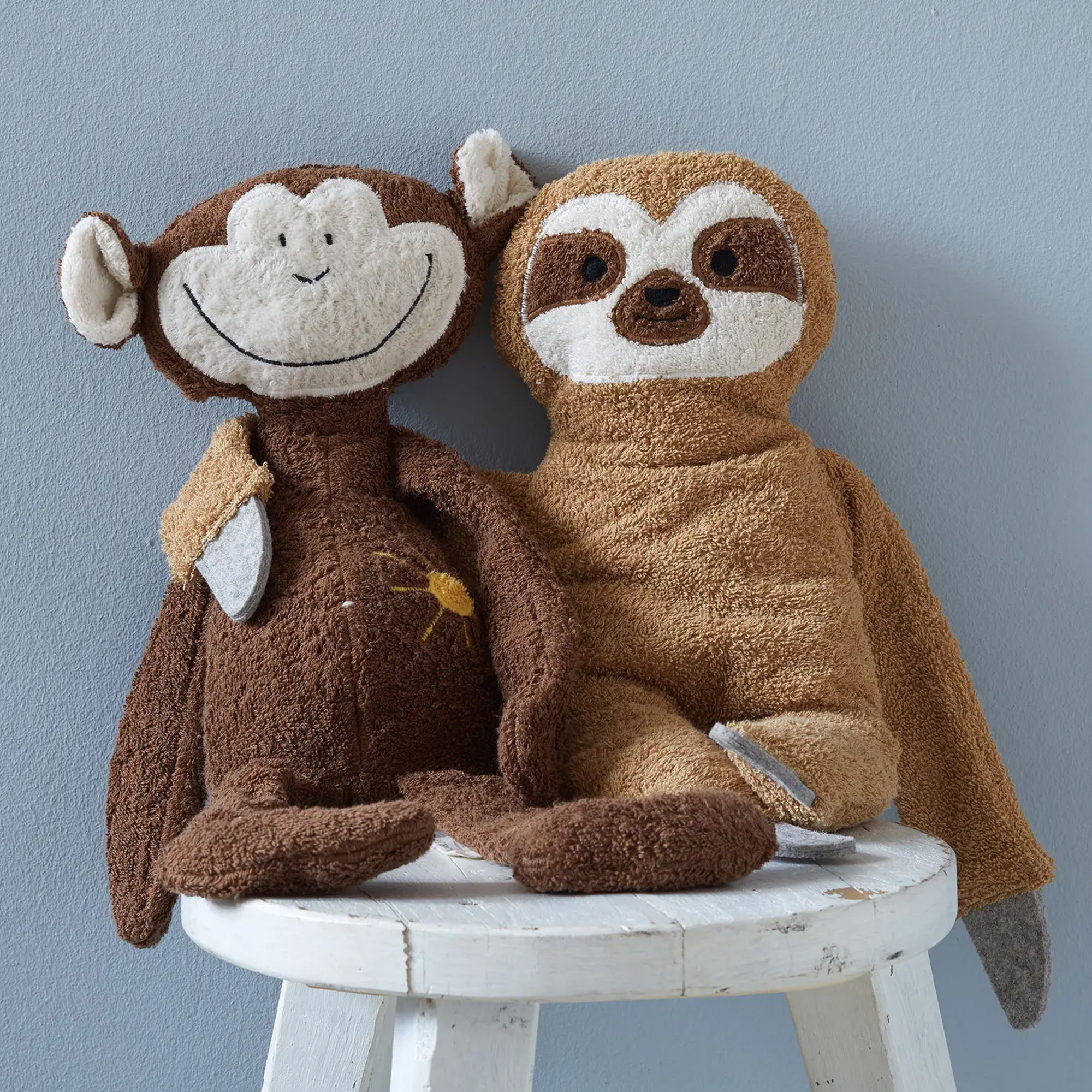 Der Geruch nach Schaf ist sowohl bei dem Faultier als auch bei dem Affen extrem penetrant und hat meine Kinder sehr gestört. Verständlich, sie haben die Kuscheltiere ja auch mit im Bett und immer nah am Gesicht. Ich hab sie mehrfach auch sehr heiß gewaschen, der Geruch geht einfach nicht komplett raus. Leider kann ich sie nach dem häufigen Waschen natürlich nicht mehr zurück schicken. Finde ich sehr ärgerlich.