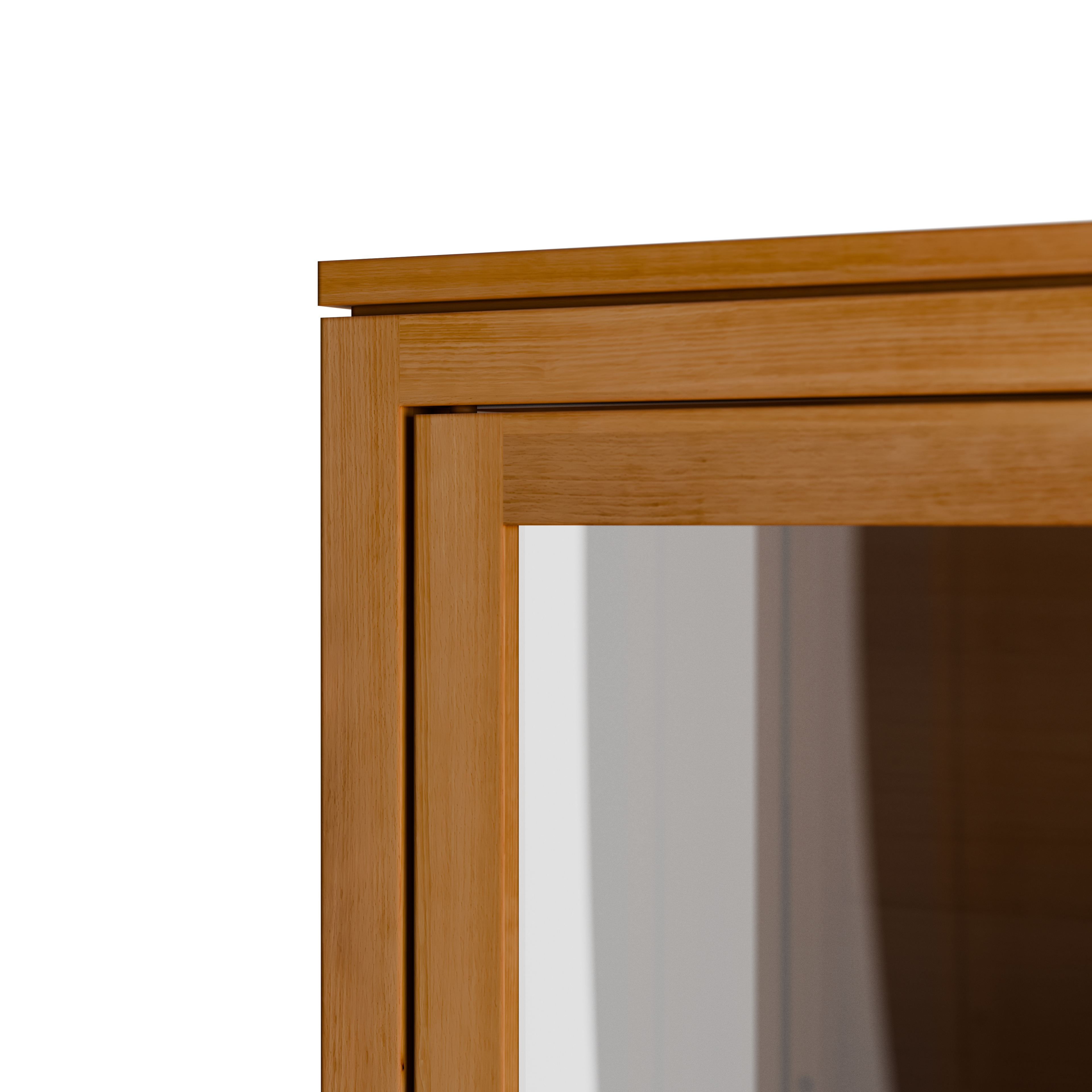 - Die Türen des Glasschrankes werden mit Holzdrehgriffen verschlossen, jene des Sideboards haben Grifflöcher und laufen in Holznuten.