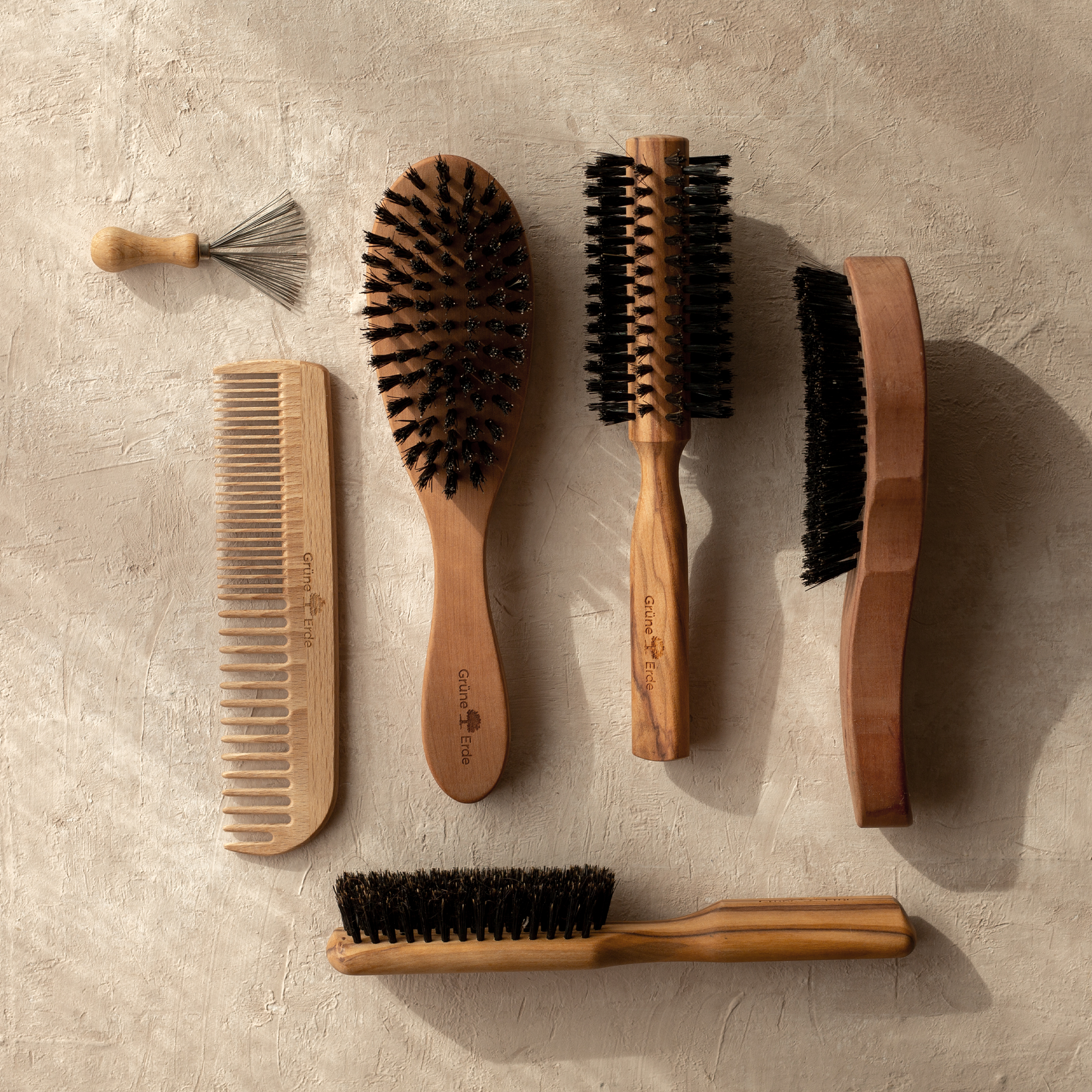 Wildschweinborsten sind die längsten, kräftigsten und hochwertigsten Naturborsten. Sie sind in unterschiedlicher Länge in den Bürstenkörper eingestanzt: So durchdringen sie das Haar besser, ohne es elektrostatisch aufzuladen. Die Bürstenkörper sind aus attraktiv gemasertem Oliven- bzw. fein strukturiertem Birnbaumholz, das beim regelmäßigen Obstbaumschnitt anfällt, sauber gearbeitet und liegen gut in der Hand.