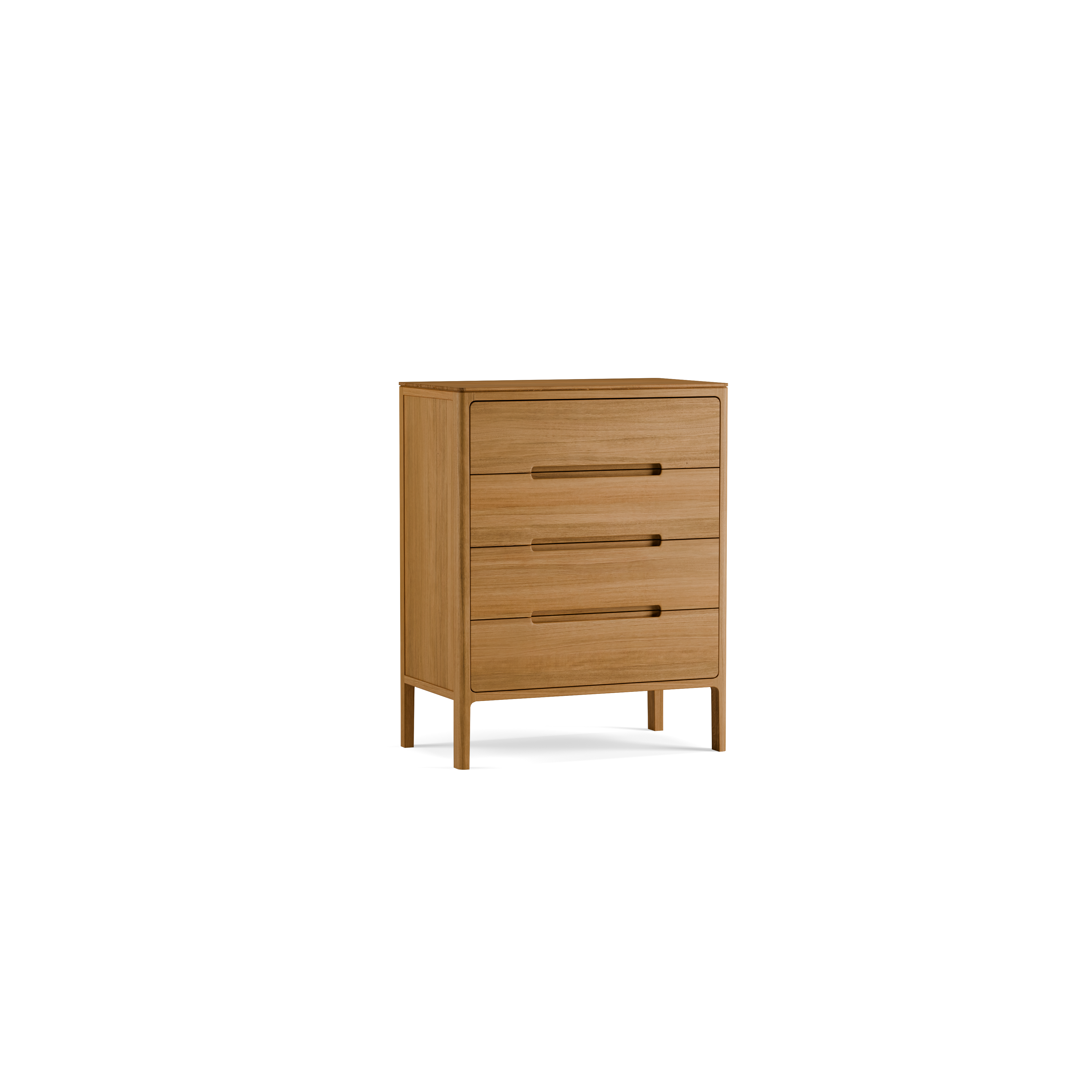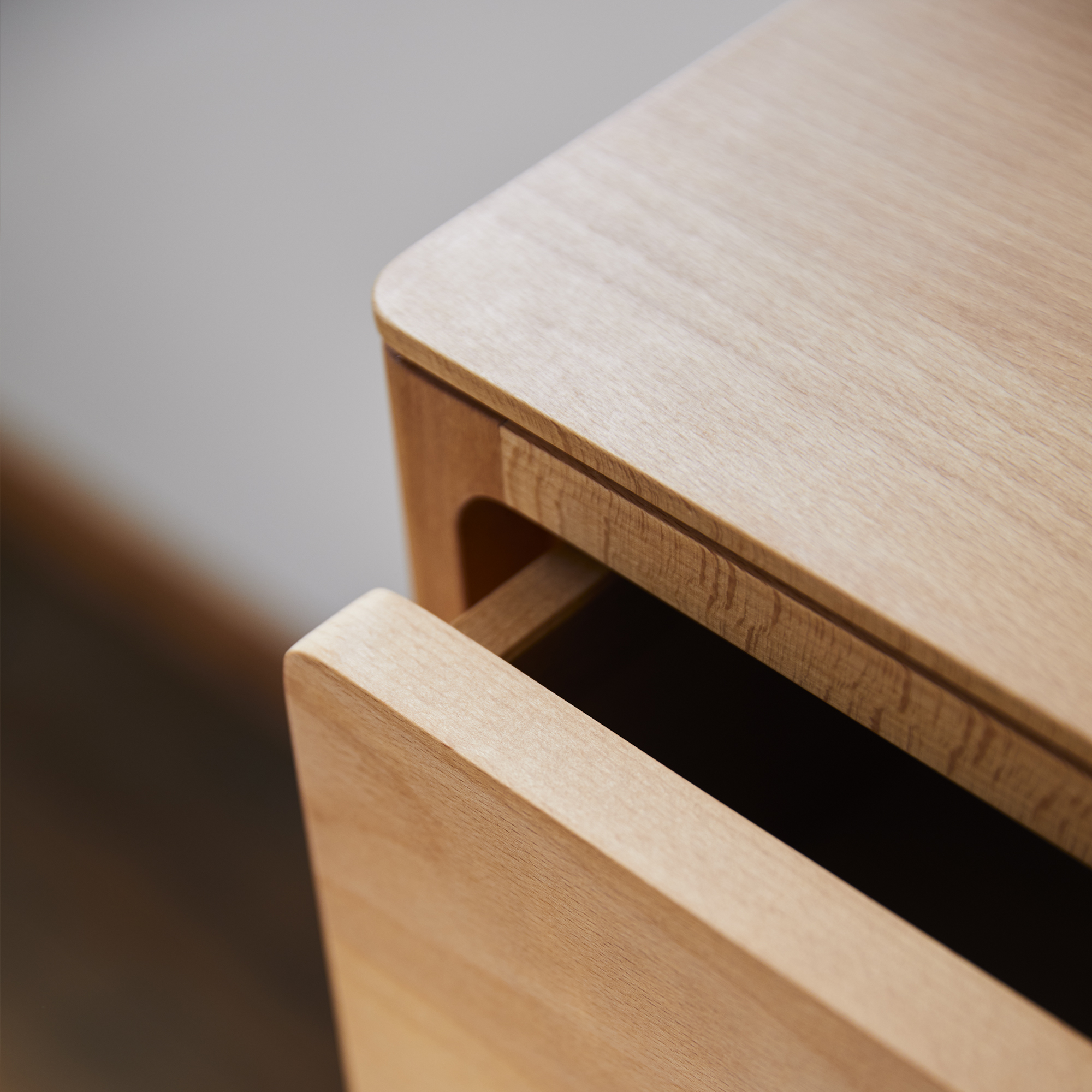 Die Schränke ruhen auf schlanken Füßen, die den Korpus vom Boden abheben und ihn fast schwebend erscheinen lassen. Die ohne Metall- und Kunststoffteile verarbeiteten Laden gleiten auf verschleißarmen Holzleisten aus Esche.