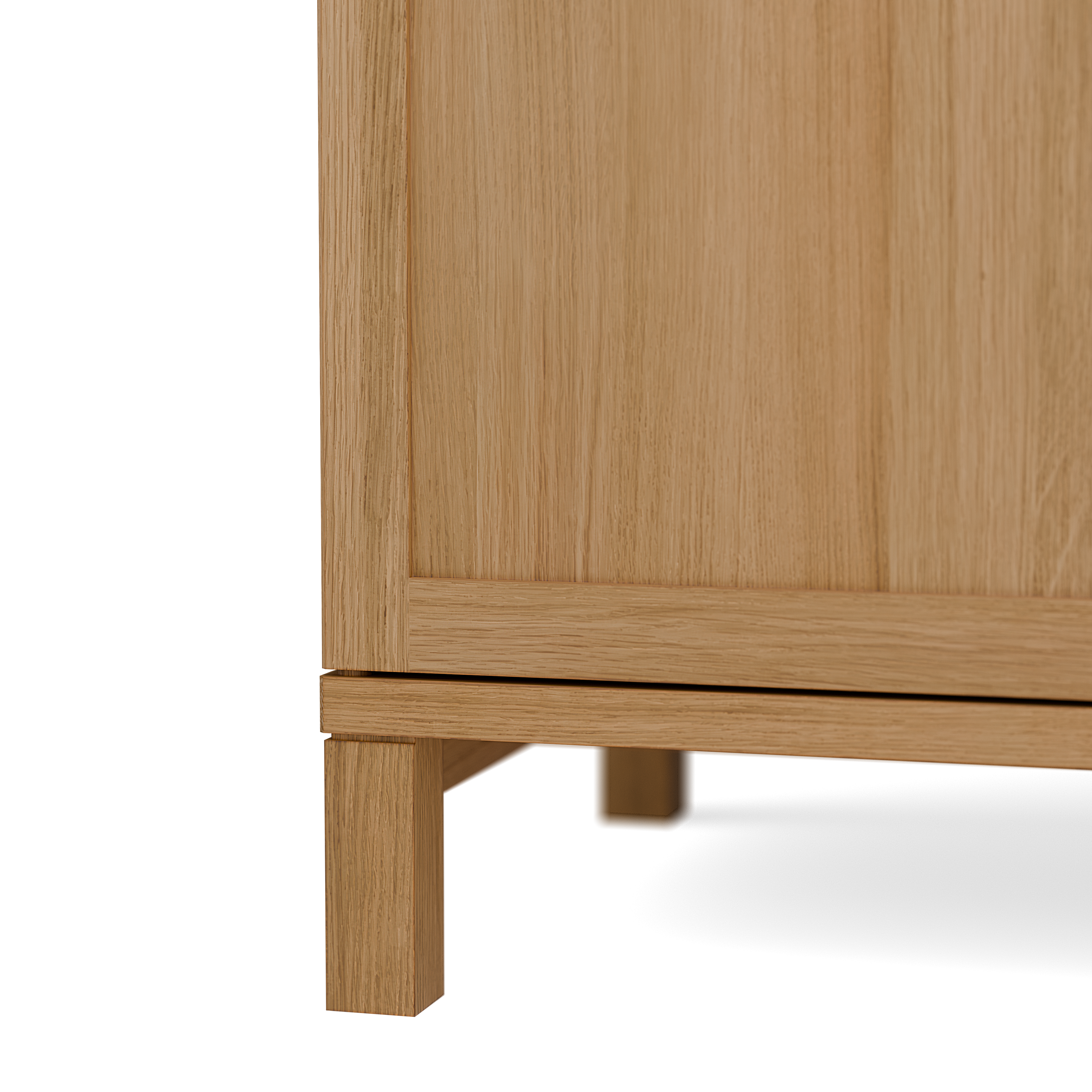 mit Fußgestell (Schrankhöhe H 186,4 cm) Der Korpus dieser Schrankvariante ruht auf einem 15 cm hohen, stabilen, solide verleimten Fußgestell aus Massivholz. Es hebt den Schrank vom Boden ab, macht ihn optisch leicht.