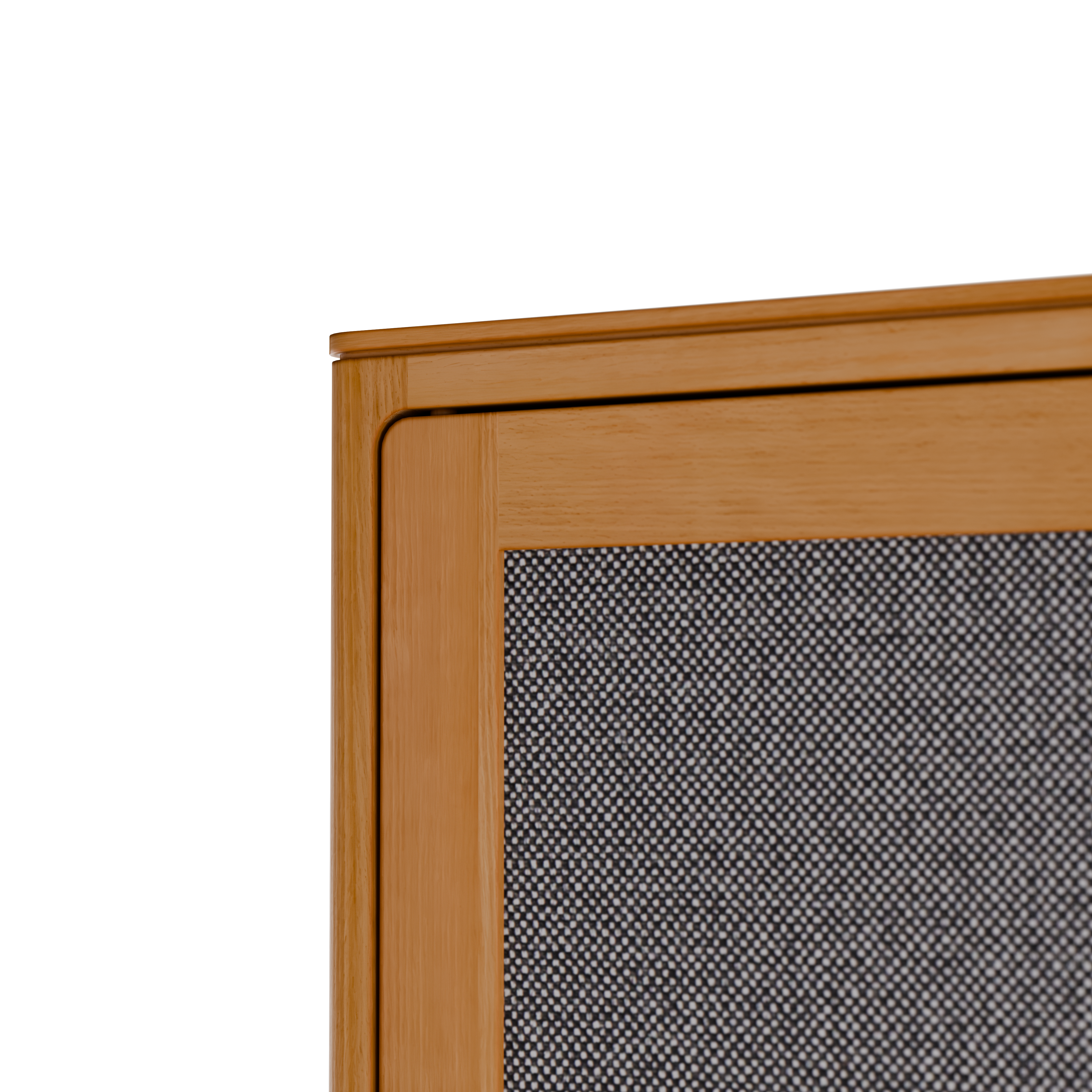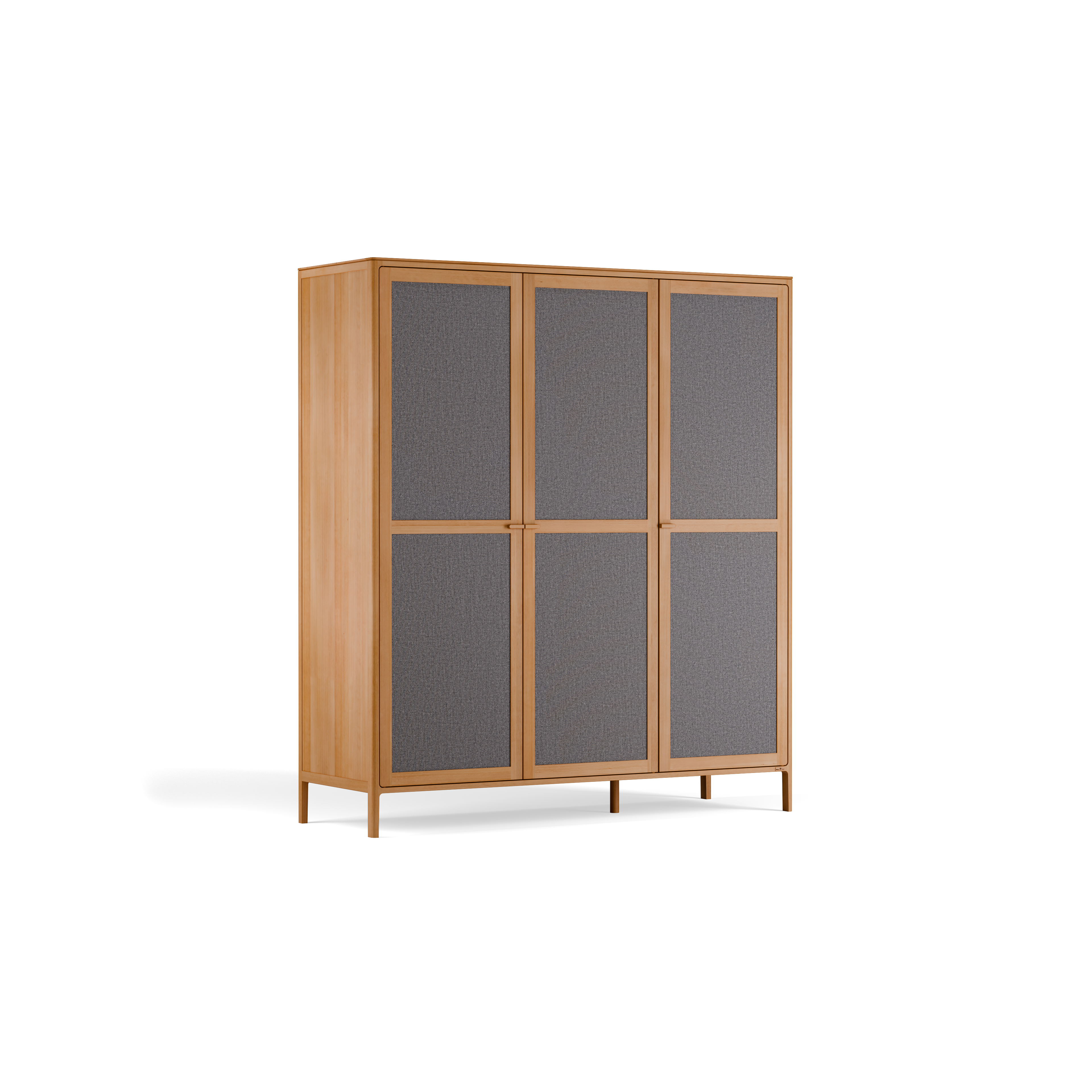 Rahmen und Füße: Massivholz; Holzfüllungen der Türen, sowie Seiten- und Rückwände: verwindungsfestes Schichtholz (Pappel), Deckfurnier in der Holzart des Rahmens; Stofffüllungen: 100 % Schurwolle (Schaf), IVN NATURTEXTIL BEST-zertifiziert.