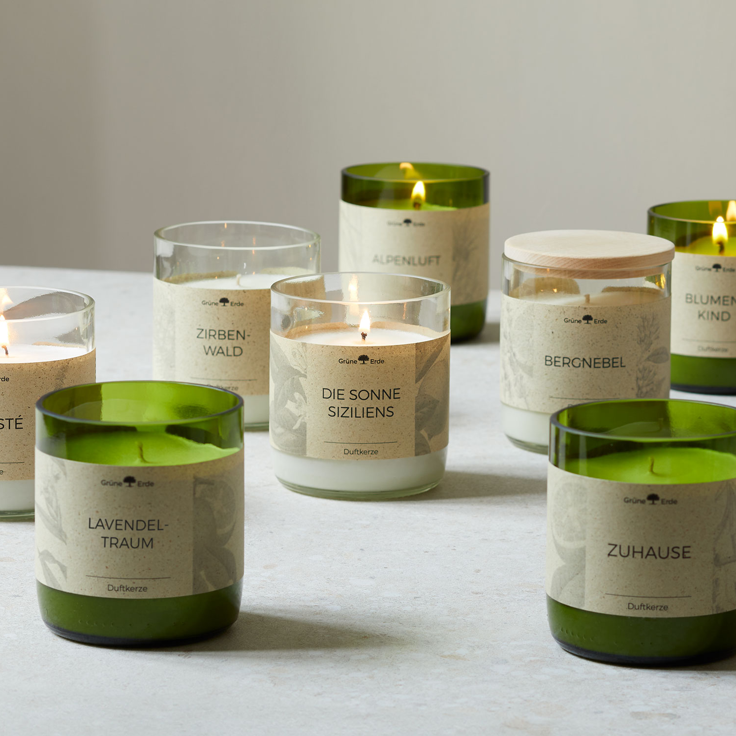 Die Duftkerzen werden in rezyklierte Gläser aus Österreich gegossen. In vielen kleinen Produktionsschritten werden Weinflaschen in besondere Kerzengläser verwandelt. Sie werden sorgfältig gewaschen, geschnitten und die Kanten fein säuberlich geschliffen. Das Glas kann nach Abbrand der Kerze leicht gereinigt und praktisch wiederverwendet werden. Durch unseren dazu erhältlichen Zirbenholzdeckel wird das Glas zu einer Aufbewahrungsdose mit angenehmen Zirbenduft.