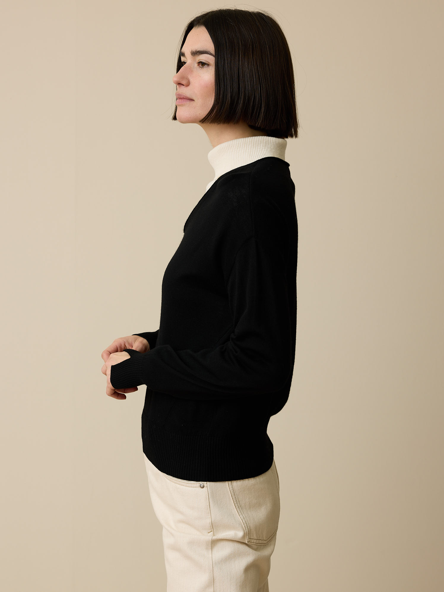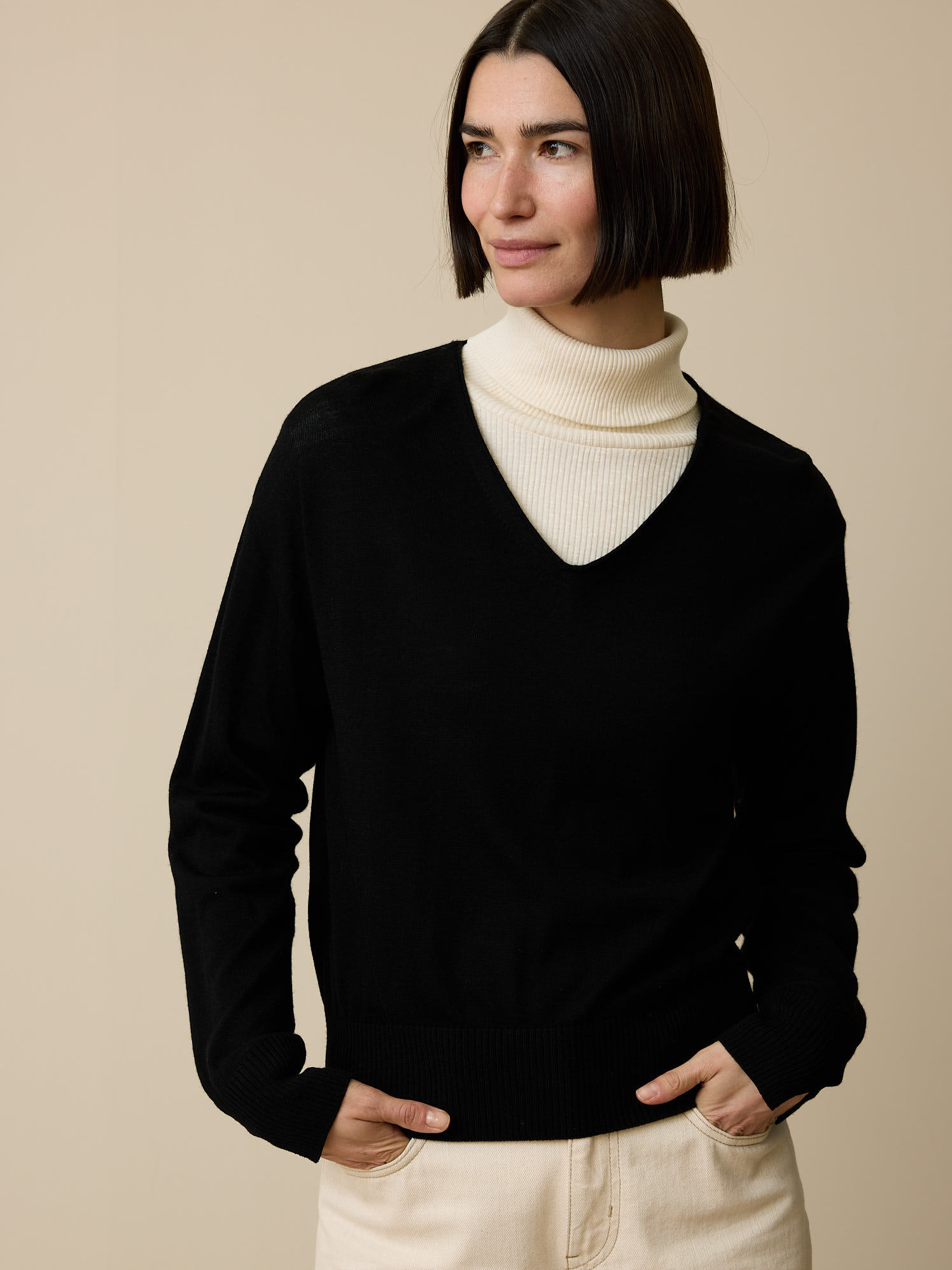 Hochwertiger Feinstrick-Pullover aus wertvoller Schurwolle (Merino): ein absolutes Must-Have für Ihre nachhaltige Garderobe! Die puristische Optik und die legere Silhouette werden mit dezenten Details abgerundet. Der V-Ausschnitt mit feiner Rollkante, das hohe Rippbündchen am Saum und Ärmelsaum treten in den Vordergrund. Weitere Details des fully-fashioned gefertigten Modells: Seitenschlitze am Ärmelsaum.