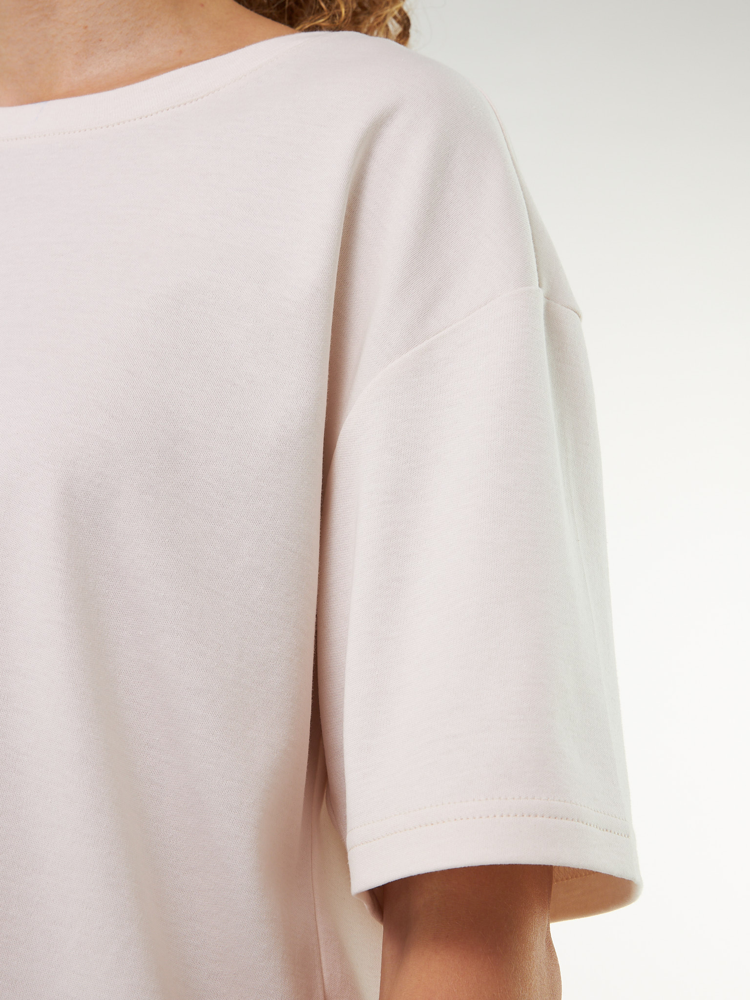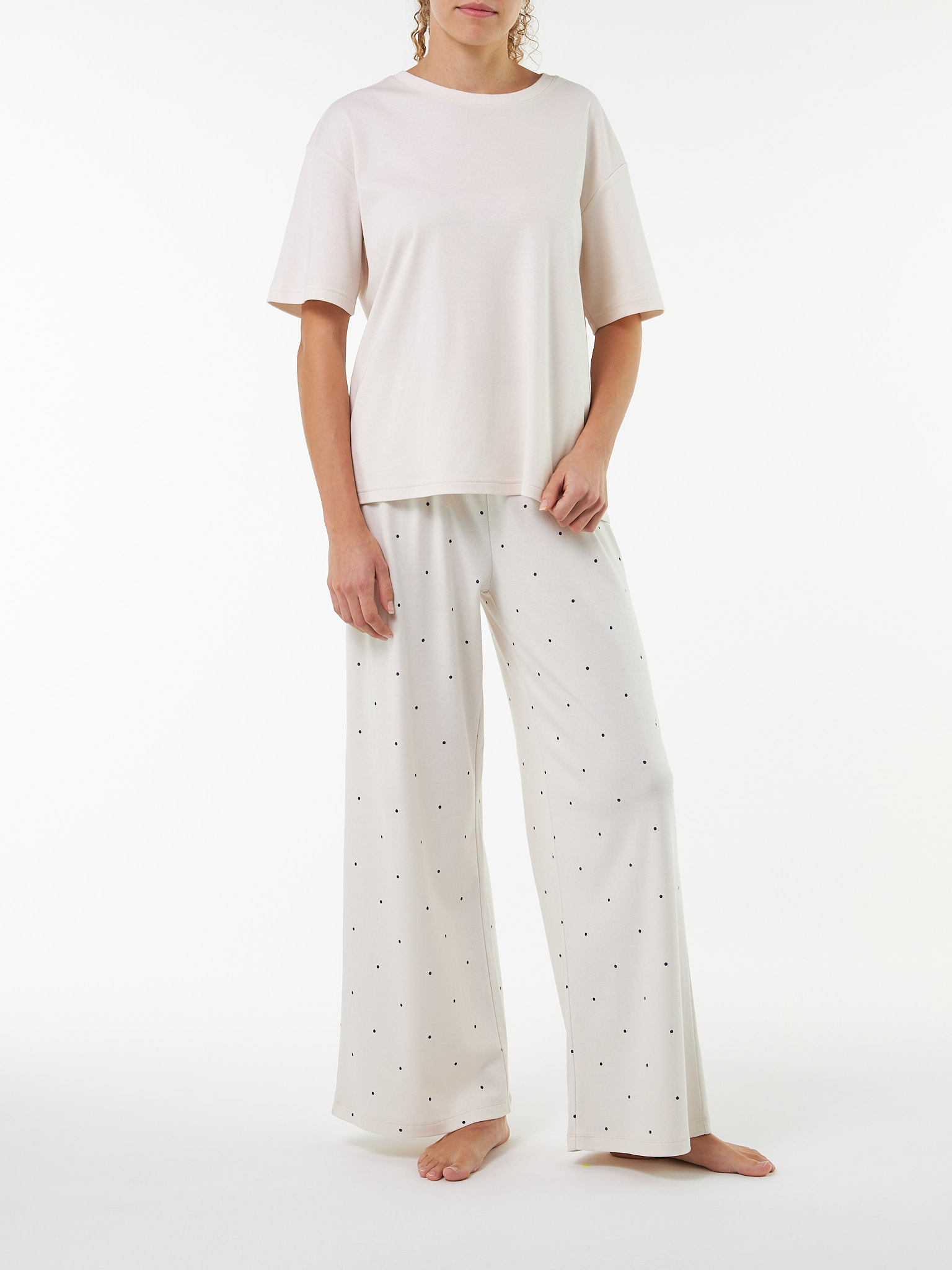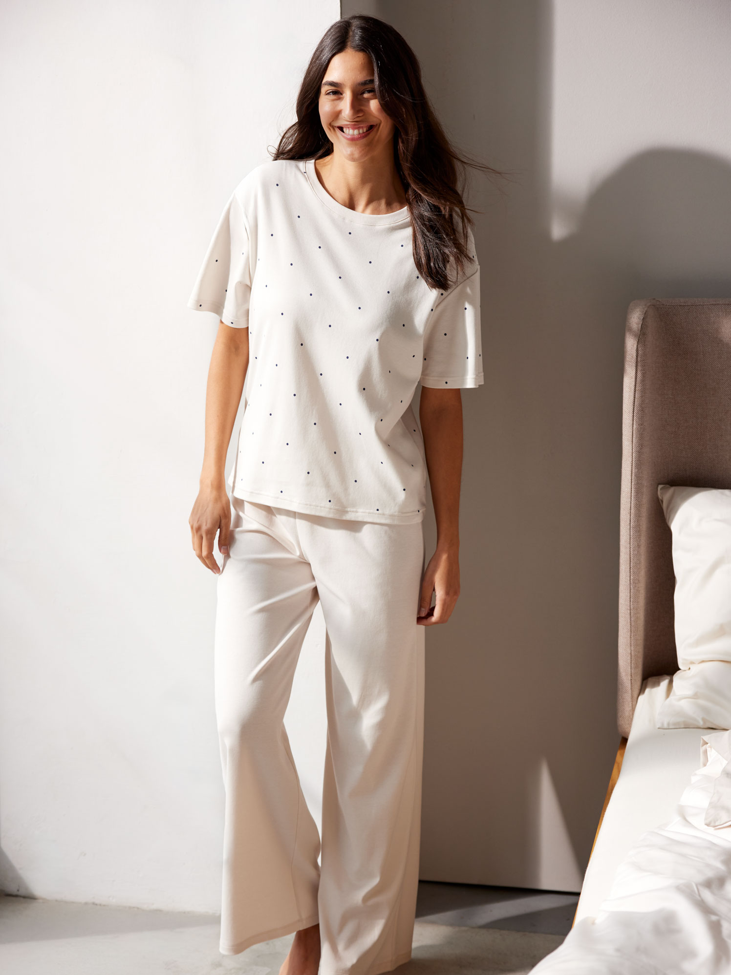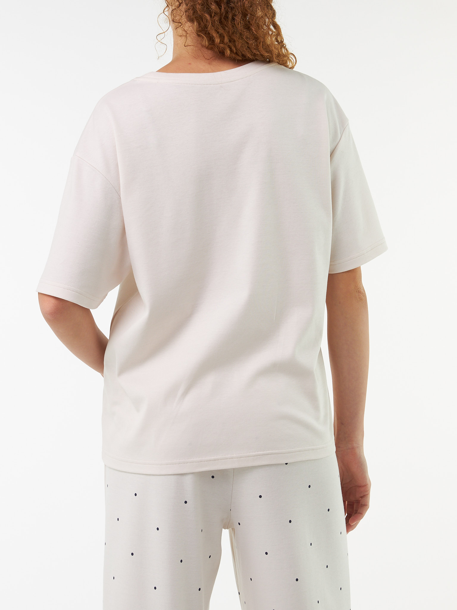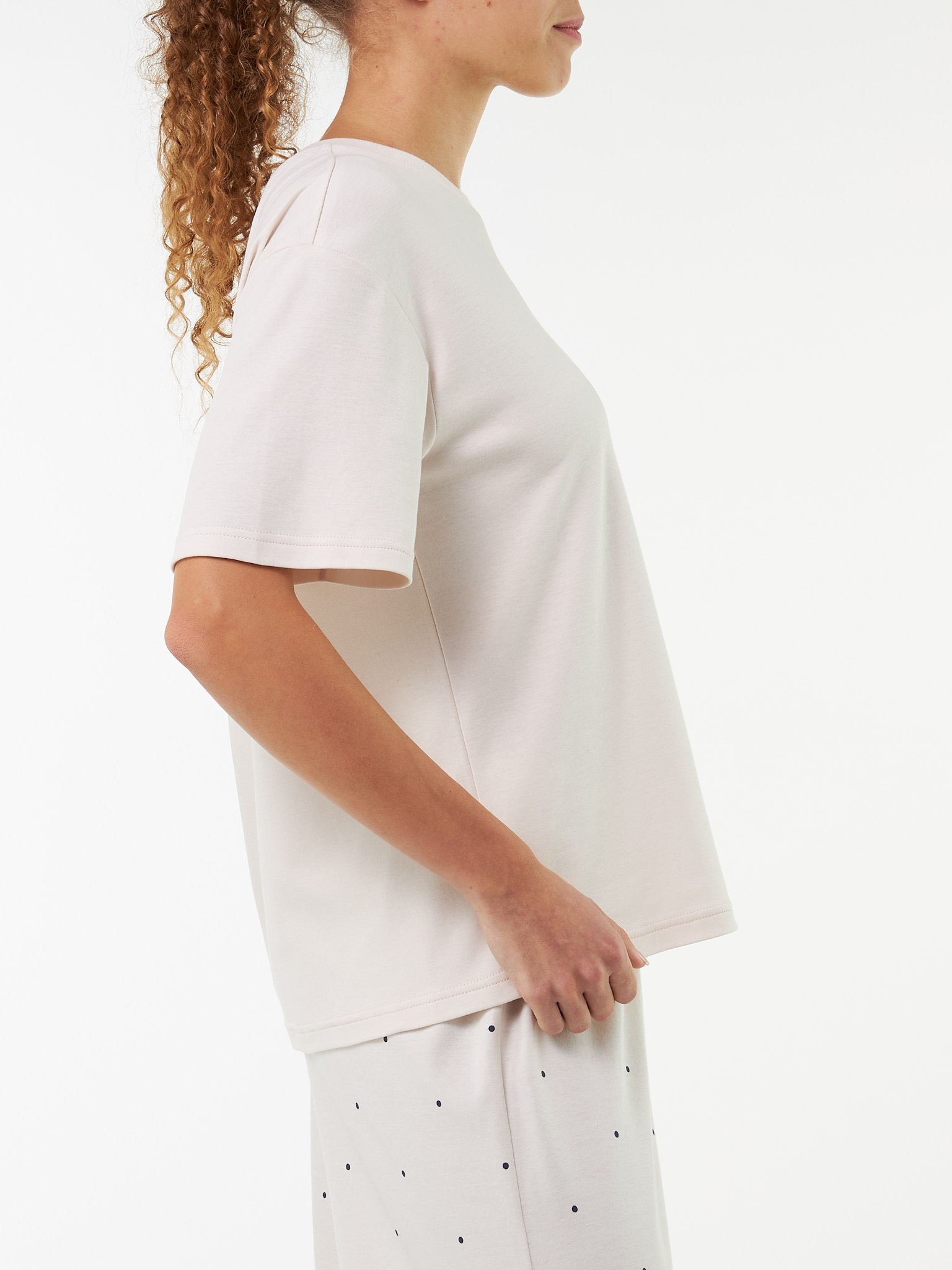 Kurzarm-Schlafshirt aus reiner Baumwolle in hochwertiger Interlock-Qualität – wunderbar weich im Griff, atmungsaktiv und angenehm auf der Haut. Die lockere, leicht oversize geschnittene Passform sorgt ein entspanntes Tragegefühl und ein angenehm-leichtes Gefühl auf der Haut. Schlicht und zeitlos als Uni-Variante oder mit feiner Punkte-Dessinierung garantiert dieses vielseitige Basic erholsame Nächte und gemütliche Stunden.