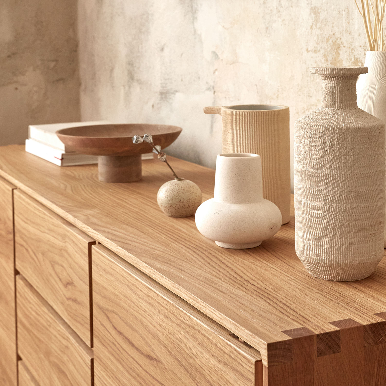 Eine Kollektion von schönen, handwerklich gefertigten Schränken für große und kleine Dinge, für wichtige, belanglose, kostbare, nützliche und ergötzliche. Markantes Designelement von Tesoro sind Schattenfugen, die auch die Griffrillen beinahe unsichtbar integrieren. So entsteht ein kontrastreicher Raster, der die ebenmäßige Front der Wohnschränke reizvoll strukturiert.