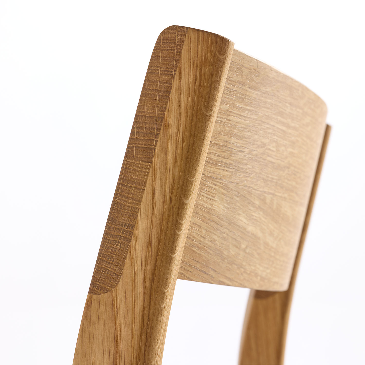 Die beiden nach hinten geneigten Holme und die rückengerecht geformte Lehne sind "überblattet", ebenso die Stuhlbeine und deren Verbindungssprossen: eine feinsinnige, metallfreie Holzfügetechnik.
