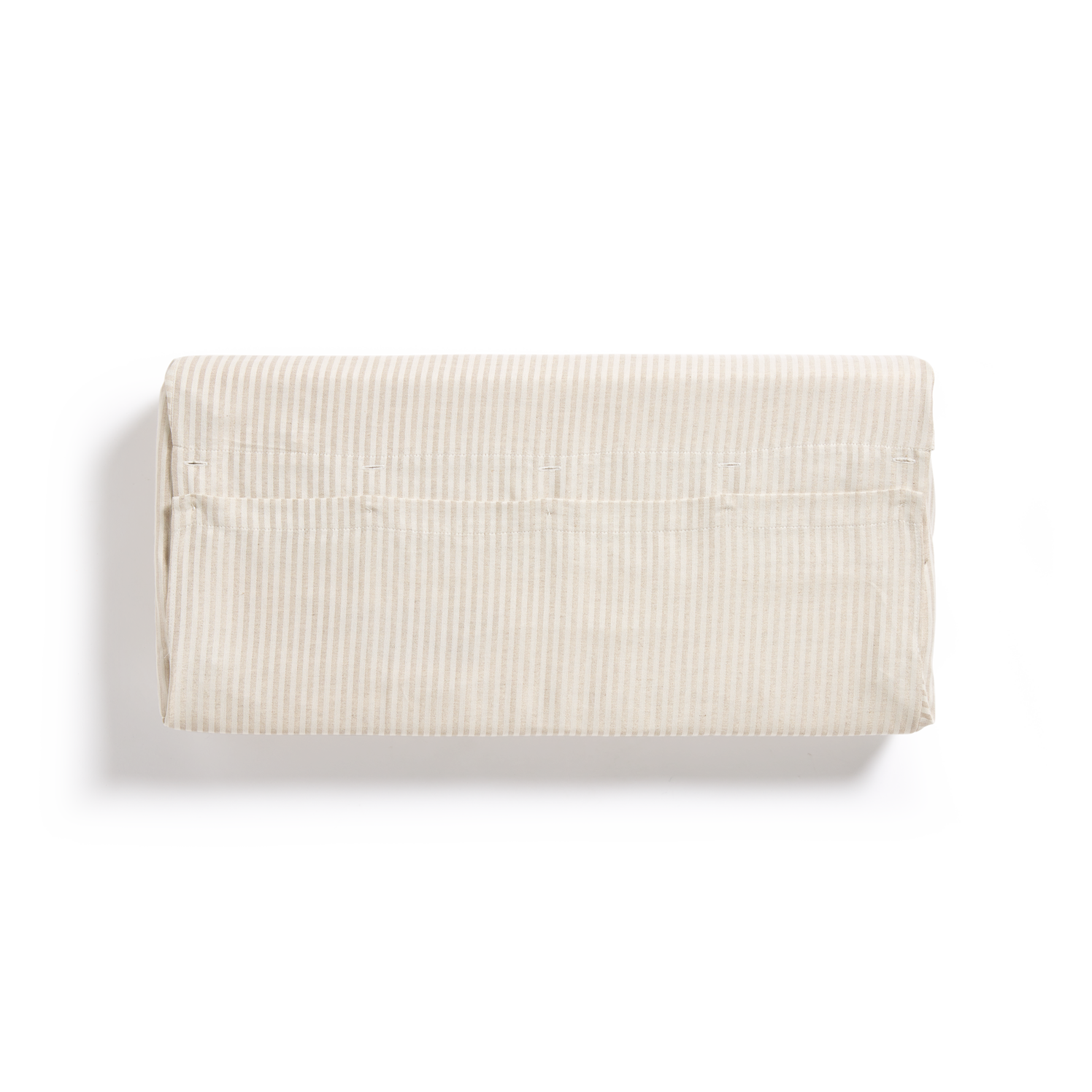 Mit einer verstellbaren Knopfleiste lässt sich der Überzug an die jeweilige Höhe des nach persönlichen Vorlieben konfigurierbaren Nackenstützkissens anpassen, sodass er immer gut sitzt. Hochwertiges Gewebe in aufwendiger Jacquard-Bindung, naturfarben gestreift, sorgfältig verarbeitet, angenehm auf der Haut, luftig und feuchtigkeitsregulierend.