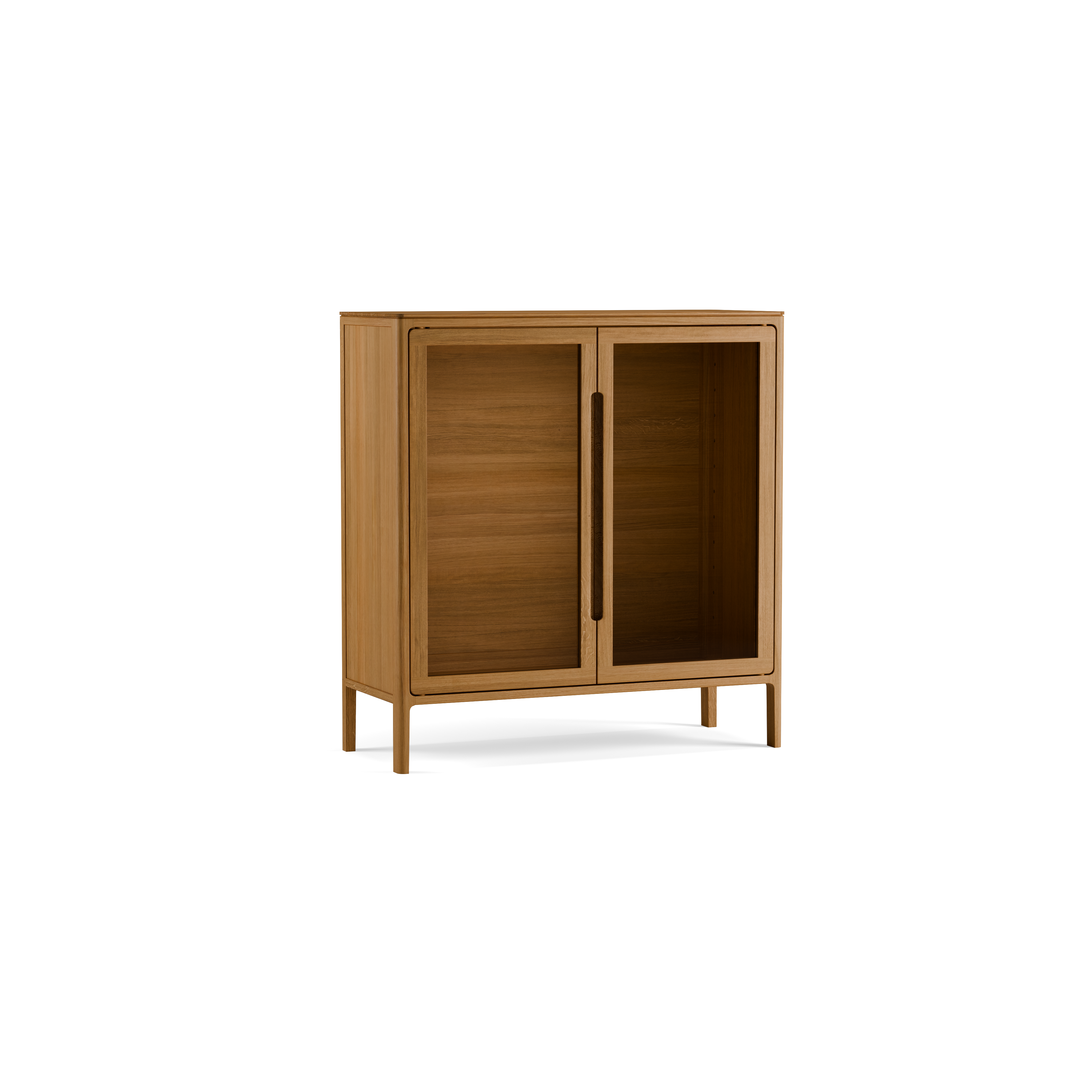 Bei der Vitrine Tenso können Sie die Türfüllungen nicht nur aus Holz, sondern auch aus braun getöntem, bei Bedarf auswechselbarem Glas wählen.