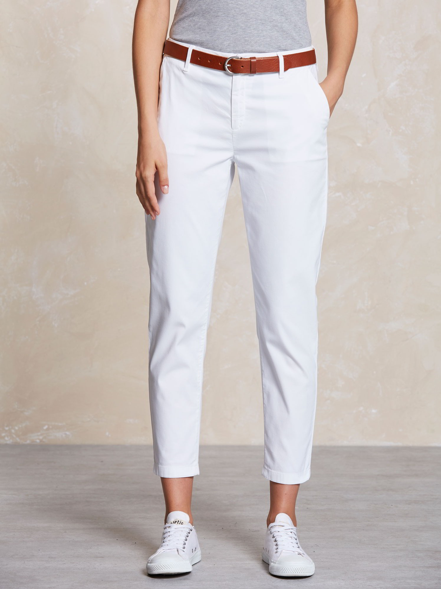 Zart, leicht und luftig. So sollte sich eine Hose für die warme Jahreszeit anfühlen. Diese Chino aus Bio-Baumwolle und einem geringen Anteil an Elasthan eignet sich ideal und wirkt zudem stilsicher und zeitlos. Details: am Bund mit Gürtelschlaufen, Reißverschluss und Knopfverschluss. Vorne mit zwei seitlichen Eingriffstaschen und hinten mit zwei Leistentaschen versehen. Die Hose mit reduzierter Leibhöhe sitzt locker und ist im Schritt etwas vertieft.Schnitt: schmal/knöchellang. Innenbeinlänge in Gr. 36 ca. 71 cm.Verarbeitung: 97 % Baumwolle, 3 % Elasthan. Baumwolle kbA aus der Türkei. Gewebt in der Türkei. Fair gefertigt in der Türkei nach dem GOTS. -