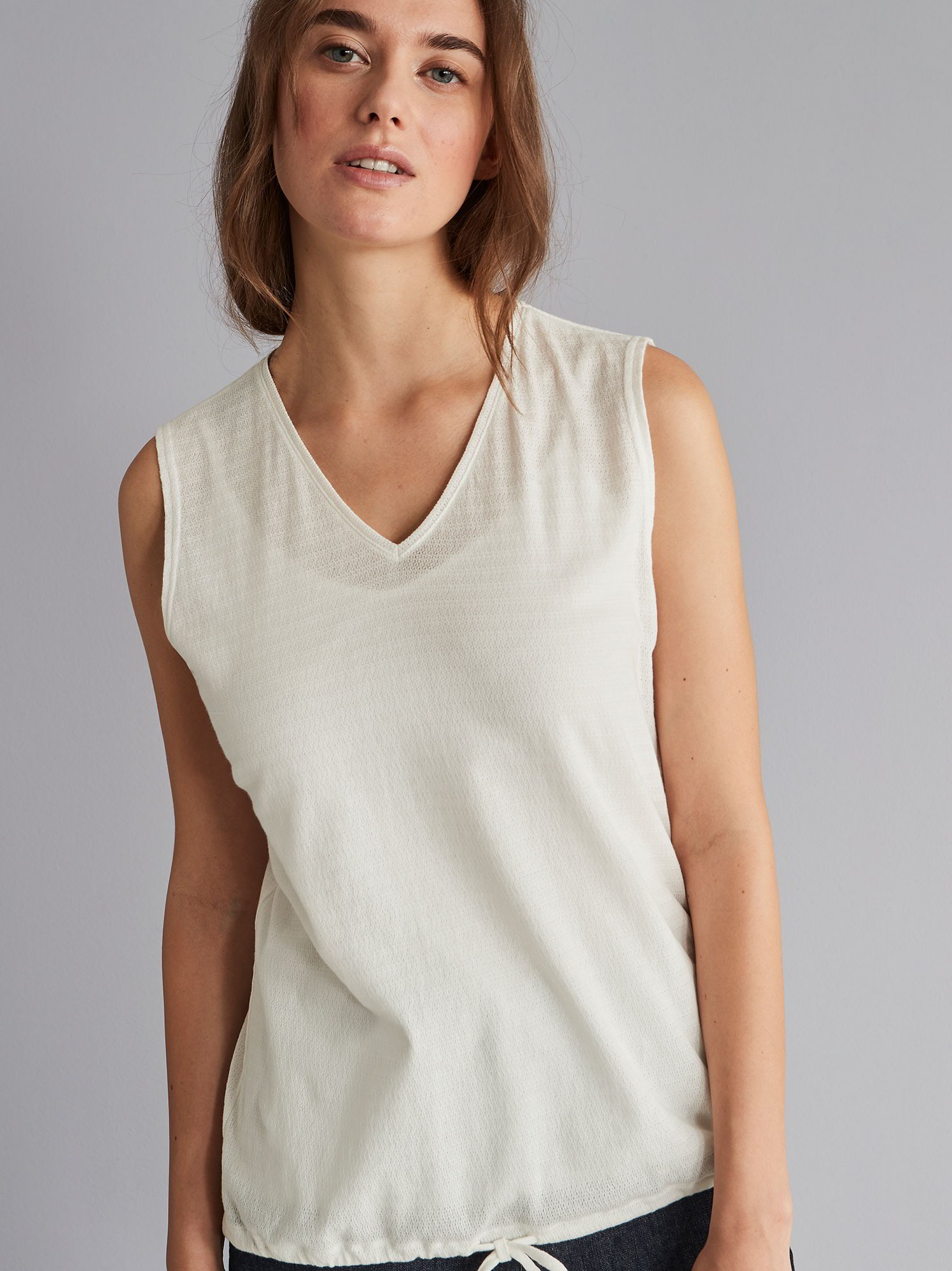 Ein beliebtes Basic-Kleidungsstück: zeitlos, gemütlich und anschmiegsam. Das Shirt entsteht aus weicher Bio-Baumwolle und wird bei unserem Partnerbetrieb nach dem strengen Global Organic Textile Standard gefertigt und zertifiziert. Es hat einen angenehmen Griff, ist leicht und sorgt für ein angenehmes Tragegefühl. Das Shirt ohne Ärmel hat einen V-Ausschnitt sowie einen Tunnelzug am Saum mit Zugbändchen. Das Besondere: die zart-transparente Struktur. Wir empfehlen das Shirt in Kombination mit einem Top.Schnitt: leger. In Größe 36 ca. 64 cm lang.Verarbeitung: 100 % Baumwolle. Baumwolle kbA aus der Türkei. Gewirkt in Griechenland. Fair gefertigt in der Republik Nordmazedonien nach dem GOTS. -