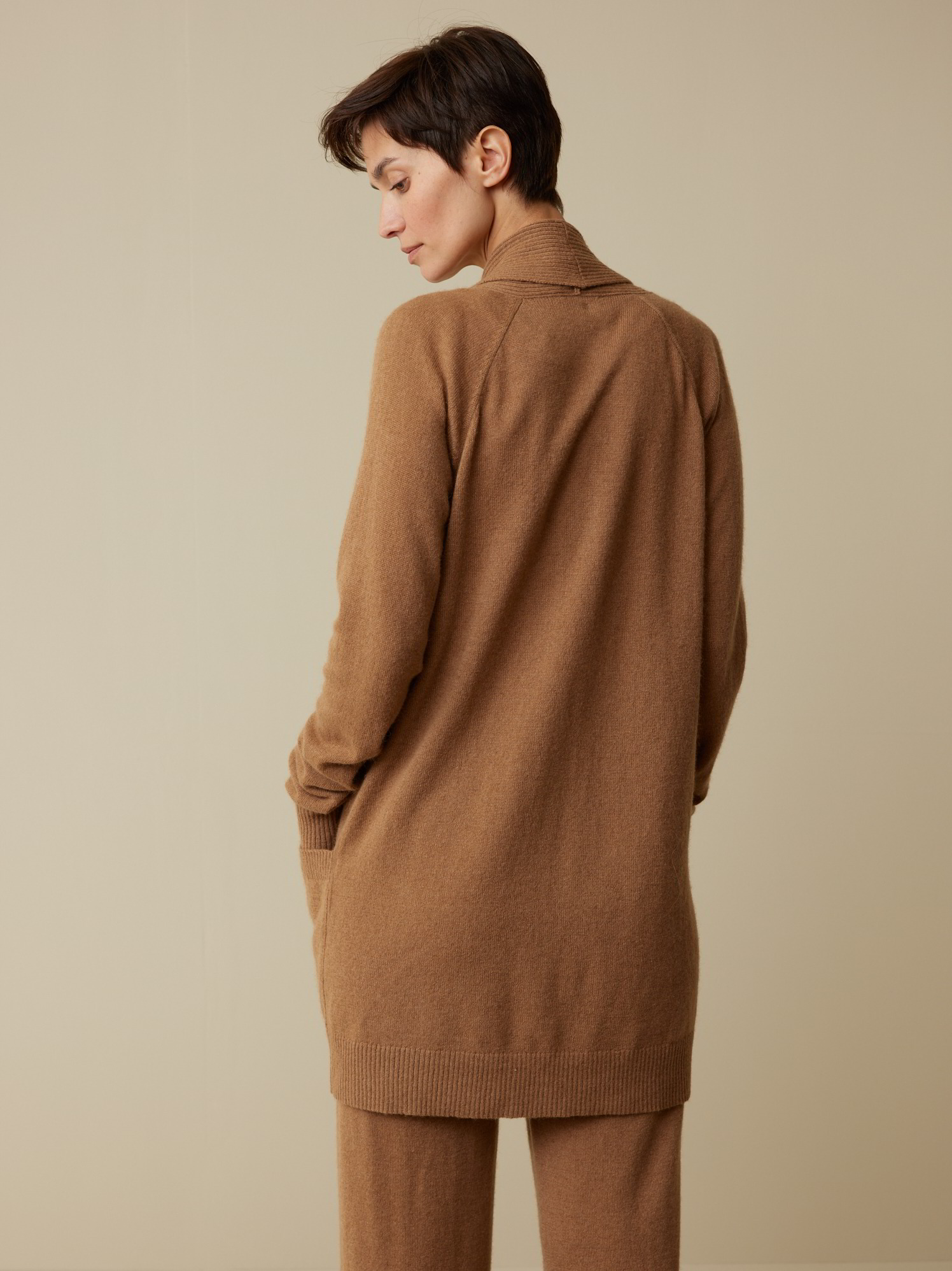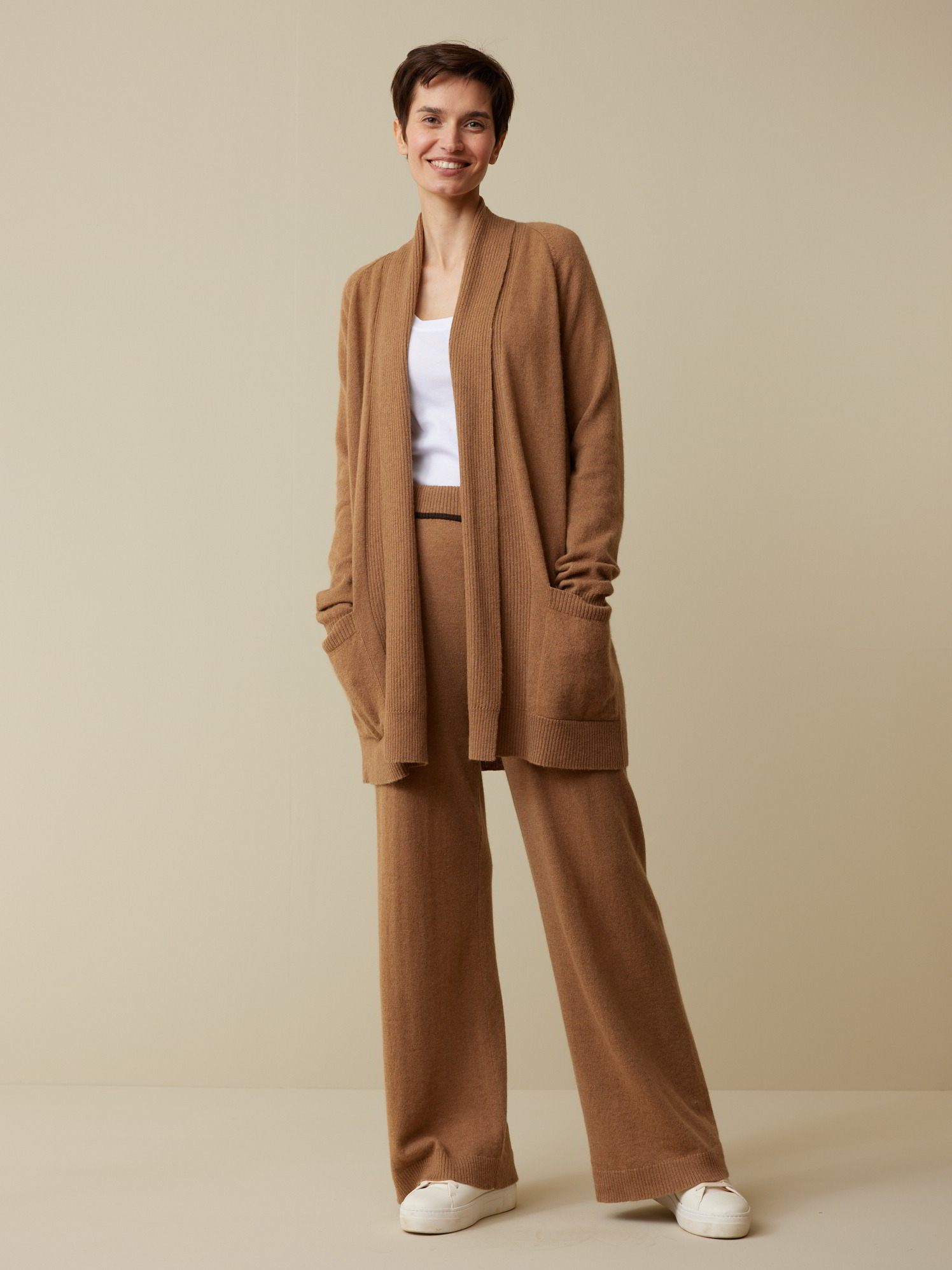 Pure Eleganz dank unverfälschter NaturVerspricht höchsten Wohlfühl-Komfort: Strickjacke aus ungefärbtem Kamelhaar. Das Modell besticht mit seiner Haptik als auch optisch. Die weiche Strick-Qualität, die langen Raglanärmeln, die aufgesetzten Taschen und der Rippabschluss an Hals-, Ärmel- und Saumabschluss auf der Vorderseite machen den Überwurf zu einem Lieblingsteil Ihrer nachhaltigen Capsule Wardrobe. Mit der Hose aus Kamelhaar eine weiche Kombi für zuhause oder unterwegs.Schnitt: leger. In Größe S (36/38) ca. 79 cm lang. Unsere Models sind zwischen 175 cm und 177 cm groß und tragen Kleidergröße S.Ökologisch & fair produziertEin schönes Stück Natur, welches wir nur zu gern tragen. Dieses Kleidungsstück entsteht aus kostbarem Kamelhaar und wird in größter ökologischer Sorgfalt bei unserem Partnerbetrieb gefertigt. Die gesamte Wertschöpfung bleibt im Land der Rohfaser – fair gegenüber Mensch, Tier und Natur. Um die Langlebigkeit des Naturproduktes zu erhalten, empfehlen wir einen sorgsamen und wertschätzenden Umgang im alltäglichen Gebrauch.Material: 100 % Kamelhaar.Materialherkunft: Kamelhaar aus der Mongolei. Gestrickt in der Mongolei. Gefertigt in der Mongolei. -