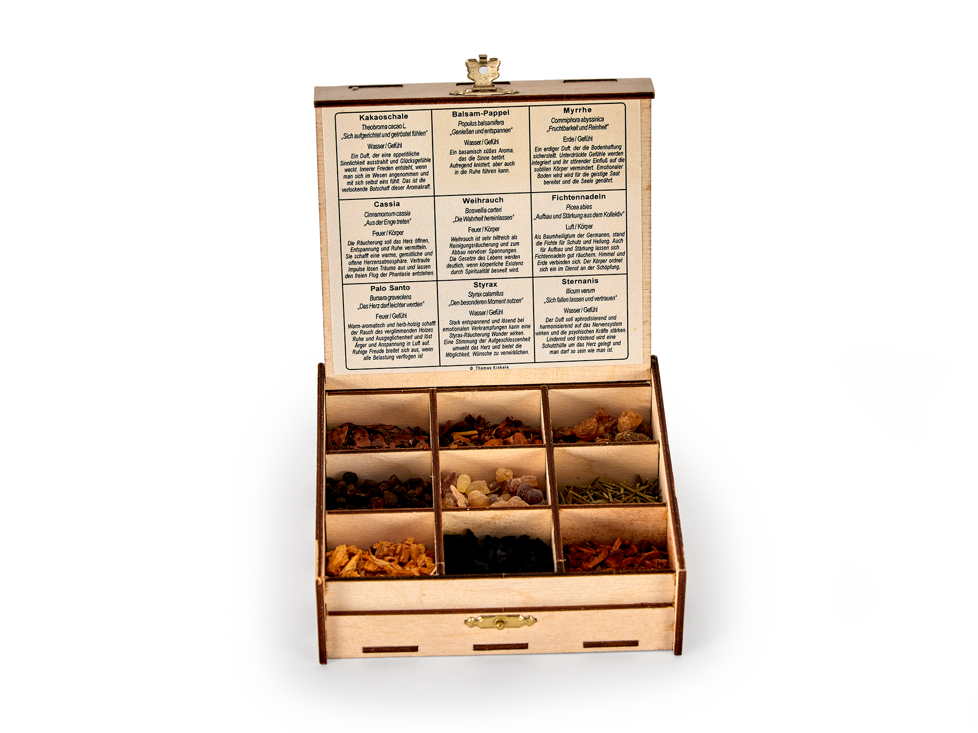 Dieses Kistchen sieht toll aus und wenn man es öffnet befinden sich 9 verschiedene Räucherprodukte mit einer sehr guten Beschreibung dazu im inneren. Mit dem Räucherofen zusammen erfüllen die Produkte einen herrlichen Duft über einen großen Raum.