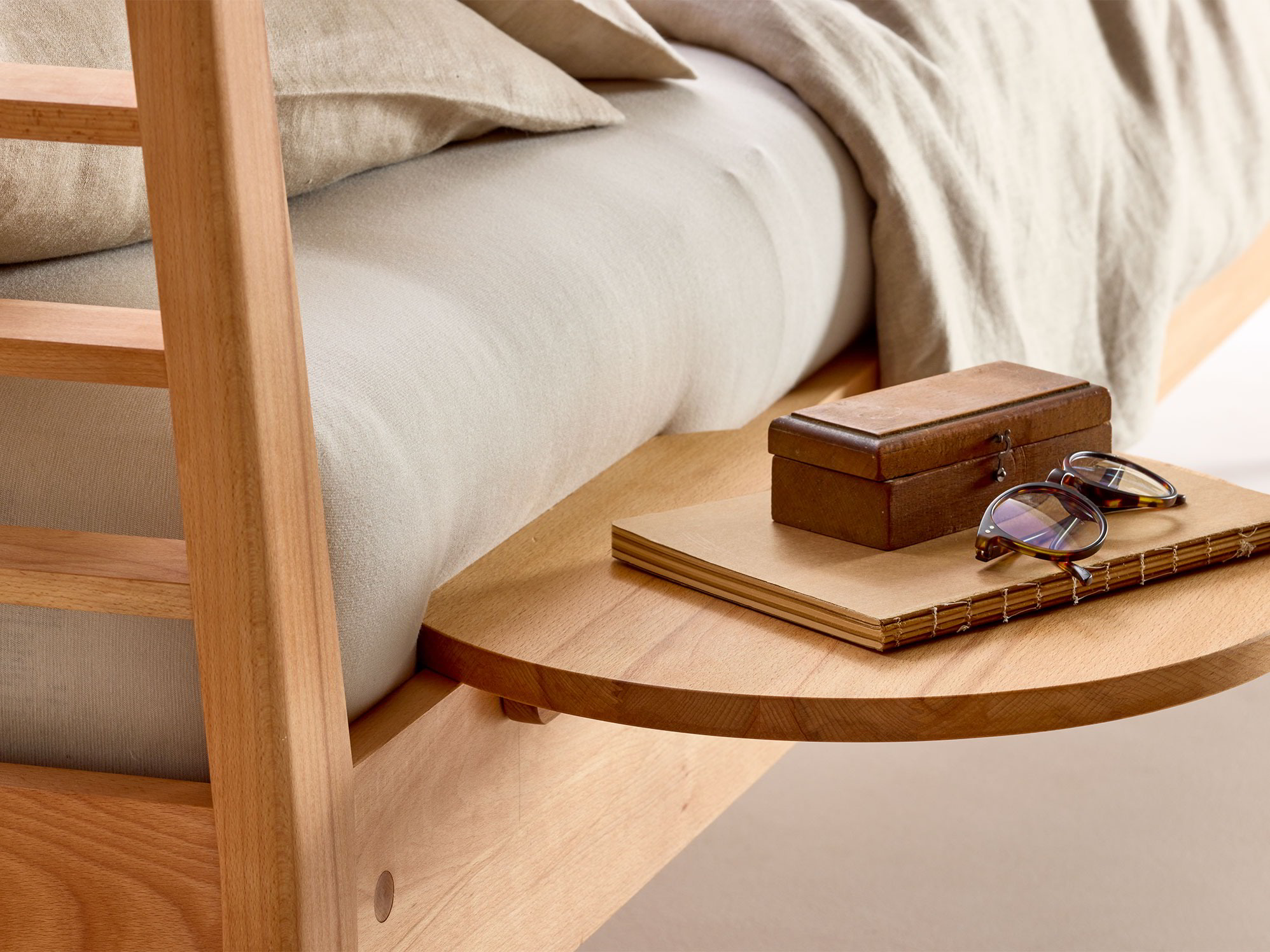 Das Ablageboard für diverse Betten wird aus Vollholz aus nachhaltig bewirtschafteten Wäldern gefertigt.-