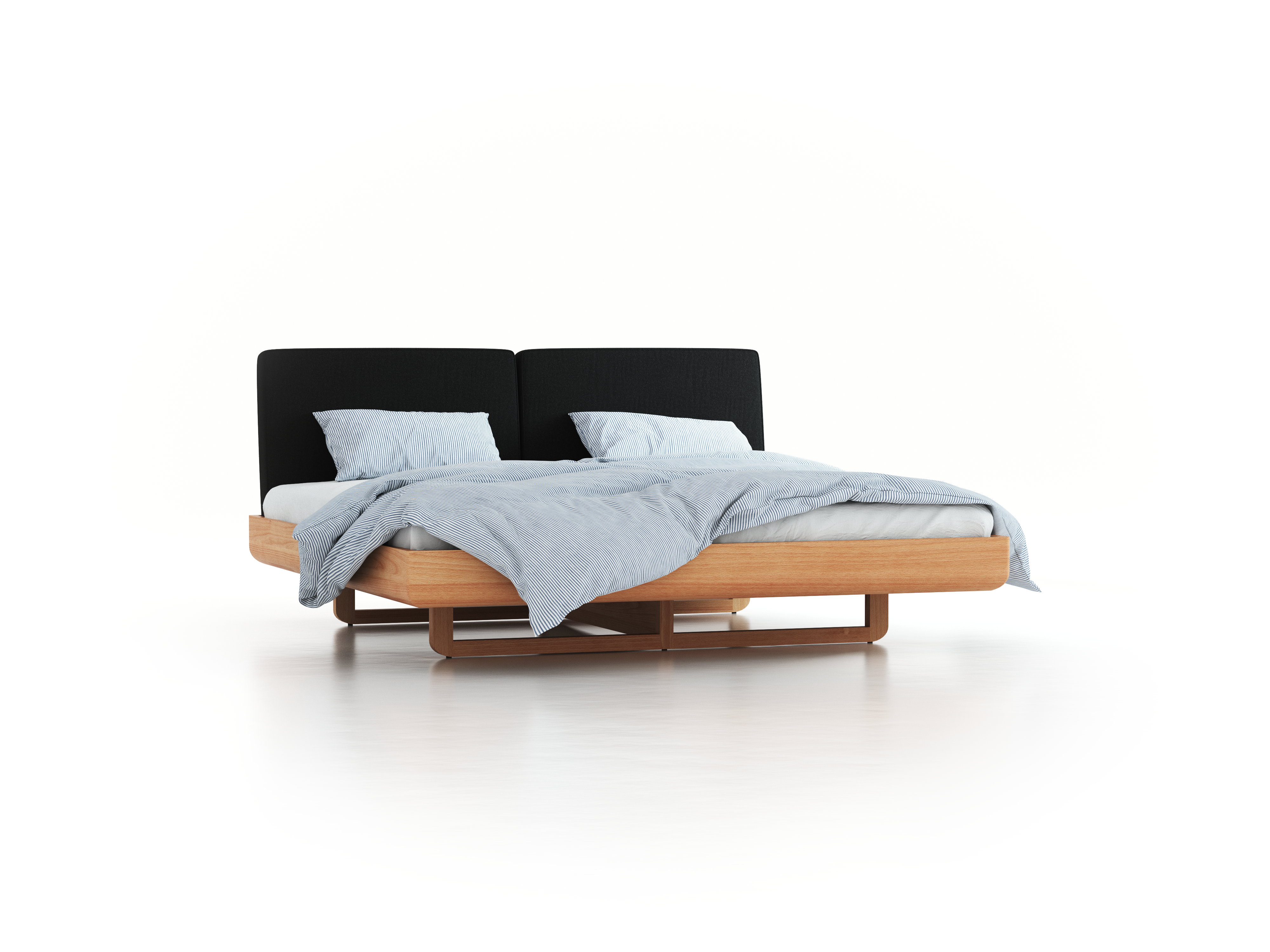 Die beiden nach innen versetzten, kaum sichtbaren, kufenförmigen Fußgestelle und das abgerundete Profil des Bettrahmens verleihen Almara eine abgehobene, schwebende Anmutung. Es ist unser bequemstes Bett. Das liegt auch an den großzügen Polsterbetthäuptern, die so komfortabel gefertigt sind wie unsere Sofas und Matratzen: kleiner betriebsinterner Know-how-