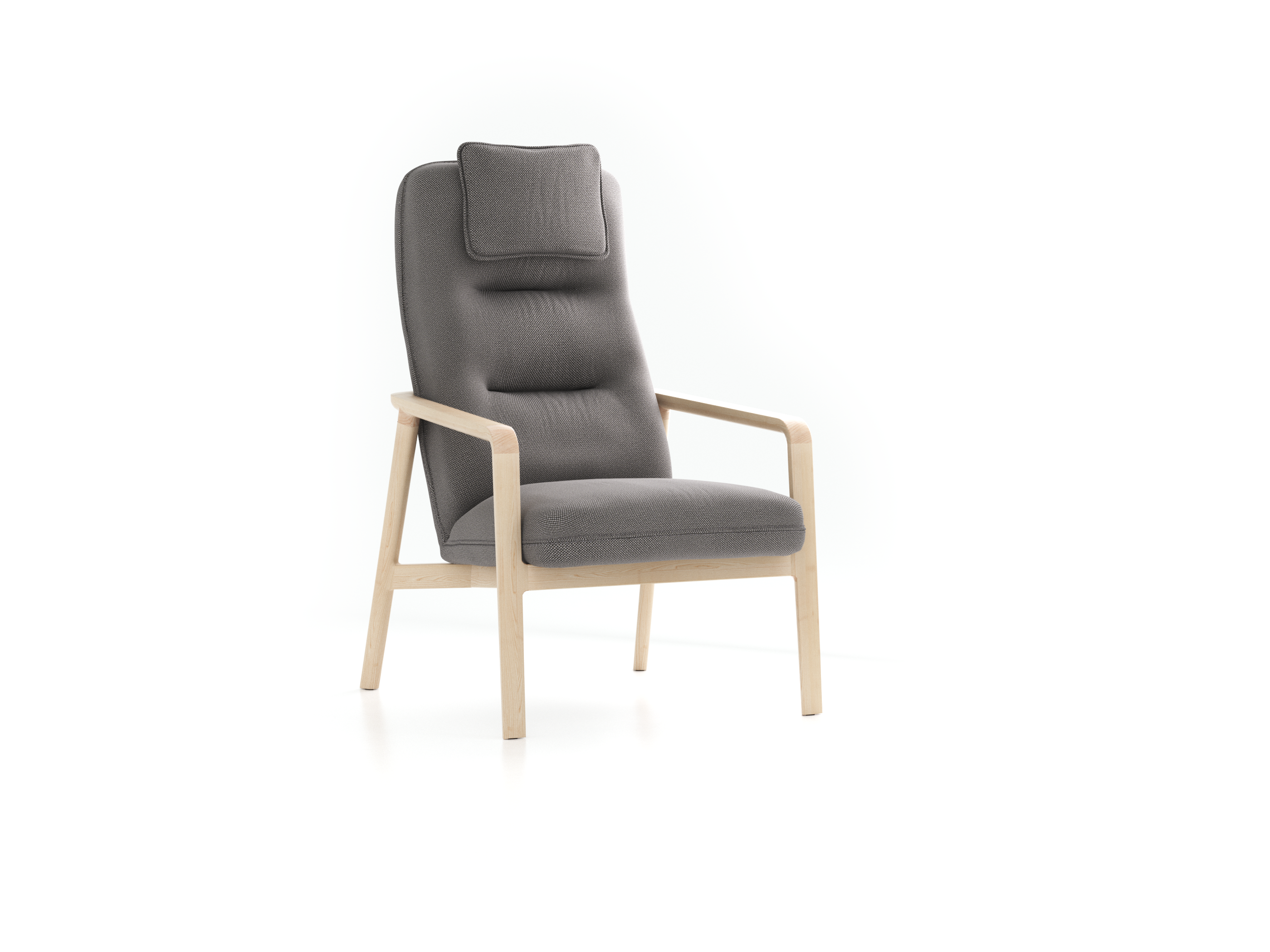 Ketil will seinen "Besitzern" nicht nur gefallen, sondern ihnen vor allem auch das Sitzen so bequem wie möglich machen. Der Hochlehner fordert unverblümt zur Muße, zur Siesta, zum Lesen, zum bewussten Nichtstun auf. Er ist eine Synthese aus außergewöhnlich gutem Sitzkomfort, hoch entwickelter Massivholztischlerei und Möbeltapeziererei.Das elegante, leichte Sichtholzgestell nimmt die Polsterung auf und läuft in einem kühnen Schwung um deren Rückseite herum. Die gerundeten Holme sind aus massivem Holz aufwendig gefräst. Die sanften Übergänge zwischen Lehne und Beinen wirken organisch fließend.Die ergonomisch optimal gewählten Winkel der Polsterung sorgen für eine bequeme Sitzposition – auch über lange Zeit hinweg. Der hohe, im oberen Bereich angewinkelte Rückenpolster ist durch zwei Einzüge gegliedert: Der untere unterstützt die Lendenwirbelsäule, der obere den Nacken. Das höhenverstellbare Nackenkissen rundet den Komfort ab. Ergebnis: Freiwillig erhebt man sich aus diesem Polstersessel nie wieder ...Wir polstern Ketil in unserer oberösterreichischen Werkstätte mit Schafschurwolle, Naturlatex und Kokoslatex, verstärkt durch ein Geflecht aus Leinenguten.Für den mit dekorativen Nähten sauber verarbeiteten, straff sitzenden Bezug stehen verschiedene IVN NATURTEXTIL BEST-zertifizierte Möbelstoffe zur Wahl.Als formal und ergonomisch sinnvolle Ergänzung zu diesem Hochlehner empfehlen wir den Hocker Ketil – zum Hochlegen der Beine. -