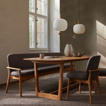 Auf dem optisch schlanken, dabei konstruktiv robusten Unterbau des Tisches ruht die großzügige, 2,5 cm starke Massivholzplatte – weit über das Beingestell hinausragend. Verstärkt wird der beeindruckende Auftritt von Kilian durch die leicht nach außen gewölbte organische Form der Tischplatte und deren in großem Radius abgerundete Ecken.