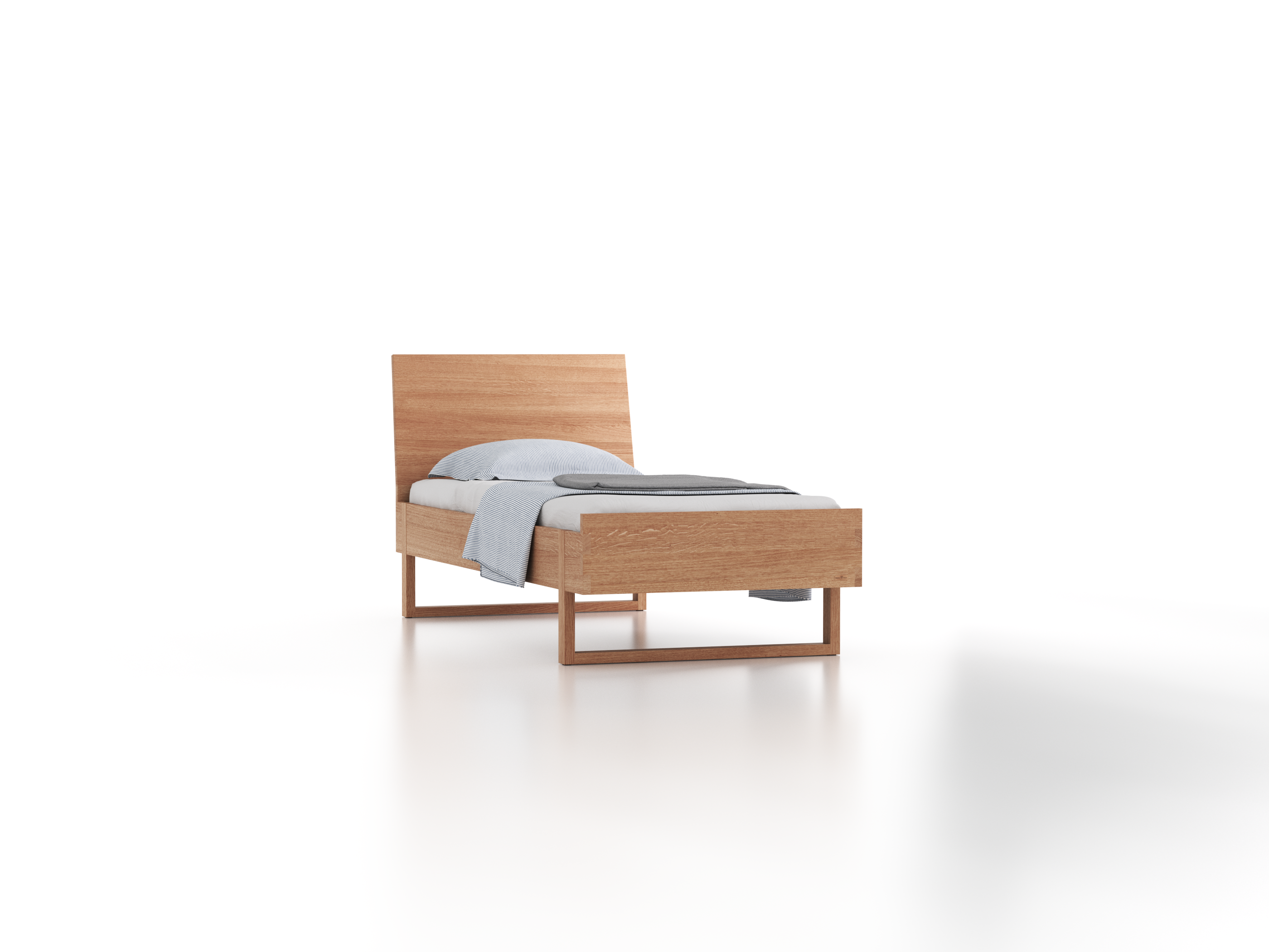 Vor allem in Zirbe ausgeführt, verlangt Akato aufgrund der lebendigen Maserung dieser Holzart nach einfachen, klaren Formen. Die beiden kufenartigen Fußgestelle sind etwas nach innen versetzt und geben dem Bett eine optisch leichte, beinahe schwebende Anmutung. Seitlich hochgezogen, wandeln sich diese Kufen zu sichtbaren Gestaltungselementen, die den robusten Bettrahmen optisch gliedern.
