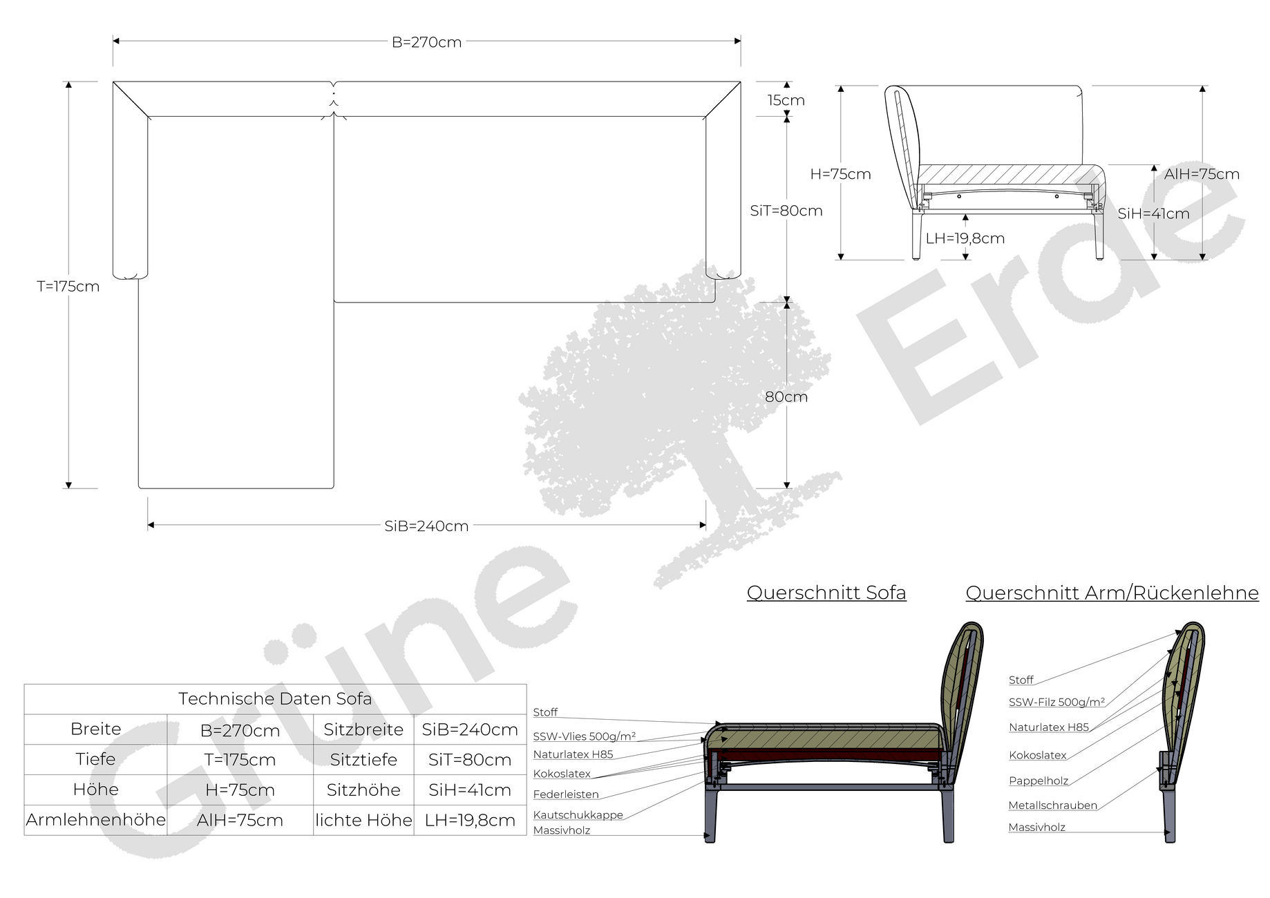 Das Lounge-Sofa besteht aus einem Sitz- und einem Liegeteil. Beide werden mithilfe von ebenso ausgetüftelten wie einfachen, ganz in Holz ausgeführten Verbindungselementen an der Unterseite des Möbels fest zusammengefügt. Diese sind mit wenigen Handgriffen montier- und wieder lösbar.Der solide Unterbau wird in unserer Tischlerei in Kärnten aus hochwertigem, europäischem Vollholz handwerklich gefertigt und mit natürlichem Pflegeöl eingelassen. Auf diesem Unterbau ruht eine bettrahmenähnliche Konstruktion mit einem Lattenrost. Dessen elastische Federleisten aus Buchenschichtholz tragen die Naturfaserpolsterung.Die Sofa-Füße sind an der Unterseite mit fußbodenschonenden Filzgleitern ausgestattet.